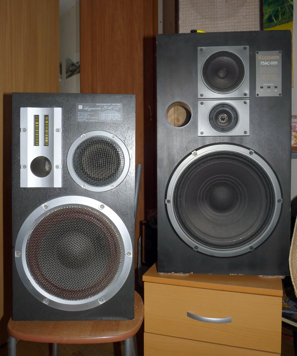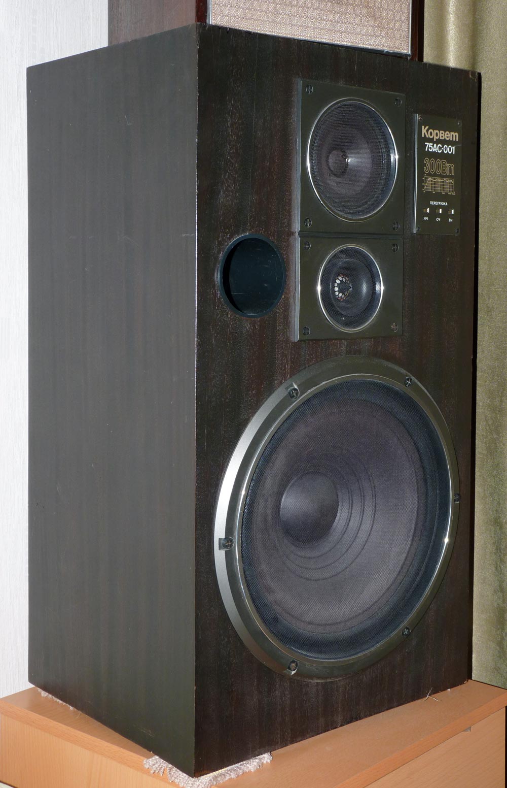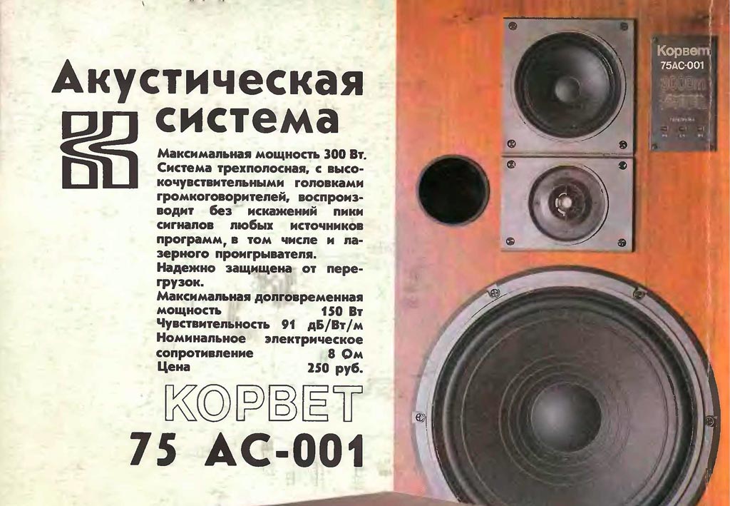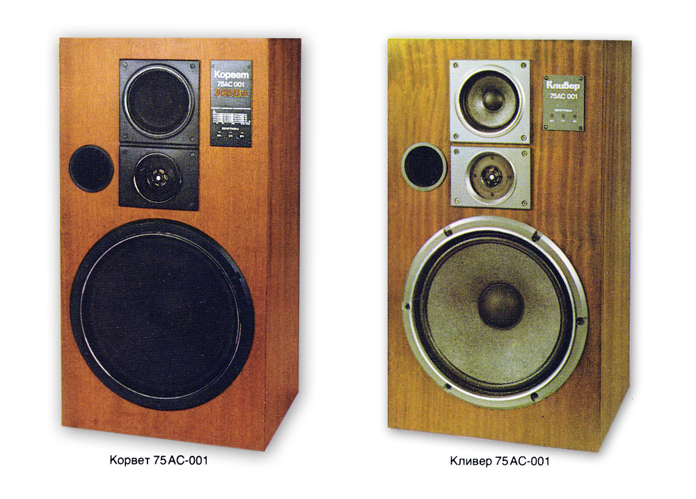 Акустические системы *Корвет 75АС-001* и *Кливер 75АС-001* с 1987 года выпускали Ленинградское НПО *Океанприбор* и завод *Красный Луч*. АС высшей группы сложности предназначены для высококачественного воспроизведения фонограмм. Рекомендуемая номинальная мощность применяемого совместно с АС усилителя 10...100 Вт. Предпочтительный вариант установки АС на подставке высотой 30...50 см. АС оличает высокая чувствительность к сигналам малой мощности и в то же время способность выдерживать высокие, до 300 Вт значения мощности. Благодаря этому АС работают в расширенном динамическом диапазоне без искажений. Полоса воспроизводимых звуковых частот 25...25000 Гц. Номинальная подводимая мощность 35 Вт. Номинальное входное сопротивление 8 Ом. Предельная долговременная подводимая мощность 150 Вт. Предельная кратковременная (пиковая) мощность 300 Вт. Вид акустического оформления - фазоинвертор. Габариты любой одной из двух наименований АС - 396х710х355 мм. Масса АС Корвет - 24 кг, Кливер - 40 кг.