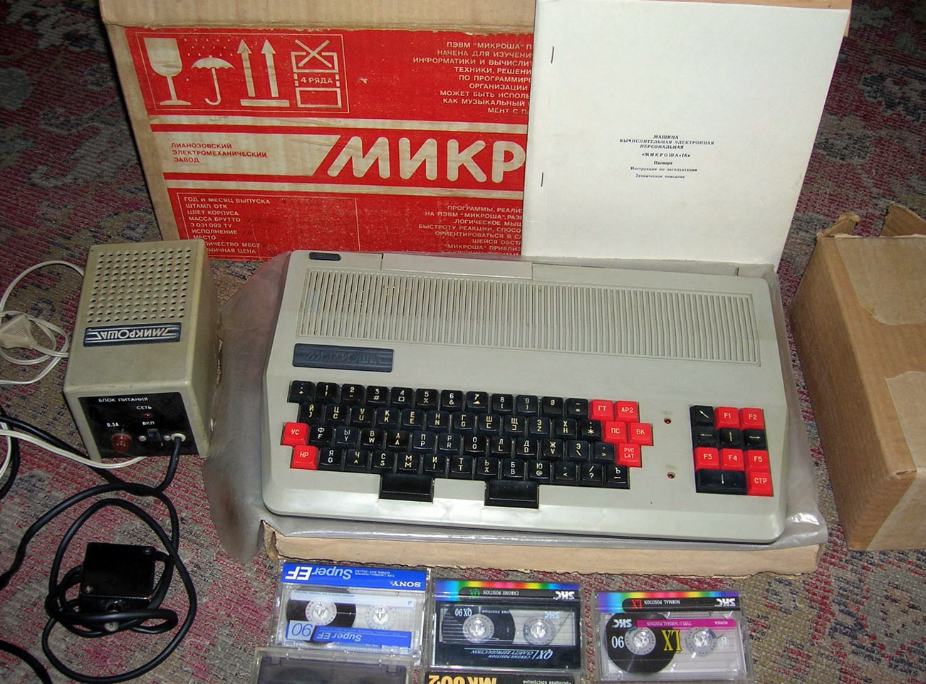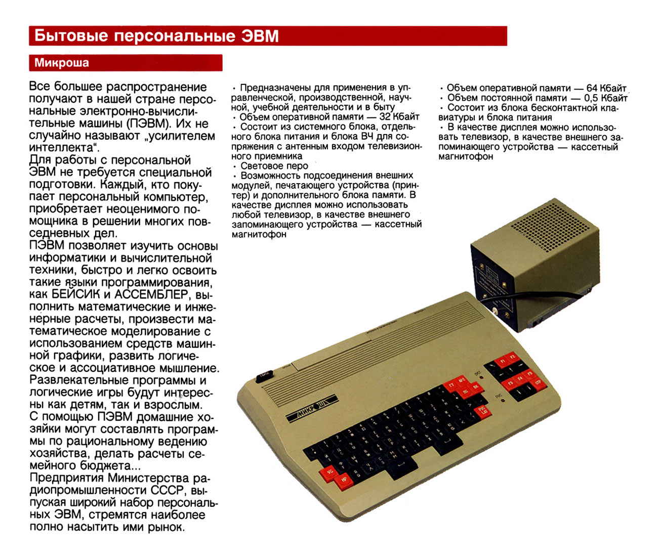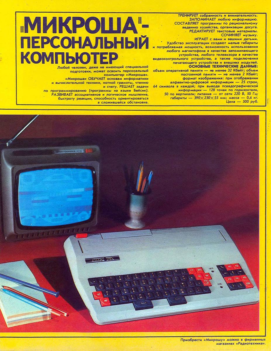 8-разрядный микрокомпьютер *Микроша* выпускался с 1987 года Лианозовским электромеханическим заводом. Один из первых бытовых компьютеров в СССР. В 1986-ом году в журнале "Радио" стали выходить статьи, посвящённые сборке самодельного компьютера "Радио-86РК". Этот компьютер стал родоначальником отдельной эволюционной ветви советских ПК, а его параметры - своеобразным стандартом совместимости. Вскоре сборкой совместимых с "Радио-86РК" машин занялись несколько отечественных заводов. Одним из них стал Лианозовский электромеханический завод, выпустивший в 1987-ом году модель "Микроша". Как и "Радио-86РК", "Микроша" базировался на процессоре КР580ВМ0/КР580ИК80 (клон Intel 8080), работавшем на тактовой частоте 1,77 МГц. Объём ОЗУ составлял 32 Кб, ПЗУ - 2 Кб. В ПЗУ был зашит системный монитор-загрузчик. Видеоадаптер был монохромным и поддерживал лишь текстовый режим 64 х 25 символов; знакогенератор содержал символы псевдографики, позволявшие формировать на экране простые изображения разрешением до 128 х 50 точек. В качестве устройства хранения данных использовался бытовой магнитофон. В компьютере имелся системный разъём, куда теоретически можно было подключить контроллер дисководов или дополнительное ОЗУ/ПЗУ, однако в заводском исполнении выпускался лишь ПЗУ-картридж с играми. Благодаря своим скромным характеристикам цена компьютера на момент выпуска составляла всего 500 рублей. Производство "Микроши" продолжалось как минимум до 1992-ого года. Наряду с клонами ZX-Spectrum и компьютерами серии "Электроника БК", Радио-86РК-совместимые ПЭВМ внесли огромный вклад в приобщение советских граждан к компьютерной грамотности, способствовали появлению целого поколения талантливых отечественных программистов. Микропроцессор: КР580ВМ80А на тактовой частоте 1,77 МГц, быстродействие — 300 тыс. оп/сПамять: ОЗУ — 32 Кб, ПЗУ — 2 КбУстройство вывода: бытовой телевизор через видеовход либо в антенный вход через отдельный блок модулятораРежим отображения: монохромный, 25 строк по 64 символа, знакогенератор содержит символы псевдографики, что позволяет имитировать графический режим 128 × 50 точекКлавиатура: 68 клавишВнешняя память: бытовой кассетный магнитофон, скорость чтения/записи — 700 бит/cПорты: «Интерфейс 1», «Интерфейс 2», «Внутренний интерфейс» (разъём ОНП-КС-23-Р (аналог СНП342-60Р))Питание: внешний блок питания 220 В (в школьном варианте — 42 В), на выходе — +5 В, −5 В, +12 В, потребляемая мощность — не более 20 ВтРазмеры: системного блока — 390 × 230 × 55 мм, блока питания — 160 × 100 × 100 мм, модулятора — 100 × 30 × 40 мм Теоретическая возможность подключения периферии через системный разъём: увеличение объёма ОЗУувеличение объёма ПЗУподключение НГМД через внешний контроллерпрограмматор ППЗУэлектронный диск ОЗУ или ПЗУобеспечение связи с удалёнными ЭВМ (связной контроллер)приём и выдача аналоговых сигналов (модуль ЦАП-АЦП)