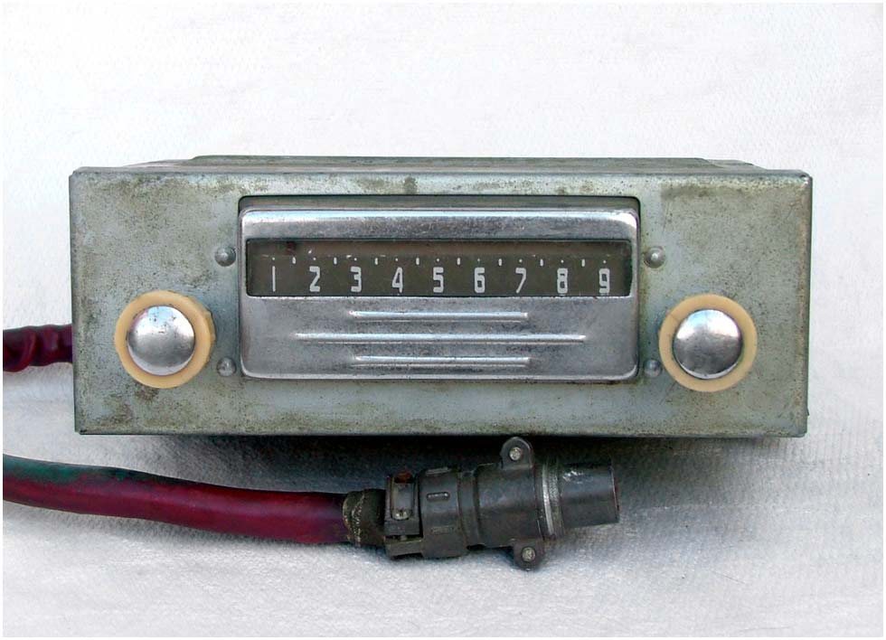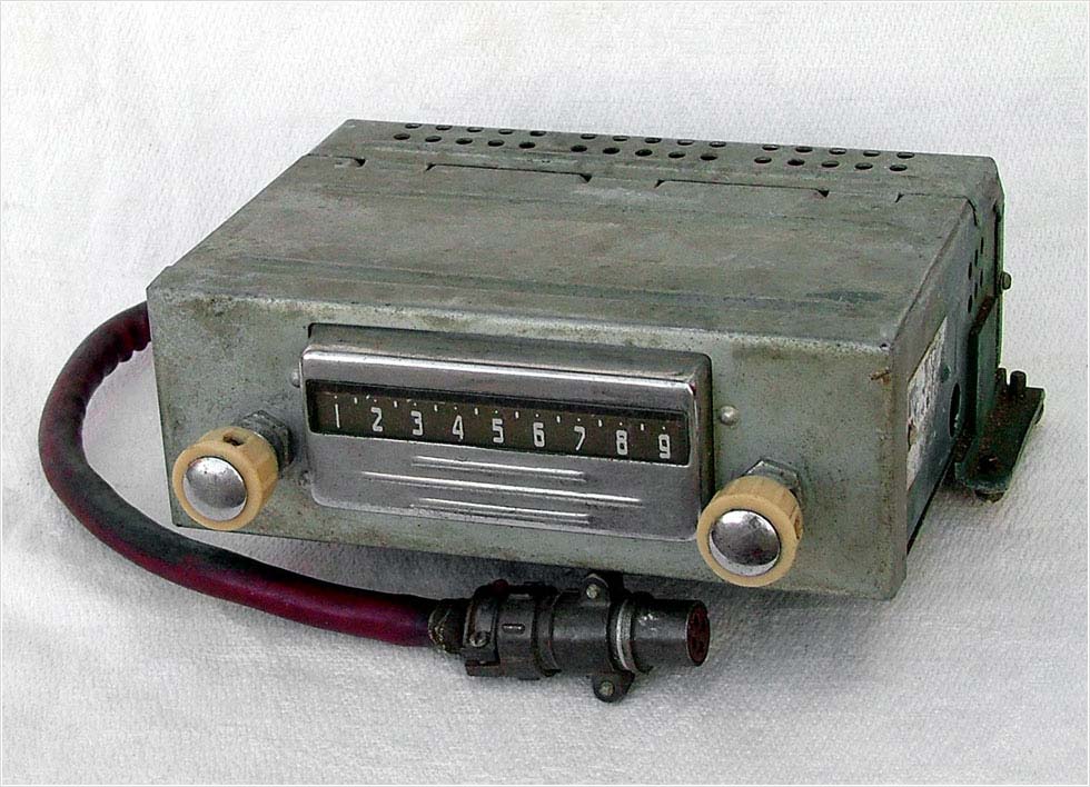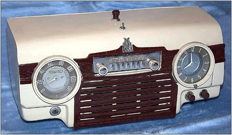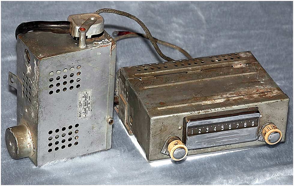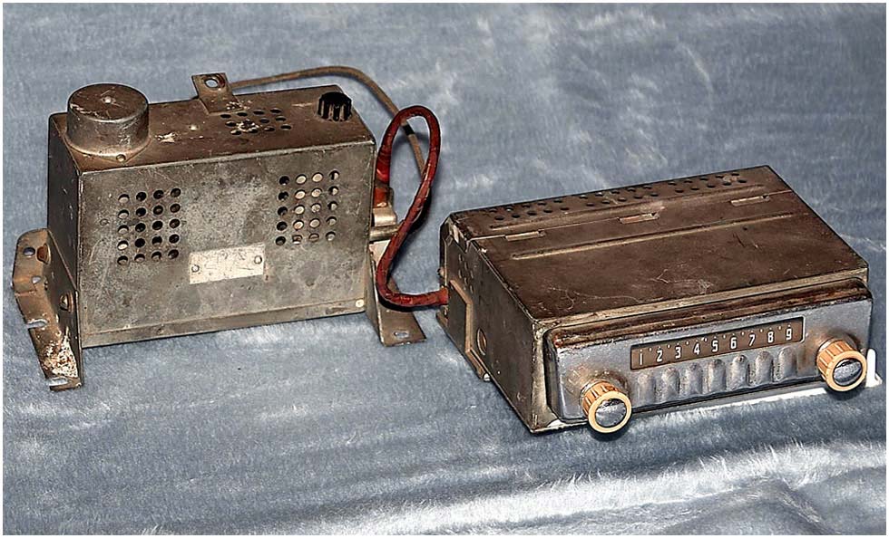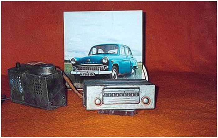 Радиоприёмники автомобильные *А-8* (слева) и *А-8М* (справа) с 1955 года выпускал Муромский радиозавод и Ленинградский завод *Красная Заря*. **А-8** это двухдиапазонный, шестиламповый супергетеродин. Он предназначен для установки в автомобилях **Победа** М-20, а модель **А-8М** в автомобилях **Москвич** М-402, М-403. Питание приёмников осуществляется от автомобильного аккумулятора с напряжением 12,8 вольт, с минусом на массе. Питание анодных цепей приёмника осуществляется от вибропреобразователя. Комплект состоит из приёмного блока, блока питания, громкоговорителя с отражательной доской и кабеля соединения с антенной. Соединение с блоком питания и громкоговорителем осуществляется кабелями. Настройка на частоту радиостанции производится ферроиндукторами (перемещением сердечников в катушках). Шкала приёмника градуирована в УЕ. Ручка переключателя диапазонов объединена с ручкой настройки. При её вдавливании включается диапазон ДВ, при вытягивании СВ. Номинальная выходная мощность 1,5 вт. Коэффициент нелинейных искажений 7%. Диапазоны ДВ: 150...415 кГц, СВ: 520...1500 кГц. ПЧ 465 кГц.Чувствительность в диапазонах: ДВ 250 мкВ, СВ 150 мкВ. Избирательность в диапазонах ДВ -20 дб, СВ -18 дб. Ослабление зеркального канала 20 дБ. Потребляемая мощность 45 Вт. Габариты приёмника 202х72х202 мм, БП - 176х72х137 мм. Отражательной доски 194х150х8 мм. Вес любого комплекта 7,3 кг. В 1955 году при модернизации автомобиля **Победа** уже штатно устанавливался приёмник **А-8**. А с 1956 года приёмники **А-8М** начали штатно ставить и на автомобилях Москвич-402, а позднее и 403, телескопическая антенна **АР-44** устанавливалась вертикально.