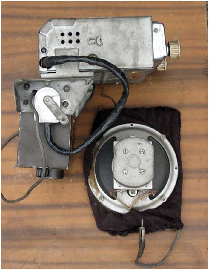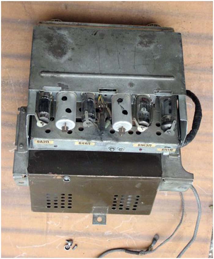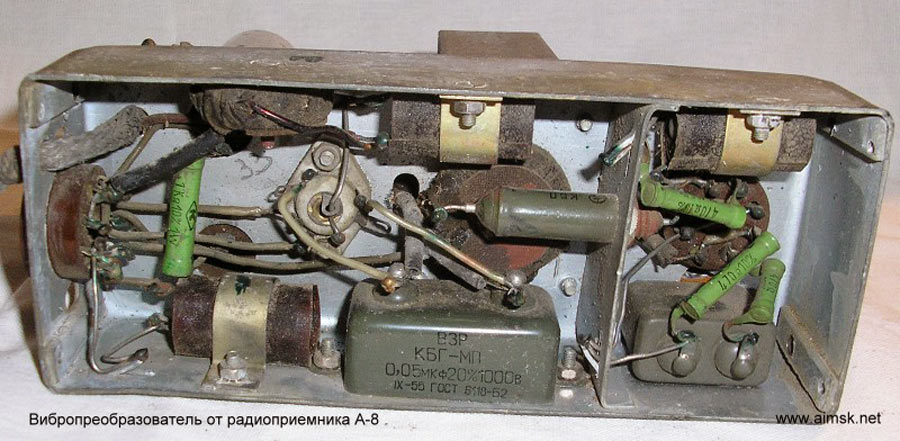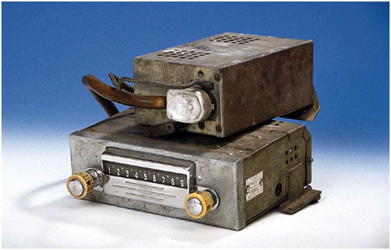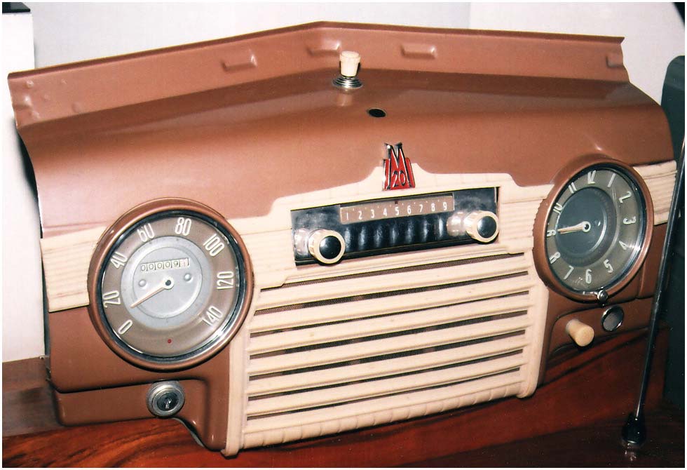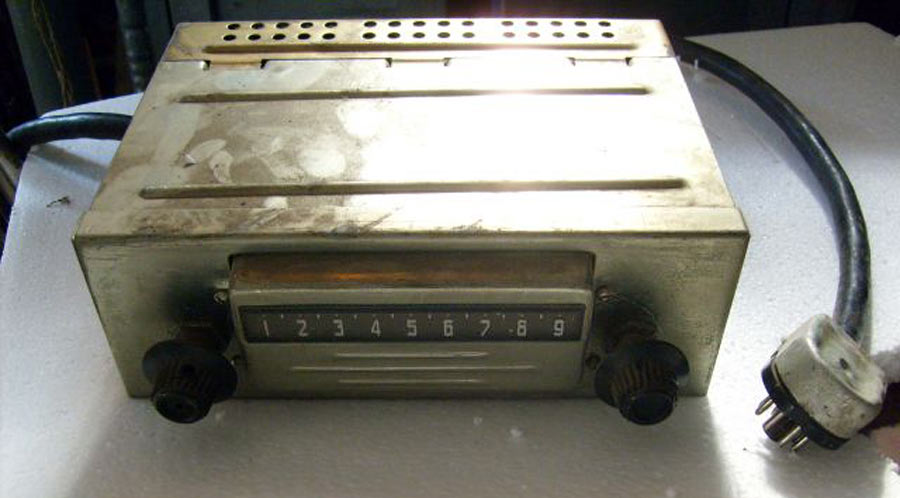 Радиоприёмники автомобильные *А-8* (слева) и *А-8М* (справа) с 1955 года выпускал Муромский радиозавод и Ленинградский завод *Красная Заря*. **А-8** это двухдиапазонный, шестиламповый супергетеродин. Он предназначен для установки в автомобилях **Победа** М-20, а модель **А-8М** в автомобилях **Москвич** М-402, М-403. Питание приёмников осуществляется от автомобильного аккумулятора с напряжением 12,8 вольт, с минусом на массе. Питание анодных цепей приёмника осуществляется от вибропреобразователя. Комплект состоит из приёмного блока, блока питания, громкоговорителя с отражательной доской и кабеля соединения с антенной. Соединение с блоком питания и громкоговорителем осуществляется кабелями. Настройка на частоту радиостанции производится ферроиндукторами (перемещением сердечников в катушках). Шкала приёмника градуирована в УЕ. Ручка переключателя диапазонов объединена с ручкой настройки. При её вдавливании включается диапазон ДВ, при вытягивании СВ. Номинальная выходная мощность 1,5 вт. Коэффициент нелинейных искажений 7%. Диапазоны ДВ: 150...415 кГц, СВ: 520...1500 кГц. ПЧ 465 кГц.Чувствительность в диапазонах: ДВ 250 мкВ, СВ 150 мкВ. Избирательность в диапазонах ДВ -20 дб, СВ -18 дб. Ослабление зеркального канала 20 дБ. Потребляемая мощность 45 Вт. Габариты приёмника 202х72х202 мм, БП - 176х72х137 мм. Отражательной доски 194х150х8 мм. Вес любого комплекта 7,3 кг. В 1955 году при модернизации автомобиля **Победа** уже штатно устанавливался приёмник **А-8**. А с 1956 года приёмники **А-8М** начали штатно ставить и на автомобилях Москвич-402, а позднее и 403, телескопическая антенна **АР-44** устанавливалась вертикально.
