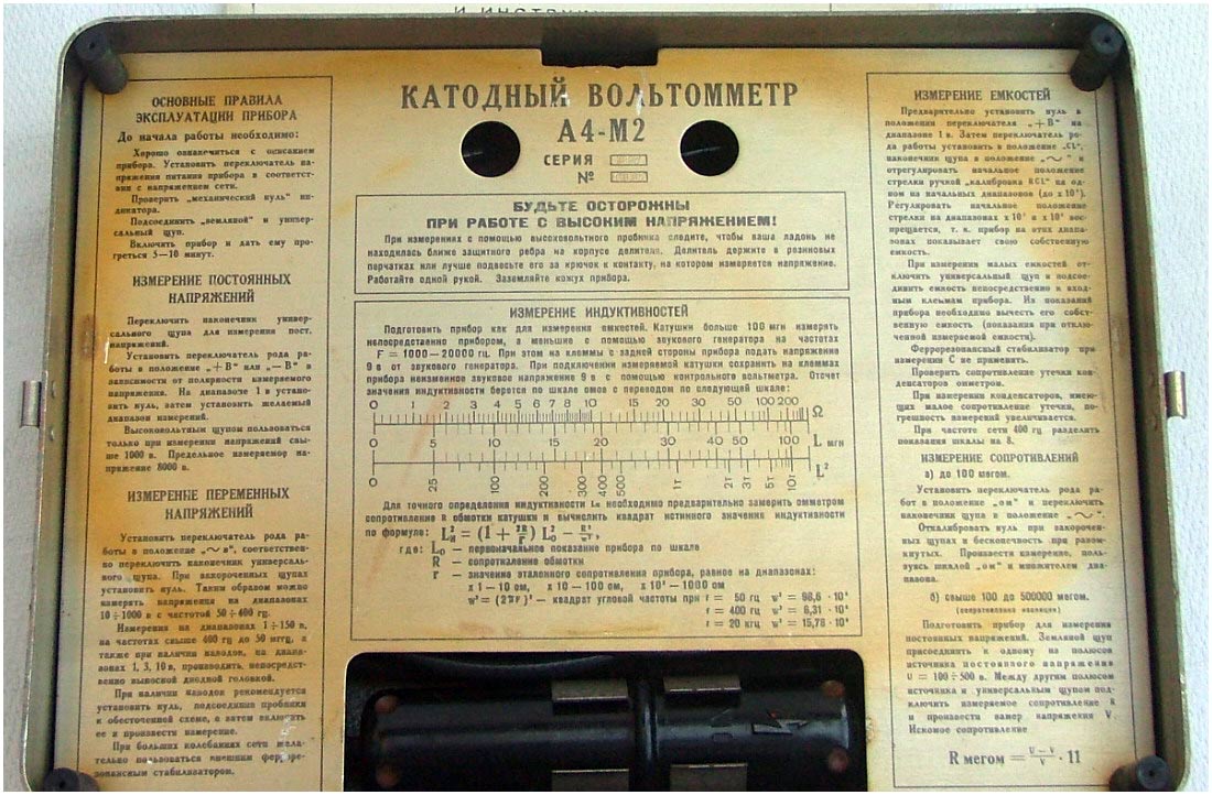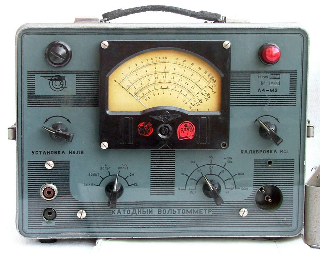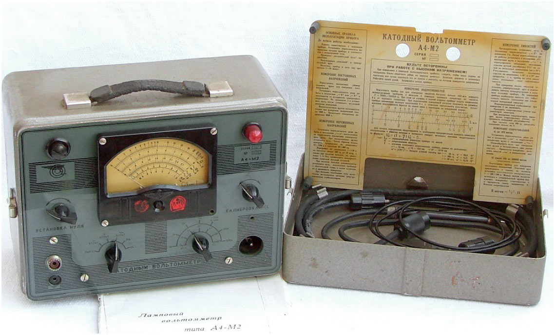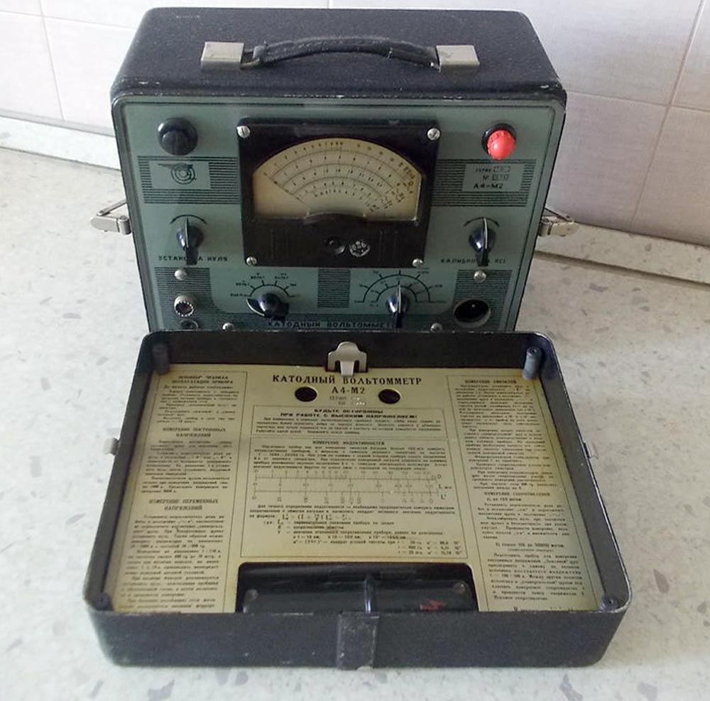 Катодный вольтомметр *А4-М2* выпускался с начала 1956 года. Предназначен для измерения постоянных и переменных напряжений, сопротивлений постоянному току, величины ёмкости и индуктивности. Шкала отградуирована в эффективных значениях напряжения. Прибор измеряет постоянные и переменные напряжения до 1000 В. С выносным делителем предел измерения может быть расширен до 10 кВ постоянного напряжения. Точность измерения постоянных и переменных напряжений от 3 до 6%. Прибор позволяет измерять сопротивления постоянному току от 1 ома до 100 мегом, индуктивность от 100 мгн до 100 гн и ёмкостей от 100 пф до 100 мкф. Точность измерения сопротивлений 10%, индуктивностей и ёмкостей 15%. Питание от сети 127 или 220 В, с частотой 50 Гц или 115 В, 400 Гц.