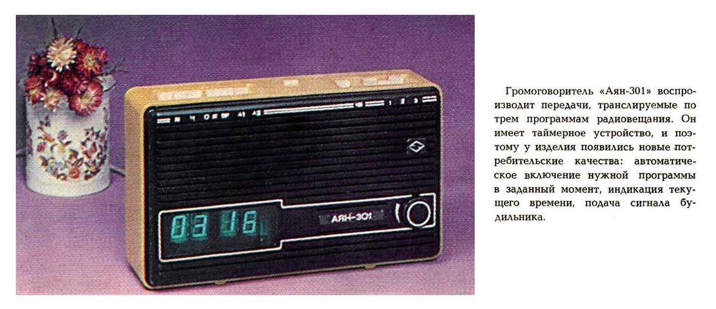 Приёмник трёхпрограммный *Аян-301* с таймером выпускался с 1983 года Тувинским машиностроительным заводом. Предназначен для прослушивания одной низкочастотной программы с усилением звука и двух высокочастотных, передаваемых по уплотнённой системе, а так же включение и выключение приёмника в заданное время и отображение текущего времени. На последней фотографии на плате отсутствует микросхема таймера.
