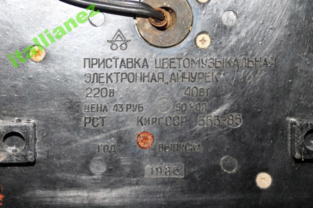 Цветомузыкальная приставка *Айчурек* выпускалась с 1985 года Джалал-Абадским ОАО *Нур*, Киргизской ССР. ЦМП предназначена для цветового сопровождения речевых и музыкальных фонограмм. Диапазон частот 20...20000 Гц разделён на три канала. Потребляемая мощность 40 Вт. Габариты ЦМП - 150х150х390 мм.