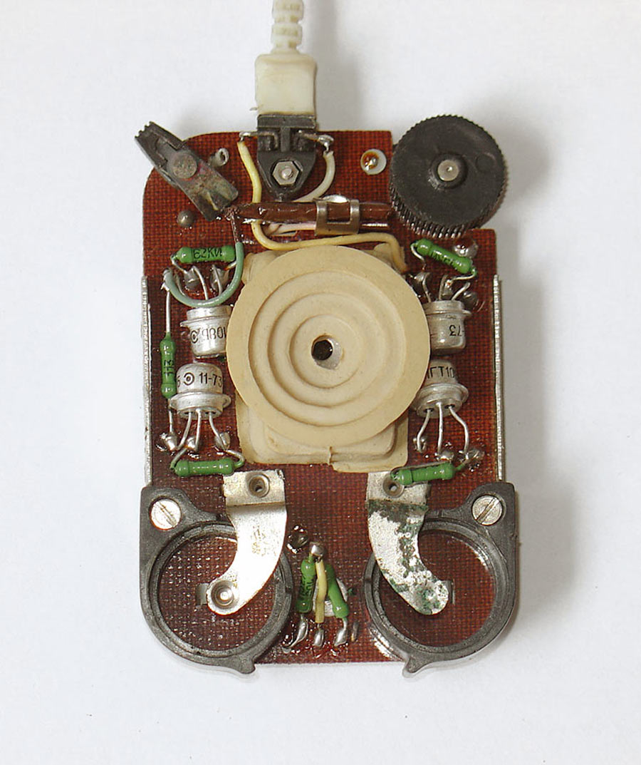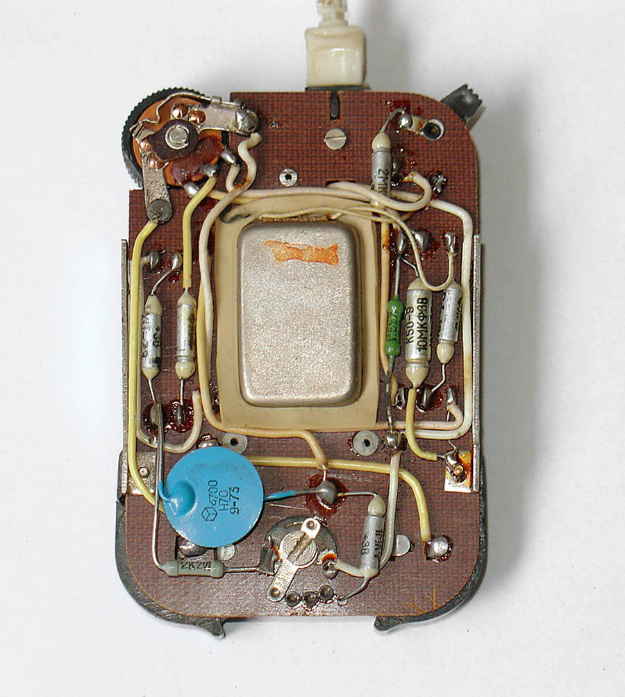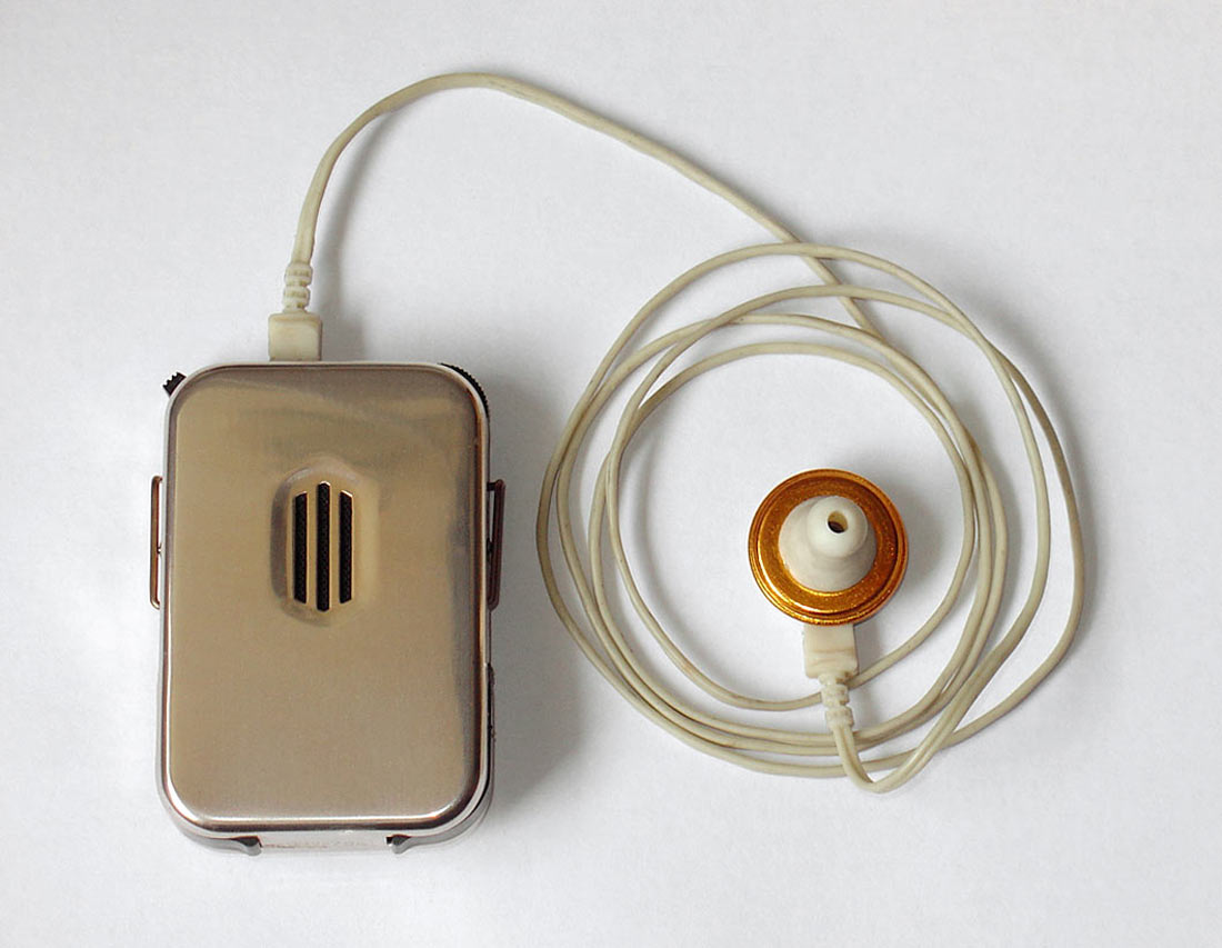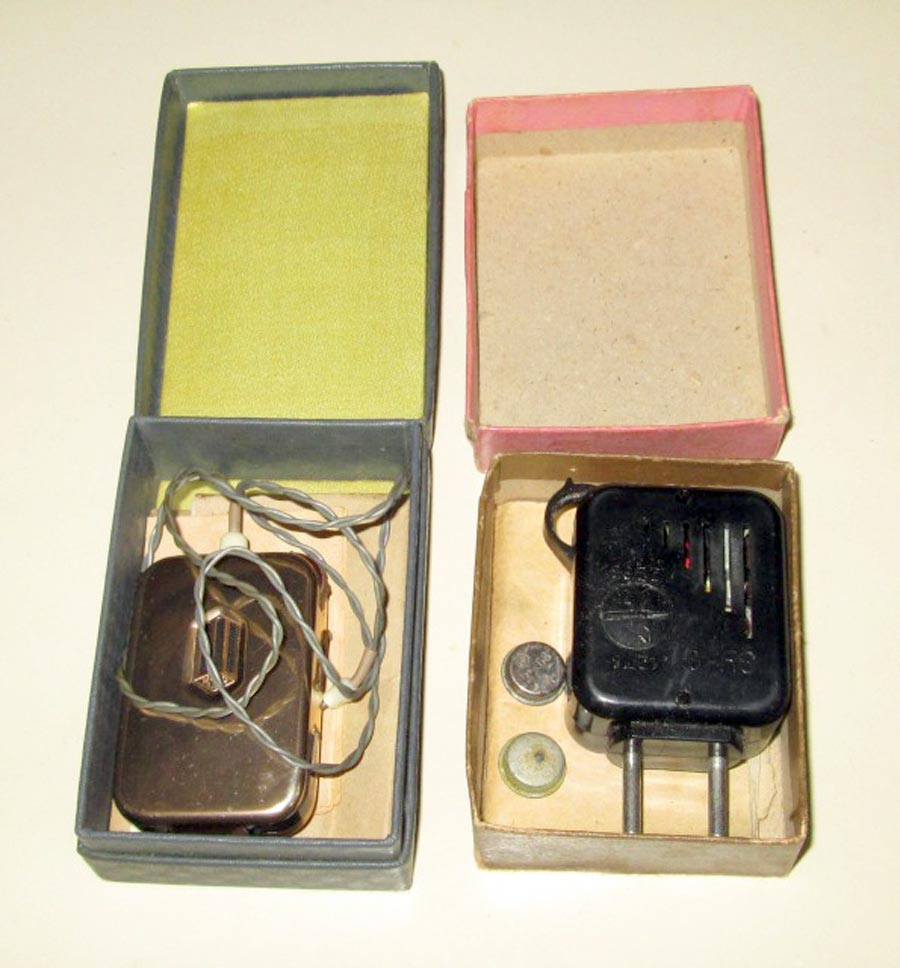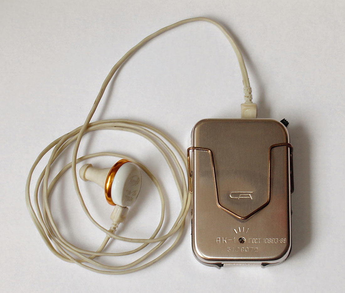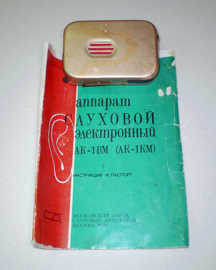Слуховой аппарат *АК-1* (581М) выпускался предположительно с 1965 года Московским заводом слуховых аппаратов. Применяется для компенсации малых, больших и средних потерь слуха по воздушной или костной проводимости. Может работать с питанием от одного или двух аккумуляторов, что соответственно обеспечивает максимальное акустическое усиление 60 и 128 дБ. Имеет плавную регулировку громкости и четырехступенчатый регулятор тембра. Завод выпускал две модели: АК-1В, укомплектованную телефоном воздушной проводимости, и модель АК-1К, укомплектованную телефоном костной проводимости. Аппарат приспособлен для телефонных разговоров и исключает воздействие внешних шумов. Габариты аппарата 66х44х15 мм, масса с двумя аккумуляторами 75 гр. Предположительно с 1978 года завод выпускал модернизированный аппарат *АК-1* (ВМ или КМ) отличающийся переводом схемы с германиевых на кремниевые транзисторы и соответственно более современной элементной базой.