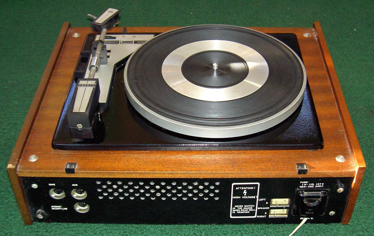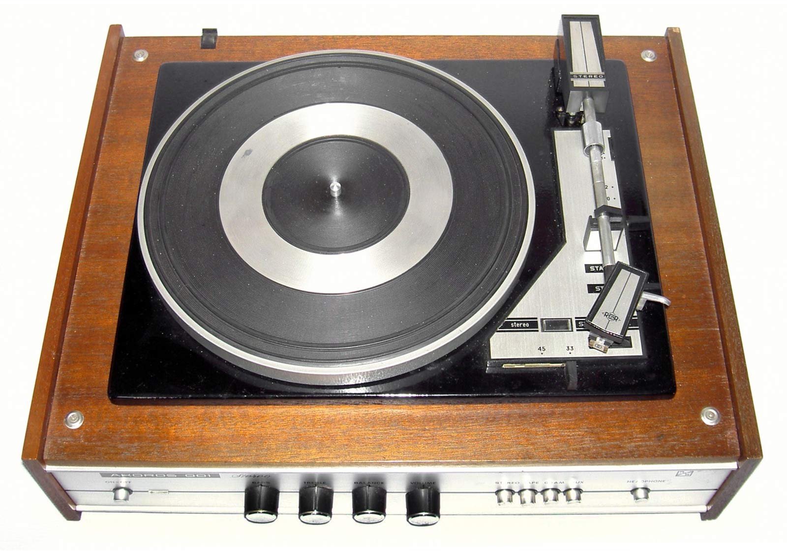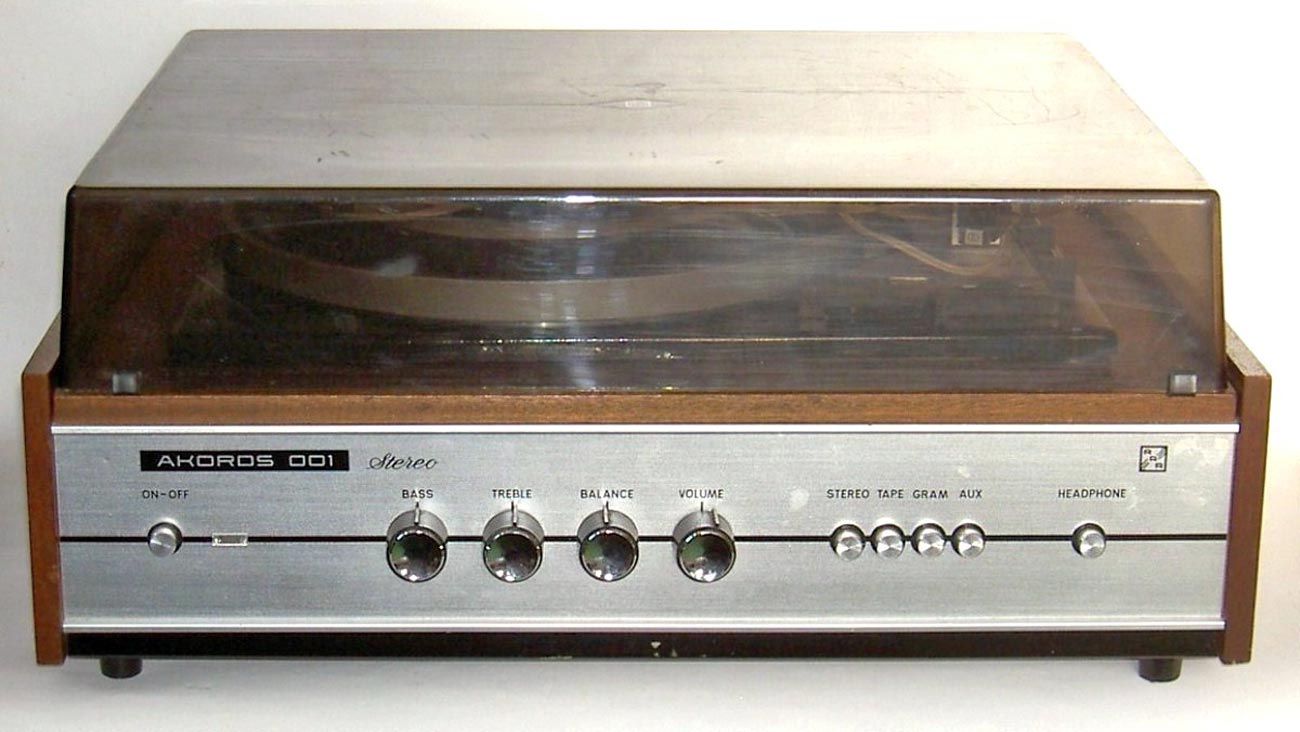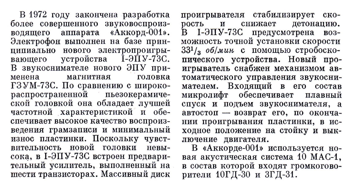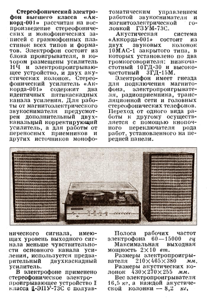 Электрофоны сетевые транзисторные *Аккорд-101-стерео* и *Аккорд-001-стерео* с осени 1972 года выпускал Рижский электромеханический завод. Электрофоны **Аккорд-101-стерео** и **Аккорд-001-стерео** одинаковы. Сначала электрофон позиционировался как первый класс, затем был переведён в высший, так как по многим своим параметрам, кроме ЭПУ ему соответствовал. Стереофонический электрофон **Аккорд-001 стерео** один из первых электрофонов высшего класса в СССР. Он рассчитан на прослушивание моно и стерео пластинок всех форматов и состоит из проигрывателя, в котором размещены усилитель низкой частоты и ЭПУ и двух акустических систем. Для магнитоэлектрического звукоснимателя имеется корректирующий усилитель, а для работы с других источников использован предварительный усилитель. В модели применено стереофоническое ЭПУ типа I-ЭПУ-73С - с полуавтоматическим управлением звукоснимателем и магнитоэлектрической головкой ГЗУМ-73С. АС состоит из двух звуковых колонок **10MAC-1**, в которых установлено по два громкоговорителя: один 10ГД-30 и один ЗГД-15М. Электрофон имеет гнёзда для подключения трансляционной сети, магнитофона, приёмника или стереотелефонов. Переход от одного вида работы к другому осуществляется с помощью кнопочного переключателя рода работ, установленного на передней панели. Полоса рабочих звуковых частот электрофона 60...15000 Гц. Максимальная выходная мощность 2х10 Вт. Габариты модели 210х465х380 мм. Габариты одной АС - 430х270х255 мм. Вес электропроигрывателя без упаковки - 16,5 кг. Вес каждой АС - 8,2 кг.