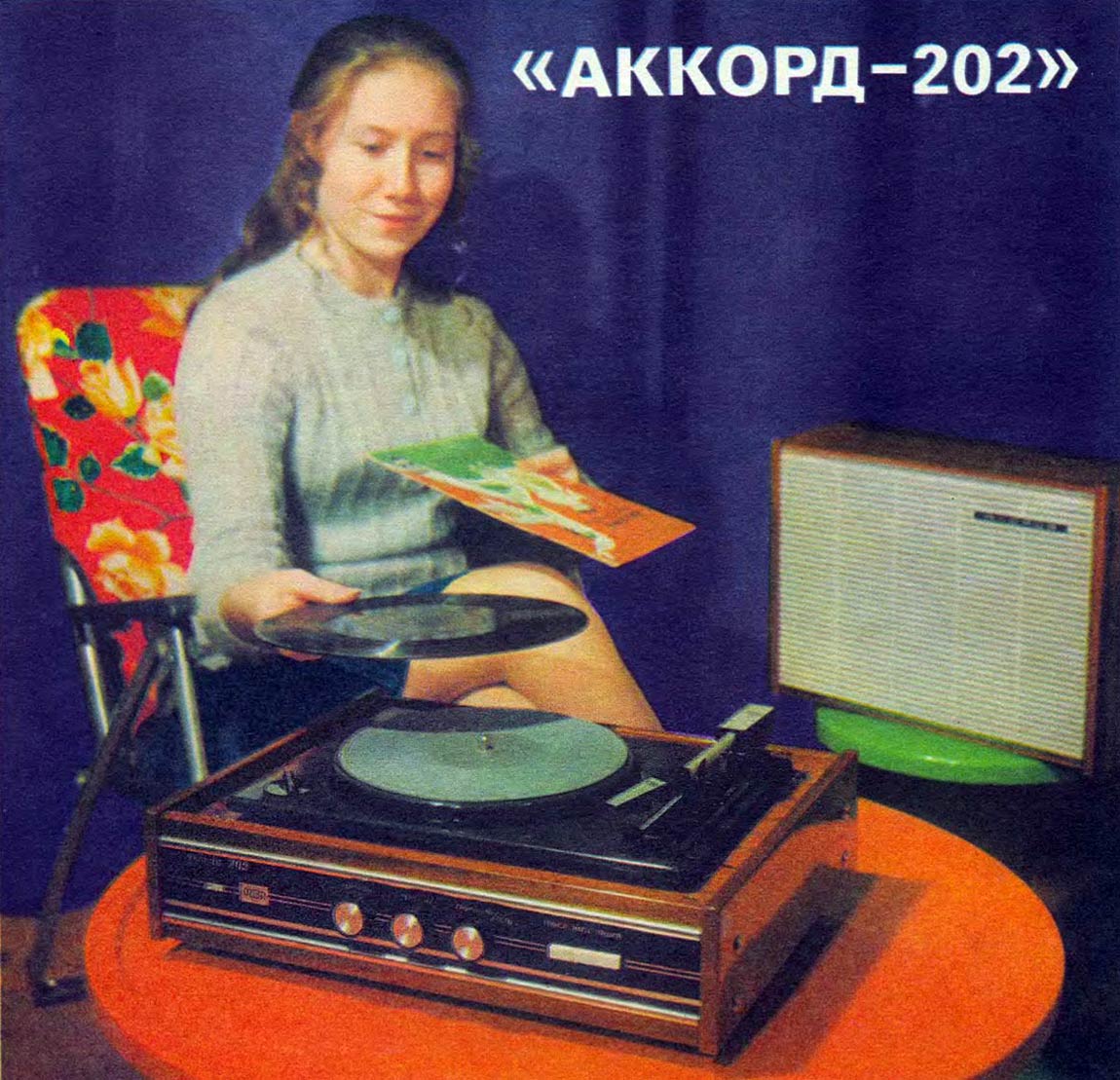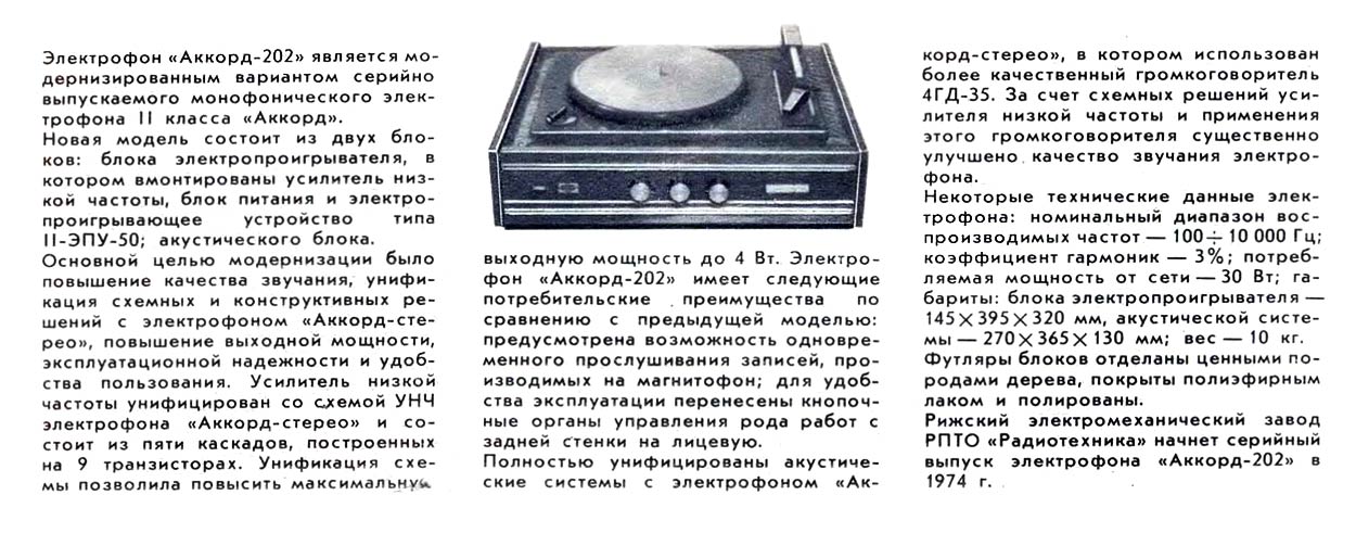 Электрофон сетевой транзисторный *Аккорд-202* подготовил к выпуску с 1974 года Рижский ЭМЗ РПТО *Радиотехника*. Электрофон II класса **Аккорд-202** состоит из электропроигрывающего устройства II-ЭПУ-50 с усилителем НЧ, блока питания и акустической колонки. Усилитель НЧ и акустическая колонка электрофона **Аккорд-202** полностью аналогичны усилителю НЧ и АС модели **Аккорд-Стерео**. Максимальная выходная мощность 4 Вт. Диапазон воспроизводимых звуковых частот - 100...10000 Гц. Потребляемая мощность 30 Вт. Вместо ранее использовавшегося в колонках громкоговорителя 4ГД-28, здесь применён более совершенный громкоговоритель 4ГД-35. Габариты электрофона - 145х395х320 мм, акустической колонки - 270х365х130 мм. Масса электрофона с акустической колонкой 10 кг.