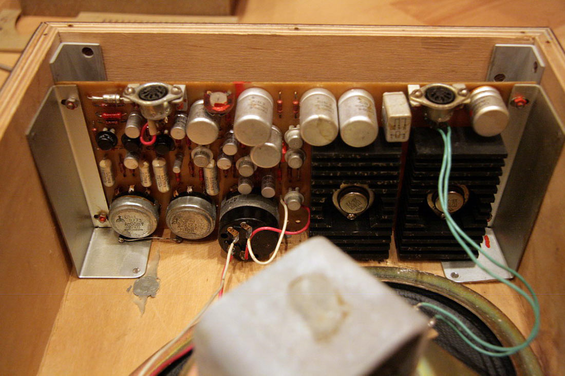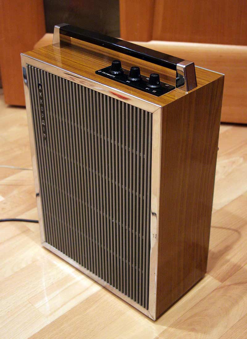 Электроакустический агрегат *Аккорд-М* с 1972 года выпускалась Смоленским заводом *Кентавр*. Предназначен для усиления звучания щипковых инструментов, а так же сигналов со звукоснимателя, магнитофона, приёмника или радиолинии. Питание агрегата осуществляется от специального батарейного блока или от электрической сети через блок питания вставляемого вместо батарейного блока. Номинальная выходная мощность усилителя при питании от батарей - 2,5 Вт, от сети - 3 Вт. Диапазон частот воспроизводимых по звуковому давлению не уже 80...10000 Гц, напряжению 60...12000 Гц. Габариты агрегата 290х140х445 мм. Масса без отсека питания 4 кг.
