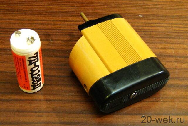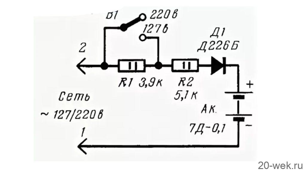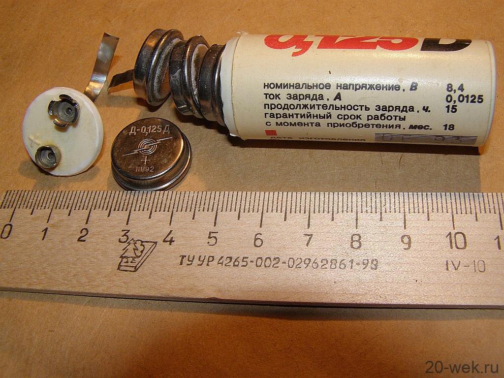 7Д-0,1 - это единственная аккумуляторная батарея напряжением близким к 9В выпускавшаяся в СССР. И самое интересное, что такие аккумуляторы, судя по всему выпускаются до сих пор, по непроверенной информации ОАО "Аккумуляторная компания "Ригель" выпускает 7Д-0,125Д. И судя по тому, что буква "Д" написана латиницей это может быть правдой, в СССР латиницей не писали. Хотя возможно это "перестроечные" шутки производителя. Циферки после тире, в названии, обозначали емкость. Были 7Д-0,1, 7Д-0,115, 7Д-0,125. Характеристики: номинальная ёмкость — 125 мА-ч; номинальное напряжение — 8, 4 В; ток разряда — 12, 5 мА (рекомендуемый — 10-20 мА, максимальный — 30 мА); конечное разрядное напряжение — 7 В; ток заряда — 12, 5 мА; время заряда — 15 часов; конечное зарядное напряжение — 10, 5 В; габаритные размеры — диаметр 23, 2 мм., высота 58 мм. без контактов; масса — 53 грамма; срок службы — 400-500 циклов; оптимальная рабочая температура — 5-35°С. Такими аккумуляторами иногда комплектовались некоторые радиоприемники, например Селга, и конечно их можно было купить в розницу. Продавались аккумуляторы в комплекте с зарядным устройством или отдельно. Если батарея продавалась отдельно, нужно было искать специальное зарядное для нее. И батареи и зарядные устройства были в Советское время достаточно дефицитны. Зарядное устройство было катастрофически простое: два резистора и диод. Иногда можно было встретить зарядное с переключателем напряжения сети, как на схеме ниже. Естественно радиолюбители не обошли стороной зарядное, проблема дефицита, да и простота заводского изделия... В журнале Радио было опубликовано несколько вариантов схем. Сам аккумулятор внутри состоял из других аккумуляторов, поменьше. Внутри находилось 7 штук дисковых Д-0,125 или Д-0,115. Были еще Д-0,1, но я такие в живую не встречал.