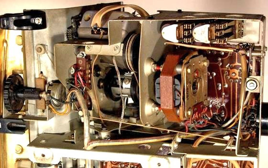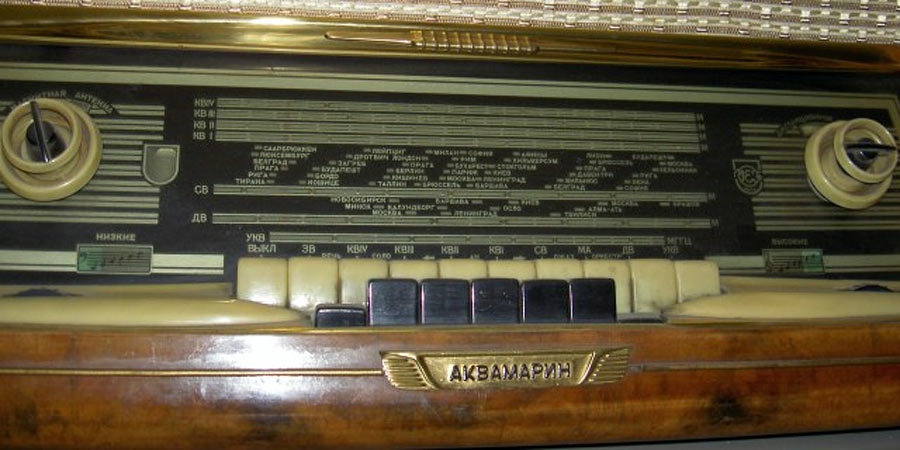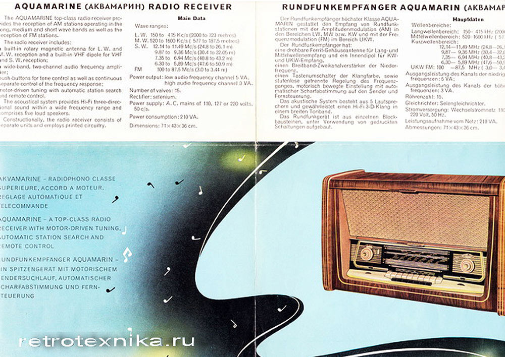 Радиоприёмник сетевой ламповый *Аквамарин* разработал в 1955 году Рижский государственный электротехнический завод ВЭФ. К 1956 году конструкторским бюро завода ВЭФ был разработан ряд моделей радиоприёмников высшего класса, которые значительно повлияли на развитие советской радиопромышленности. Многие из новых перспективных радиоприёмников демонстрировались на различных выставках, но так и не были поставлены на конвейер. Приёмники имели современный дизайн, большой набор функций (автоматическая настройка, тонрегистры, пульт ДУ, УКВ-диапазон) и высокие акустические характеристики. Опытный приёмник *Аквамарин* имеет 7 диапазонов: ДВ, СВ, КВ1..КВ4, УКВ. Нижний ряд клавиш - это тонрегистр, дискретно управляющего АЧХ усилителя НЧ и блок моторной автоматической настройки, со сложной механикой.