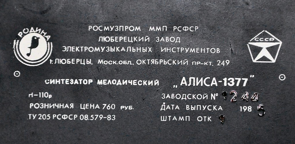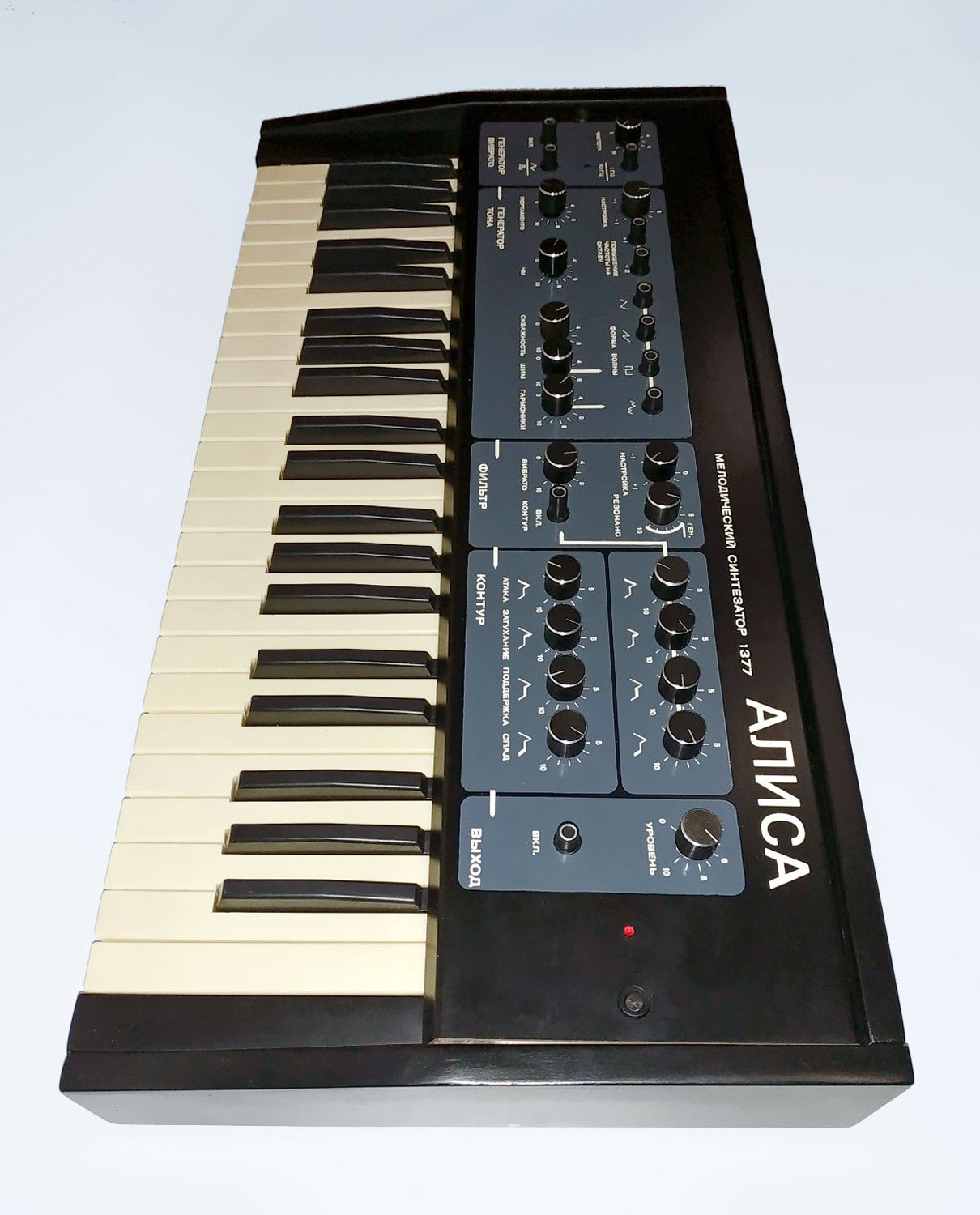 Электромузыкальный инструмент *Алиса-1377* выпускал предположительно с 1980 года Люберецкий завод электромузыкальных инструментов. ЭМИ предназначен для синтеза электрических сигналов звукового диапазона частот с возможностью исполнения на нем сольных партий музыкальных произведений и создания звуковых эффектов при подключении его к внешнему усилительно-акустическому устройству. Синтезатор может быть использован в качестве музыкального инструмента, а также в качестве источника нестандартных электрических сигналов для различных целей.