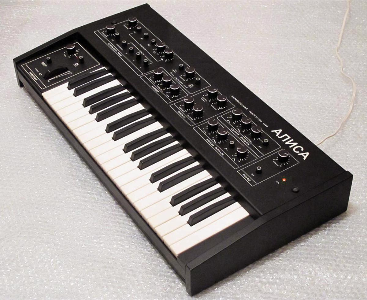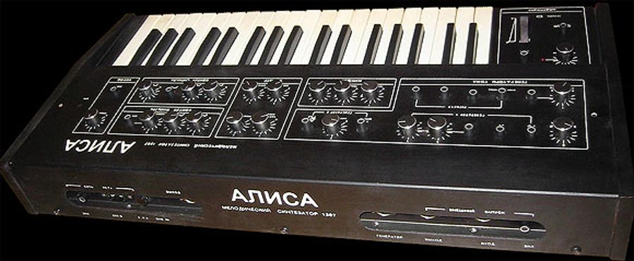 Электромузыкальный инструмент *Алиса-1387* с 1982 года выпускал Люберецкий завод электромузыкальных инструментов. ЭМИ представляет собой мелодический синтезатор, предназначен для сольного исполнения в музыкальных коллективах, а также для получения разнообразных эффектов и синтезированных звучаний. Инструмент имеет 3-х октавную клавиатуру, колесо модуляции и органы управления в виде регуляторов и кнопок. Состоит их основных синтезирующих блоков: генератор тона, фильтр, контур фильтра, контур сигнала, модуляция, микшер и выход. Управление на передней панели: Генератор тона-настройка; генератор 1: 3 формы волны, скважность, шим; портаменто (вкл); регистр: субгармоника, 32*,16*, 8*; генератор 2: вкл.синхр, интервал, форма волны (прямая, пилообразная). Микшер - генератор 1 (уровень); генератор 2 (уровень); шум (уровень). Фильтр - частота среза; резонанс; вибрация; слежение. Контур фильтра - атака; затухание; амплитуда + вкл. Контур сигнала - атака; затухание; поддержка (вкл); спад. Модуляция - темп; вкл.формы волны; перекл. генератор/фильтр; глубина (колесо). Выход - общий уровень; вкл. выхода. Разъемы задней панели: Выход линейный. Сеть (вкл). Разъём сети. Внешний запуск - генератор, выход, вход, вкл. Передняя панель - выход на наушники.