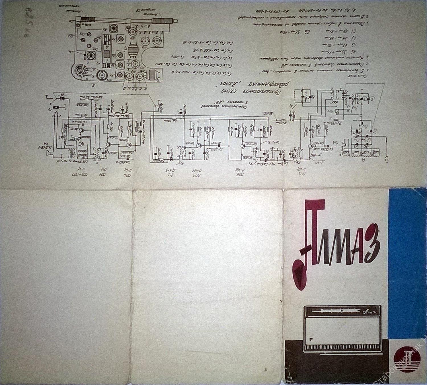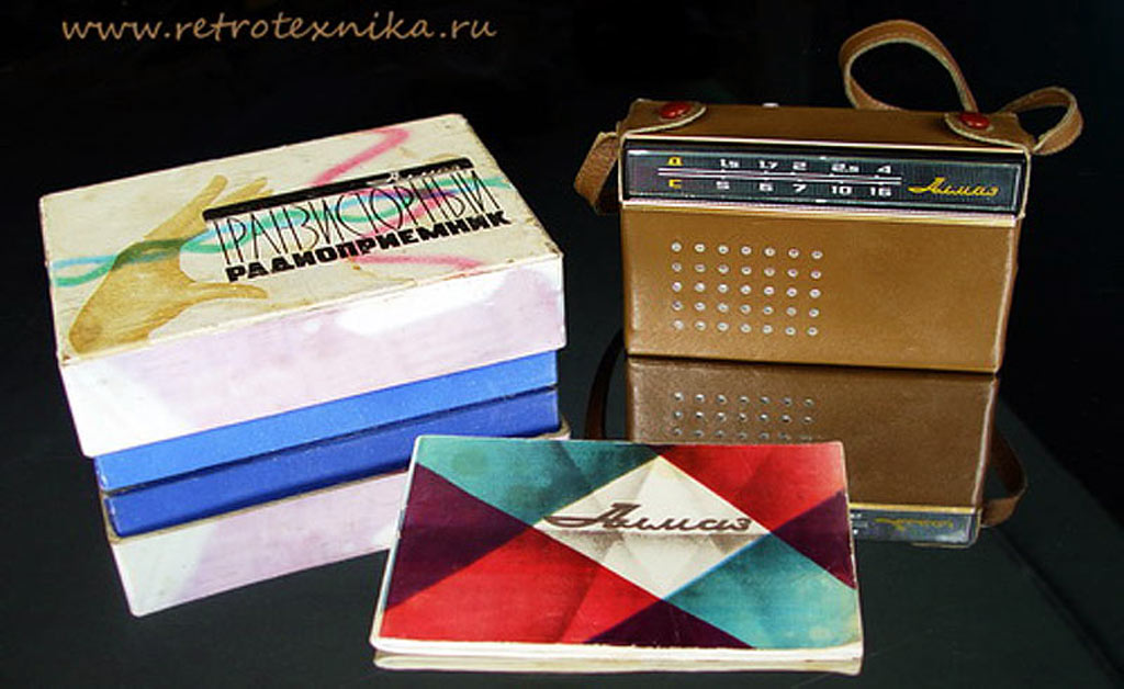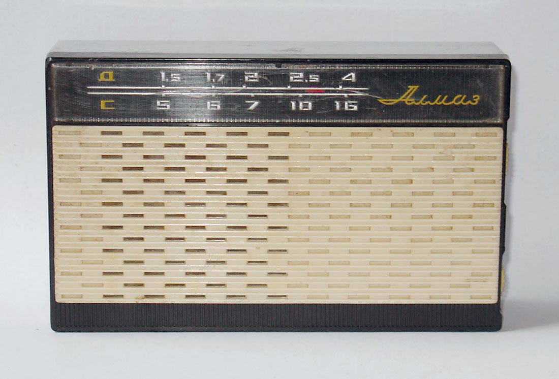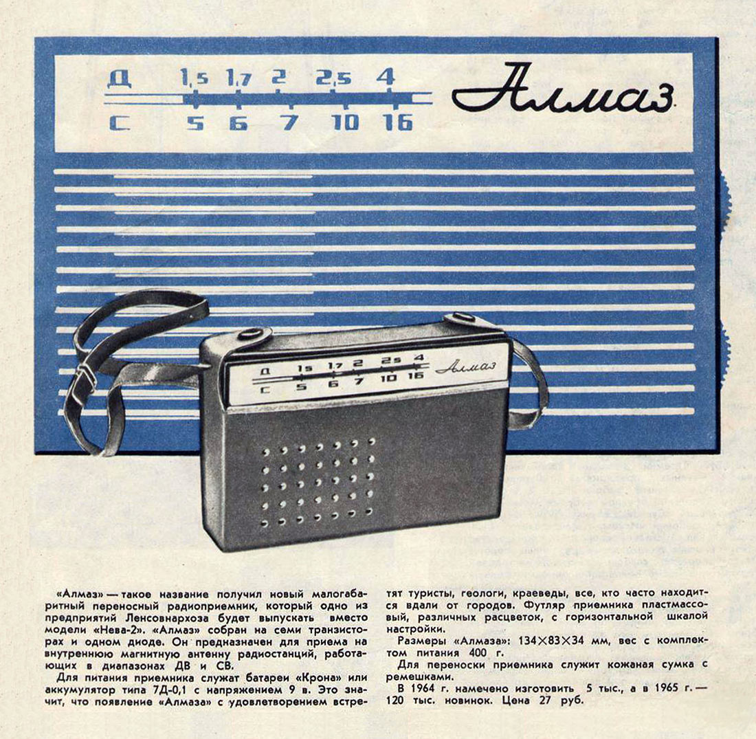 Портативный радиоприёмник 4-го класса *Алмаз* с 1964 года выпускали Ленинградские заводы *Новатор и *Радиоприбор*. Питание - аккумуляторная батарея 7Д-0,1 или Крона. Номинальная выходная мощность 50 мВт. Диапазоны СВ, ДВ, где чувствительность 1,5 мВ/м и 2,5 мВ/м. Избирательность по соседнему каналу 16 и 20 дБ, по зеркальному 20 дБ. Диапазон воспроизводимых частот звука 450...3000 Гц. Основные параметры сохраняются при снижении напряжения питания до 7,2 В. Габариты модели 134х83х34 мм. Масса 380 гр. Для переноски приёмник помещается в кожаный футляр. Приёмник выпускали в разных вариантах оформления до 1972 года. Завод *Радиоприбор* для использования заделов по окончании выпуска модели выпускал и ремонтные комплекты для мастерских и радиолюбителей состоящие из корпуса с громкоговорителем, платы (собранной и настроенной или плату и комплектующих) из которых можно было собрать аналогичный приёмник. Стоимость такого приёмника была на 30% дешевле заводского. Радио №1/1965, ст. 30