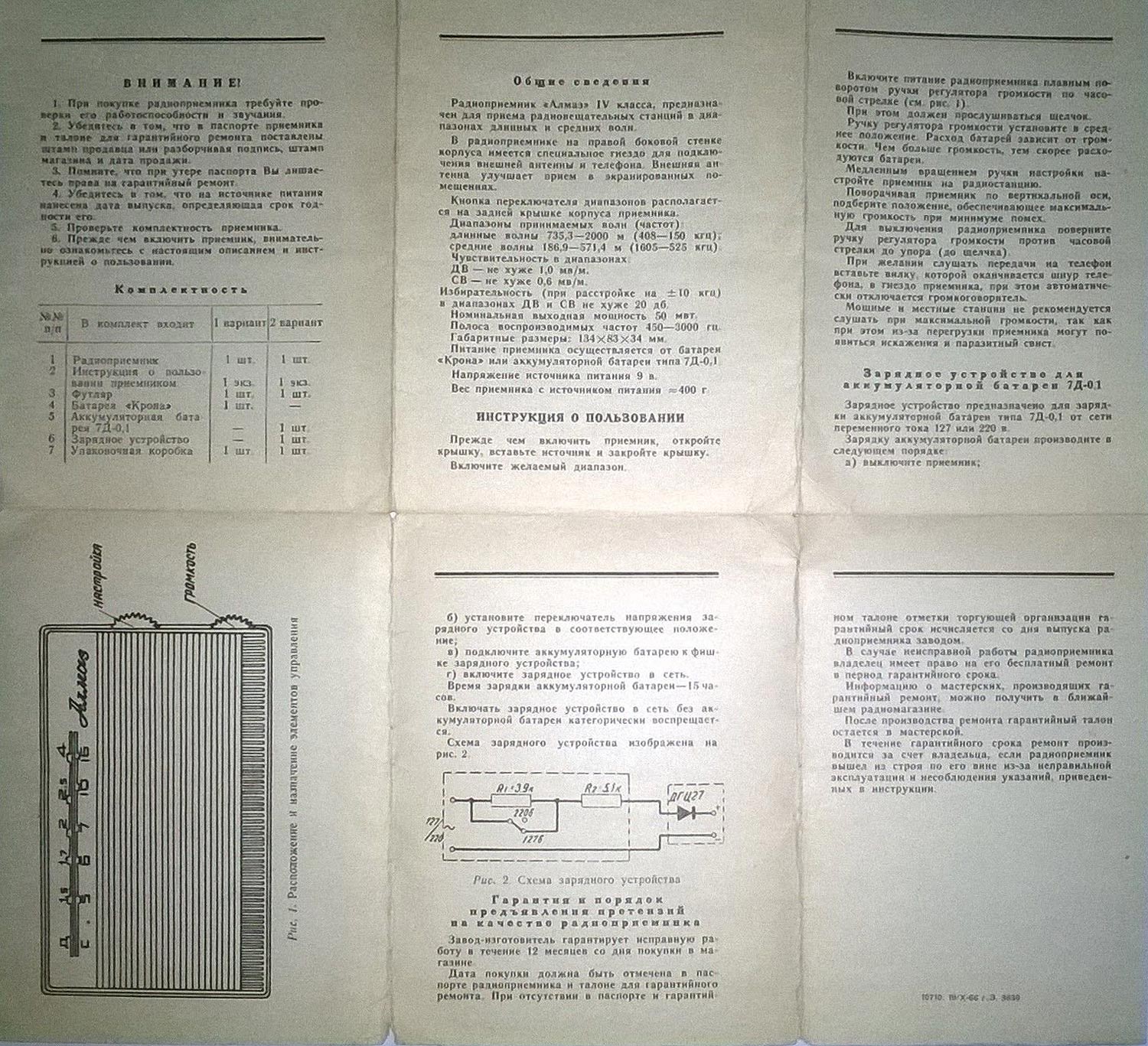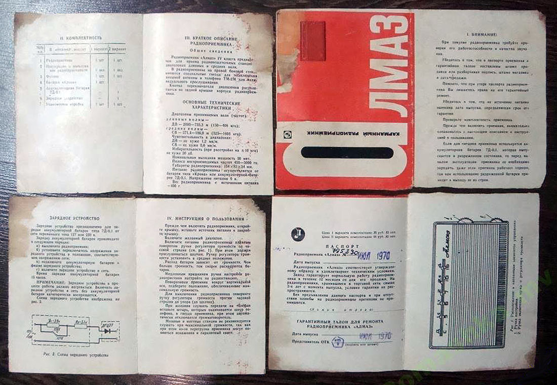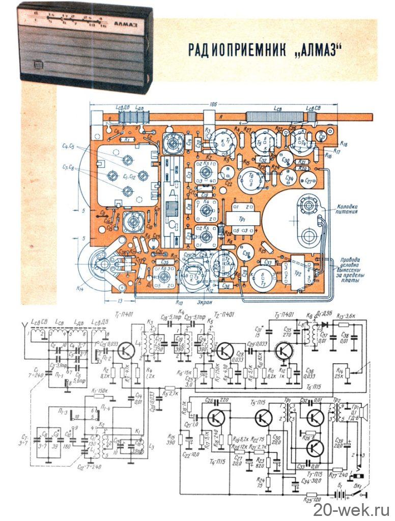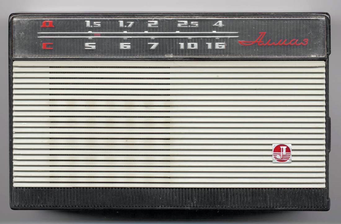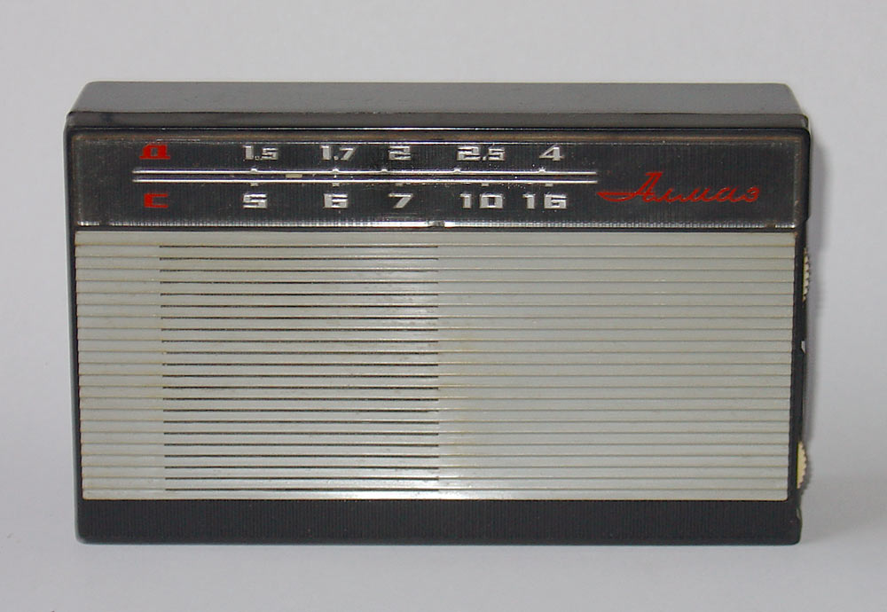 Портативный радиоприёмник 4-го класса *Алмаз* с 1964 года выпускали Ленинградские заводы *Новатор и *Радиоприбор*. Питание - аккумуляторная батарея 7Д-0,1 или Крона. Номинальная выходная мощность 50 мВт. Диапазоны СВ, ДВ, где чувствительность 1,5 мВ/м и 2,5 мВ/м. Избирательность по соседнему каналу 16 и 20 дБ, по зеркальному 20 дБ. Диапазон воспроизводимых частот звука 450...3000 Гц. Основные параметры сохраняются при снижении напряжения питания до 7,2 В. Габариты модели 134х83х34 мм. Масса 380 гр. Для переноски приёмник помещается в кожаный футляр. Приёмник выпускали в разных вариантах оформления до 1972 года. Завод *Радиоприбор* для использования заделов по окончании выпуска модели выпускал и ремонтные комплекты для мастерских и радиолюбителей состоящие из корпуса с громкоговорителем, платы (собранной и настроенной или плату и комплектующих) из которых можно было собрать аналогичный приёмник. Стоимость такого приёмника была на 30% дешевле заводского. Радио №1/1965, ст. 30