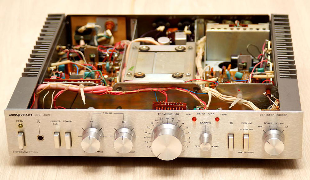 Усилитель низкой частоты *Амфитон 25У-002С* с 1983 года выпускало Львовское ПО имени Ленина (ПО Лорта). Усилитель предназначен для высококачественного усиления сигналов от различных источников. Основные технические характеристики: Диапазон воспроизводимых частот: 20...25000 Гц. Неравномерность АЧХ в диапазоне 20...25000 Гц: ±0,7 дБ. Сопротивление подключаемых АС: 4 Ом. Выходная мощность на канал: номинальная: 25 Вт, максимальная: 100 Вт. Коэффициент гармоник в диапазоне 40...16000 Гц: 0,13%. Переходное затухание между каналами на частоте: 250 Гц и 10000 Гц: 38 дБ, 1000 Гц: 48 дБ. Отношение сигнал/взвешенный шум в номинальных условиях на входах: линейных мф и тюнер: 83 дБ, корректирующего зс: 72 дБ. Пределы регулировки: звуковых частот: 10 дБ, стереобаланс: ±26 дБ, тембр НЧ: ±11 дБ, тембр ВЧ: ±10 дБ, ручная регулировка громкости: 60 дБ. Потребляемая мощность от сети: 105 Вт. Размер усилителя: 387х88х390 мм. Вес: 9 кг.