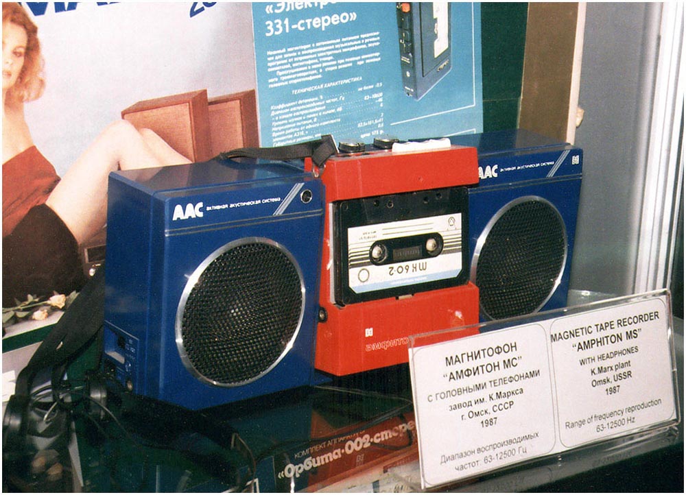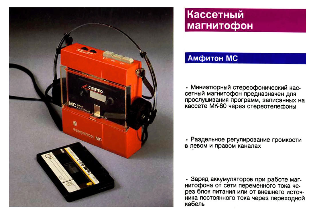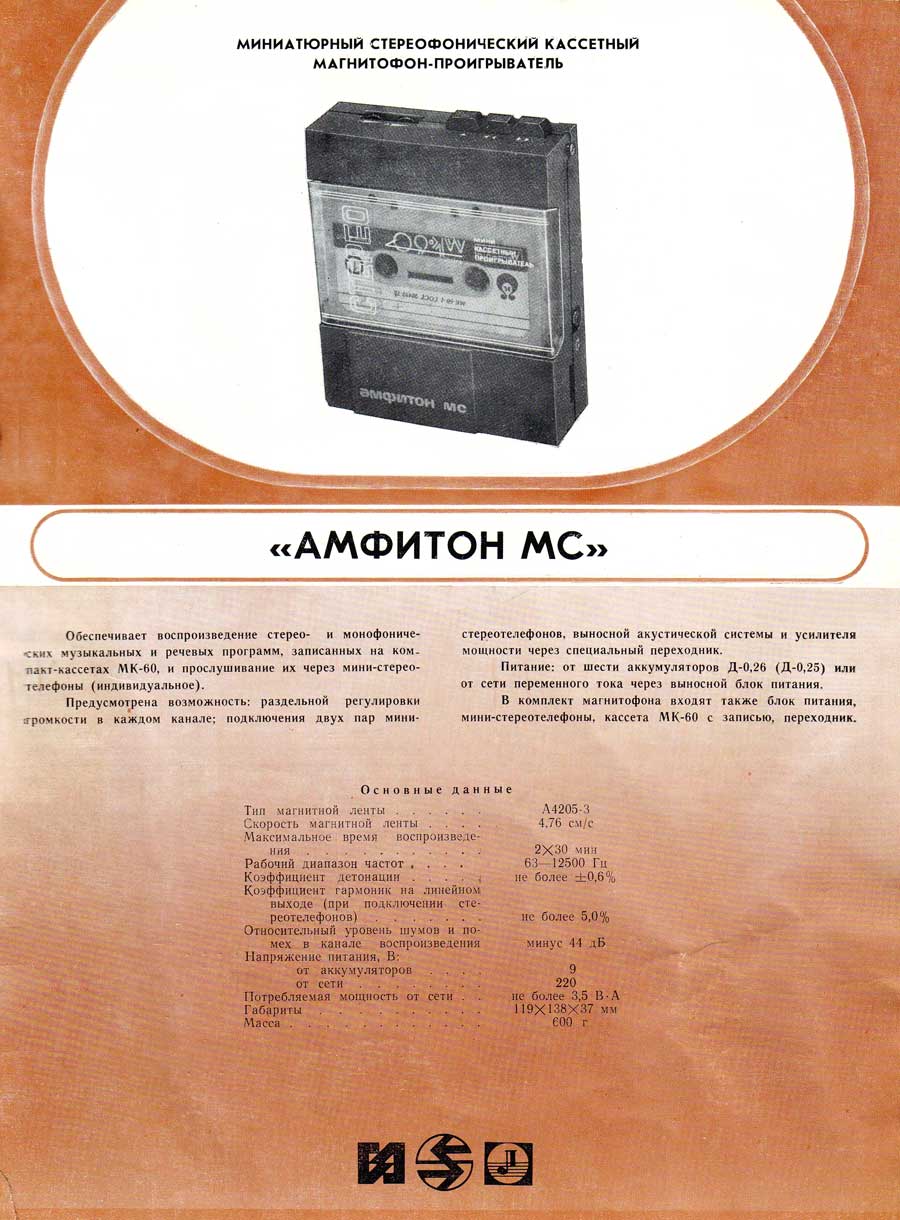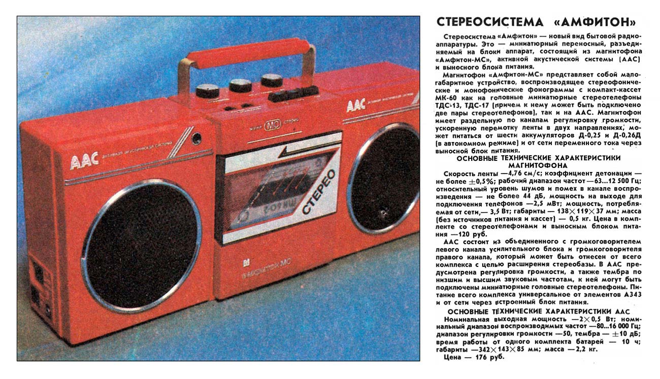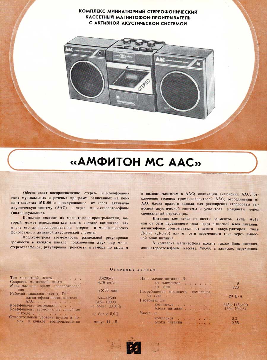 Стереосистема *Амфитон* с 1987 года выпускалась Омским ЭТЗ К. Маркса. **Амфитон** переносный блочный аппарат, состоящий из магнитофона - проигрывателя **Амфитон-МС**, стереофонической акустической системы *ААС* и блока питания. **Амфитон ААС** состоит из объединенного с АС левого канала усилителя низкой частоты и АС правого канала. В блоке ААС имеется регулировка громкости и тембра низких и высоких частот, к ней можно подключить стереотелефоны. Питается акустический блок (ААС) от батарей А-343 или от сети через встроенный блок питания. Номинальная выходная мощность ААС - 2х0,5 Вт. Диапазон частот на ЛВ - 80...16000, по звуковому давлению 150...10000 Гц. Время работы от батарей 10 часов. Габариты основного блока 342х143х85 мм; масса 2,2 кг. Цена комплекта из ААС *Амфитон*, МП *Амфитон МС* и блока питания - 176 рублей.