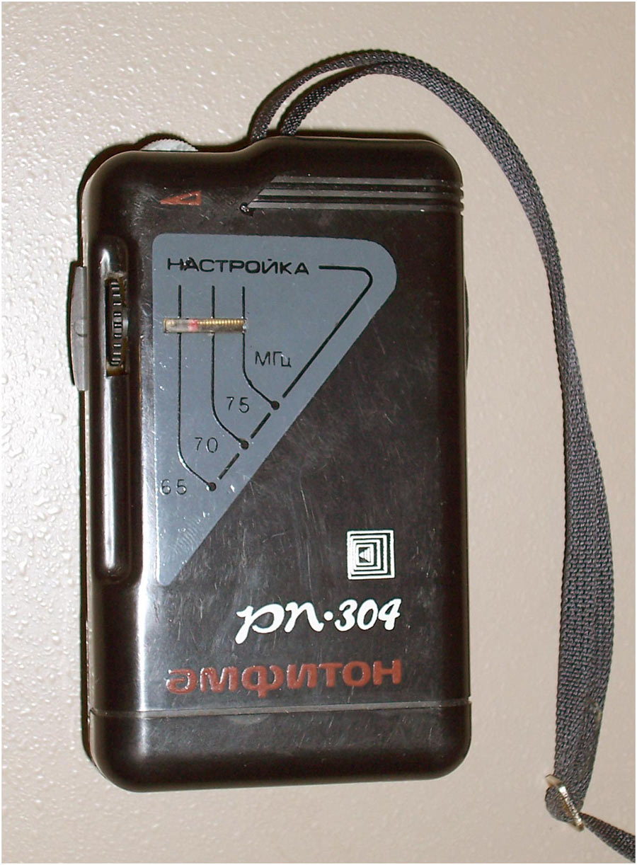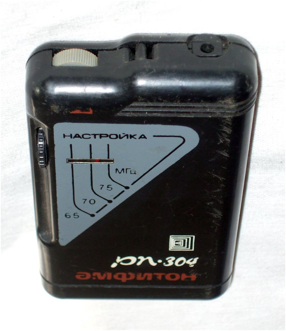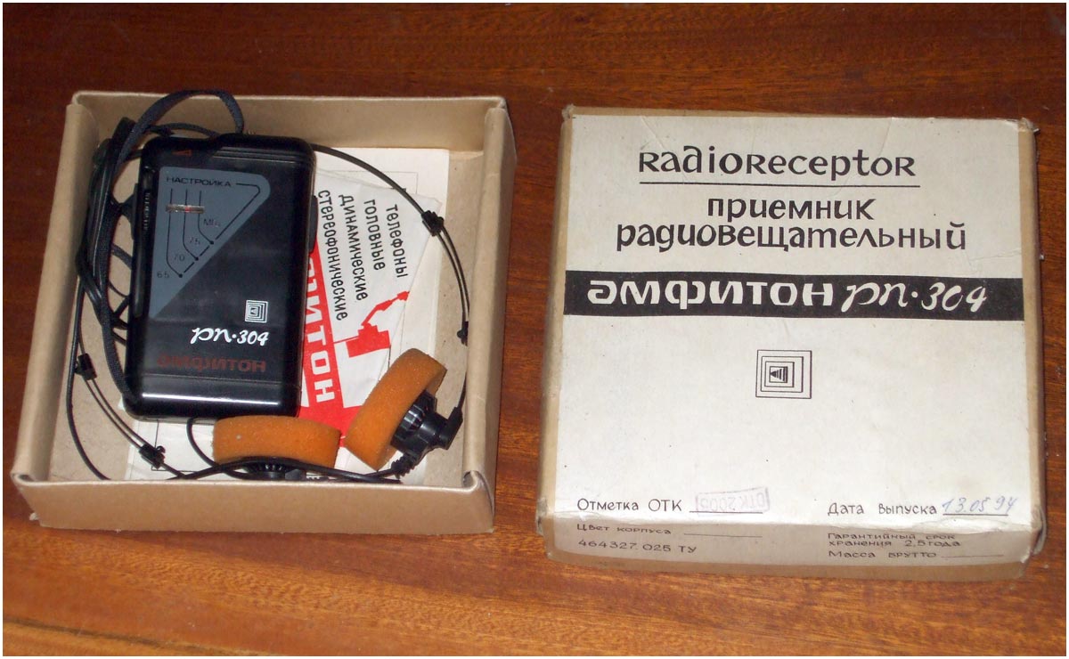 Малогабаритный радиоприёмник *Амфитон РП-304* с 1994 года выпускало Кишинёвское ПО *Счётмаш*. Приёмник радиовещательный **Амфитон РП-304** предназначен для приёма сигналов радиовещательных станций в диапазоне УКВ-ЧМ. Прослушивание принимаемых передач осуществляется через головные стереофонические телефоны в режиме **моно**. Питание обеспечивается от одной батареи типа **Корунд**. Время работы при средней громкости составляет 30 часов, при работе не более 4 часов в сутки. Технические характеристики радиоприёмника: Диапазон принимаемых частот; 65,8...74 Мгц. Чувствительность, ограниченная шумом, при отношении сигнал/шум 26 дБ, по напряжению со входа для внешней антенны 150 мкВ. Односигнальная избирательность по зеркальному каналу на частоте 69 Мгц - 18 дБ. Ток покоя 18 мА. Максимальная выходная мощность 100 мВт. Масса приёмника без батареи и наушников 100 гр. Габариты модели 105х66х28 мм.