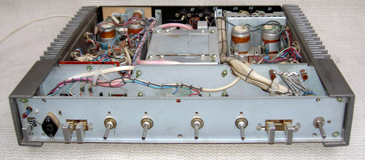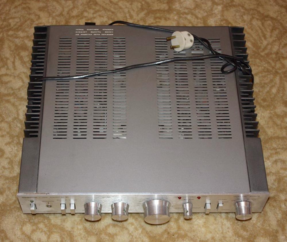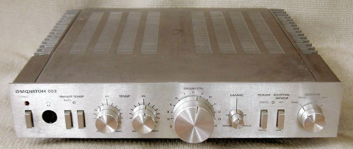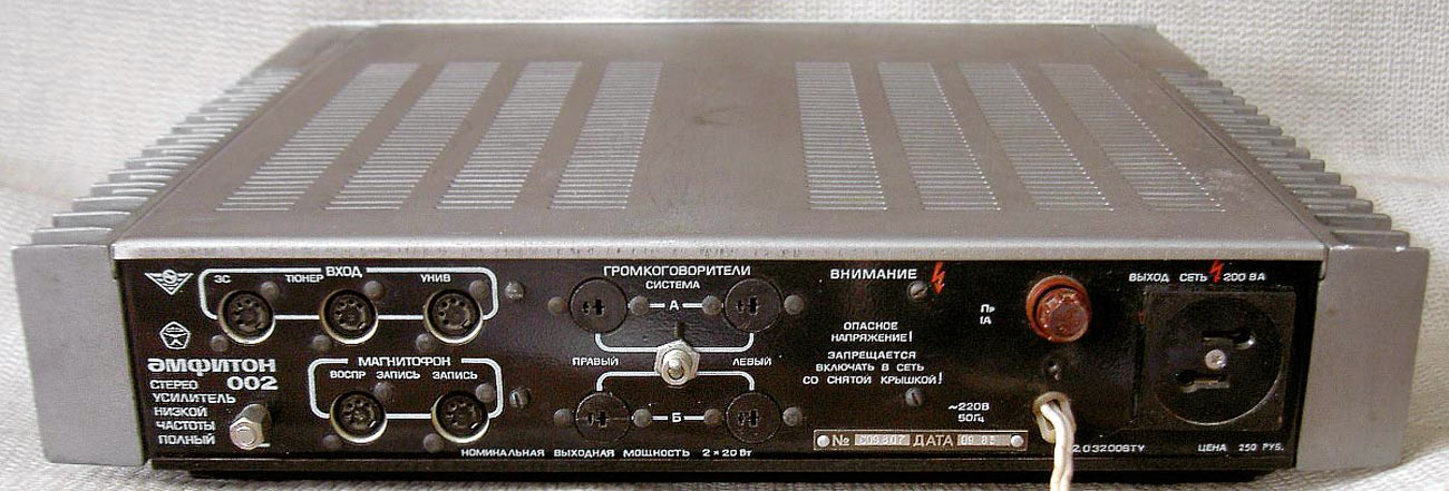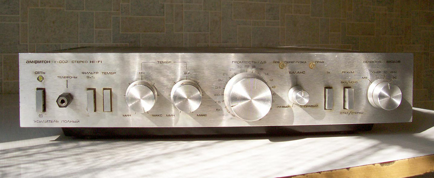 Стереофонический полный усилитель *Амфитон У-002-стерео* с 1983 года выпускало Львовское ПО им. Ленина. Усилитель высшей группы сложности **Амфитон У-002-стерео** обеспечивает высококачественное усиление фонограмм в стерео и моно режимах при работе от различных источников. В нём предусмотрены: возможност оперативного выбора источника сигнала с помощью переключателя **Селектор**; ограничительные фильтры по высшим и инфранизким звуковым частотам; наличие двух режимов работы (режим стерео и моно); регуляторы тембра по ВЧ и НЧ: регулировка уровня громкости с тонкомпенсацией; перевод усилителя в режим линейного усиления; слуховой контроль качества записываемого сигнала на магнитофон; электронная защита от коротких замыканий на выходе УНЧ; автоматическое отключение акустических систем при неисправности усилителя. Выходная номинальная мощность 2х25 Вт. Диапазон рабочих частот 20...25000 Гц. Коэффициент гармоник 0,15%. Габариты аппарата 390х88х390 мм, масса 9 кг. Цена 250 руб.