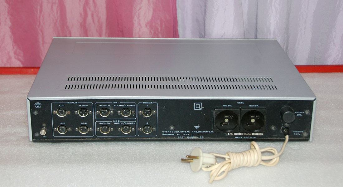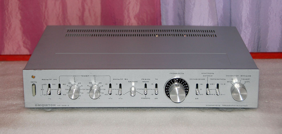 Предварительный усилитель *Амфитон УП-003-стерео* с 1986 года выпускало Львовское ПО имени Ленина. ПУ высшей группы сложности предназначен для высококачественного усиления, управления и коммутации стереофонических сигналов при работе от разных источников фонограмм и рассчитан на совместную работу с УМ. В нём имеется: возможность оперативного выбора источников фонограмм; дискретные регуляторы ВЧ, НЧ и громкости, с возможностью переключения глубины тонкомпенсации и её отключения; ограничительные фильтры по ВЧ, НЧ и инфранизким частотам; режимы работы стерео, моно, реверс; возможность подключения 2-х магнитофонов; наличие двух выходов для подключения УМ или эквалайзера. Краткие технические характеристики УП: Диапазон рабочих частот 20...25000 Гц. КНИ в диапазоне частот 20...20000 Гц 0,01%. Отношение сигнал/взвешенный шум для входов: линейного 90, корректирующих 76 дБ. Диапазон тембра НЧ ±12,5 дБ, ВЧ ±12,5 дБ. Потребляемая мощность 20 Вт. Габариты ПУ 460х91х363 мм. Масса 6,5 кг. Цена 230 рублей. Предварительный усилитель был разработан ещё в 1982 году, была выпущена и небольшая опытная партия, однако серийный выпуск начался только с января 1986 года.
