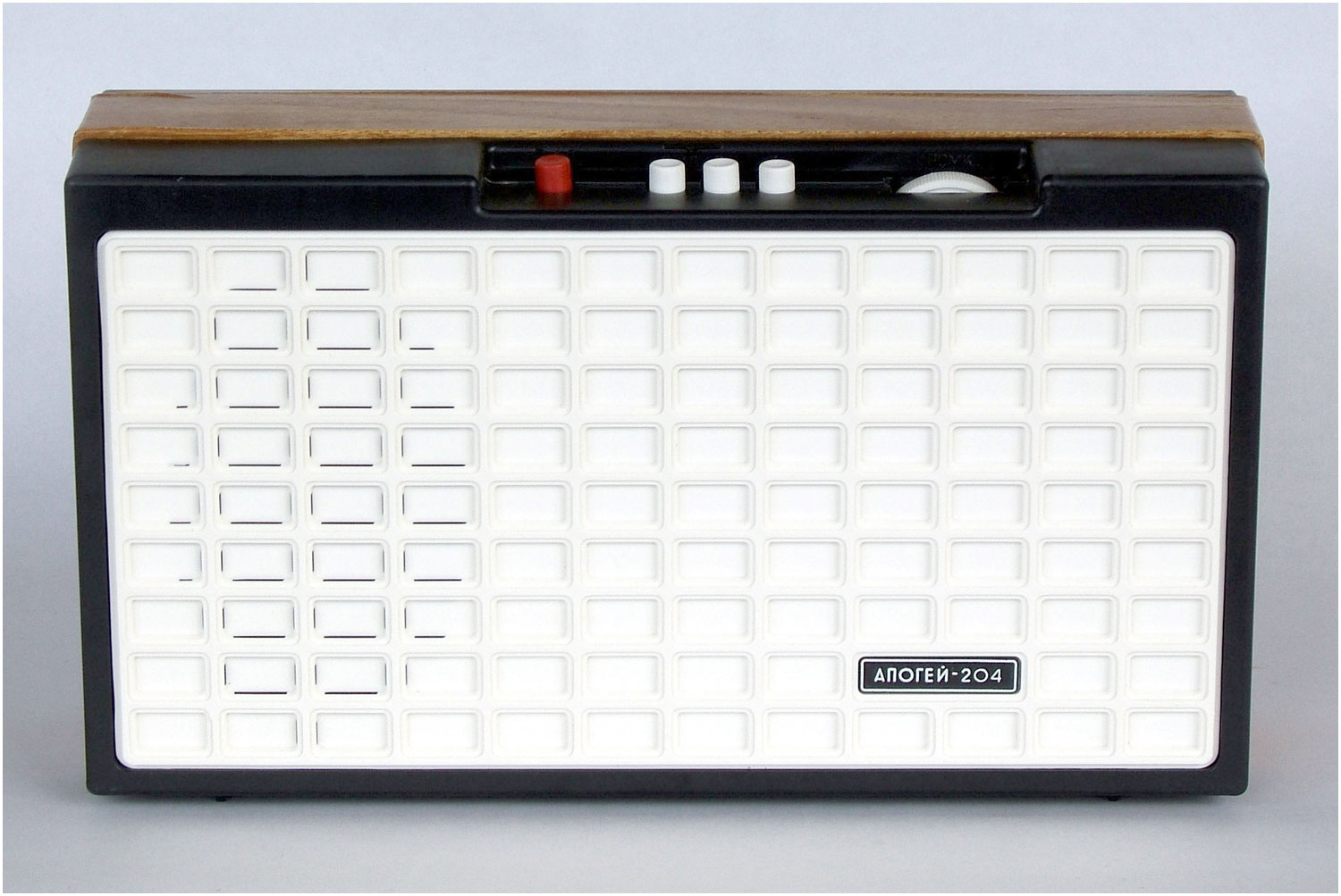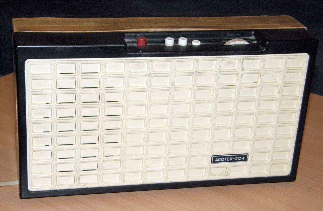 Приёмник трёхпрограммный *Апогей-204* с 1986 года выпускал Кимовский радиоэлектромеханический завод. ПТ предназначен для приёма и воспроизведения трёх радиопрограмм, передаваемых по уплотнённым проводным радиотрансляционным сетям. Основная низкочастотная программа принимается с усилиением или без усиления. Диапазон рабочих частот по НЧ каналу 100...1000 Гц, по ВЧ каналам 100...6300 Гц. Номинальная выходная мощность 300 мВт. Потребляемая мощность 4 Вт. Габариты 325х98х185 мм. Вес 2 кг.
