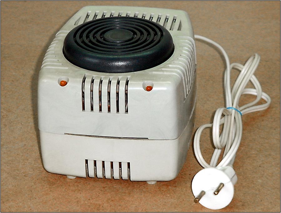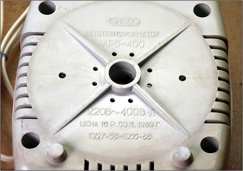 Автотрансформатор регулировочный бытовой *АРБ-400* с I-кв 1989 года выпускало Производственное Объединение *Эльво*. Автотрансформатор служит для ручного поддержания относительно стабильного напряжения в 220 вольт при медленных изменении напряжения электрической сети от 150 до 250 вольт при мощности в нагрузке до 400 ватт. Индикатором напряжения 220 вольт являются погасшие светодиоды. Если напряжение в сети меньше нормы загорается левый светодиод, больше правый. Автотрансформатор можно использовать для питания любой элетротехнической и радиотелевизионной аппаратуры.