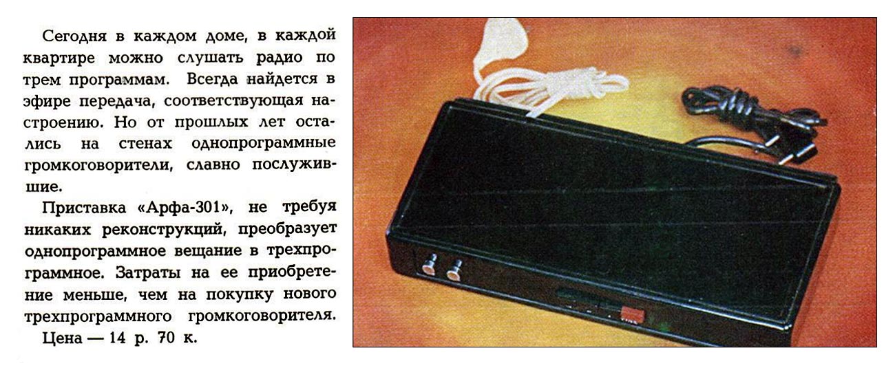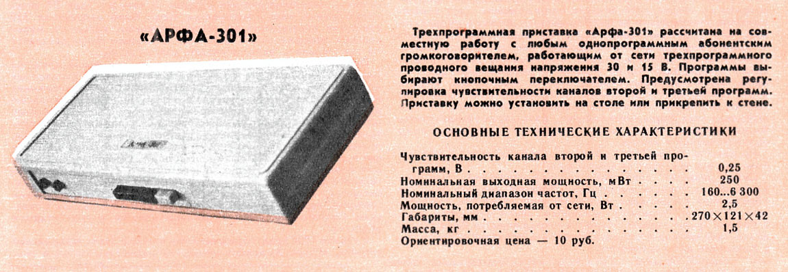 Приставка трёхпрограммная *Арфа-301* с 1981 года выпускалась Рыбинским заводом приборостроения. Приставка рассчитана на работу вместе с абонентским громкоговорителем и работает в сети трехпрограммного проводного вещания с напряжением 30 или 15 В. В ПТ имеется регулировка чувствительности ВЧ каналов. Приставку можно установить на стол или прикрепить к стене. Чувствительность ВЧ каналов - 0,25 В. Номинальная выходная мощность - 250 мВт. Диапазон воспроизводимых звуковых частот на выходе приставки 160...6300 Гц. Потребляемая мощность от сети 2,5 Вт. Габариты приставки 270х121х42 мм, вес 1,5 кг.