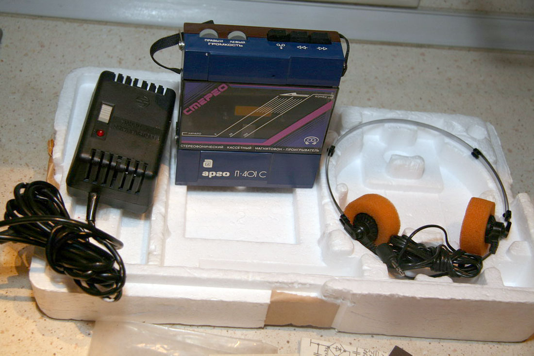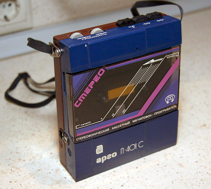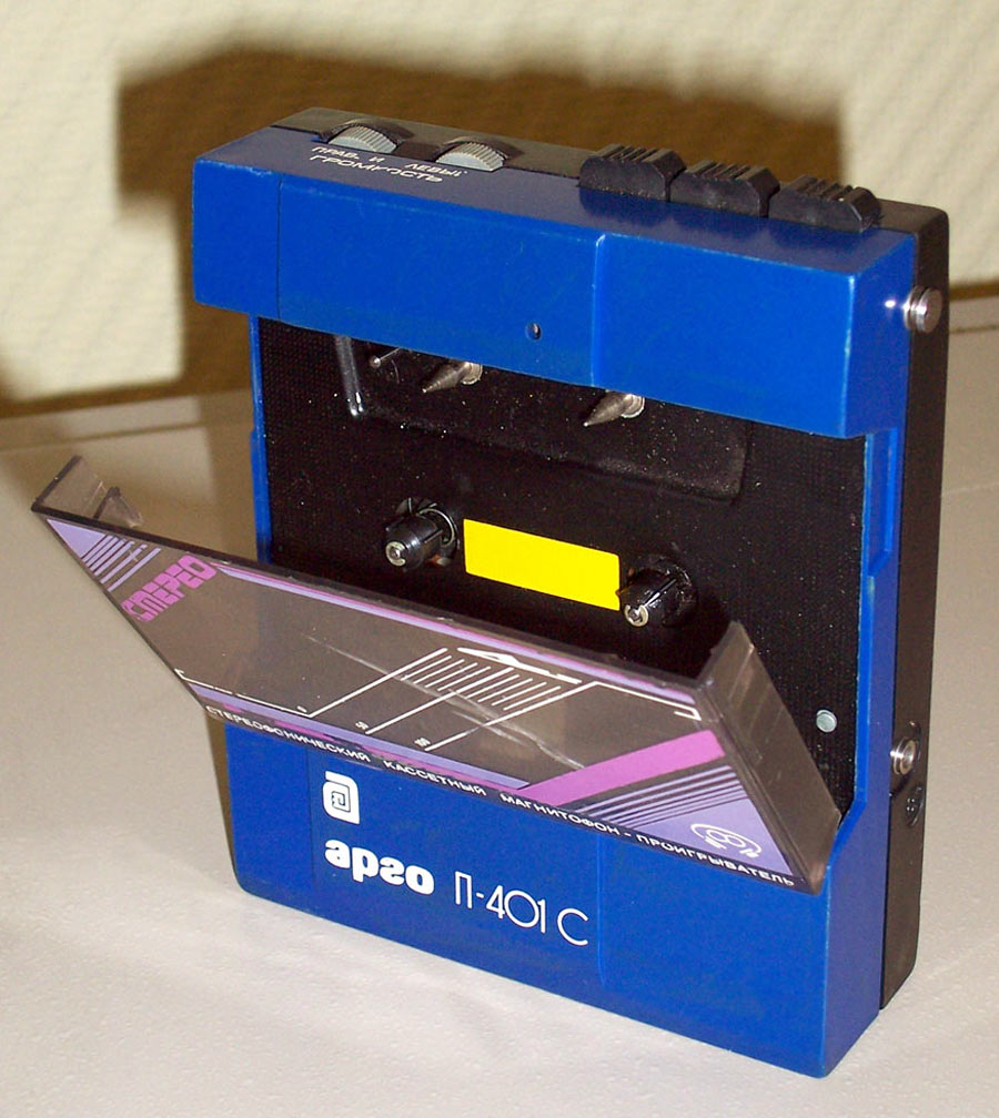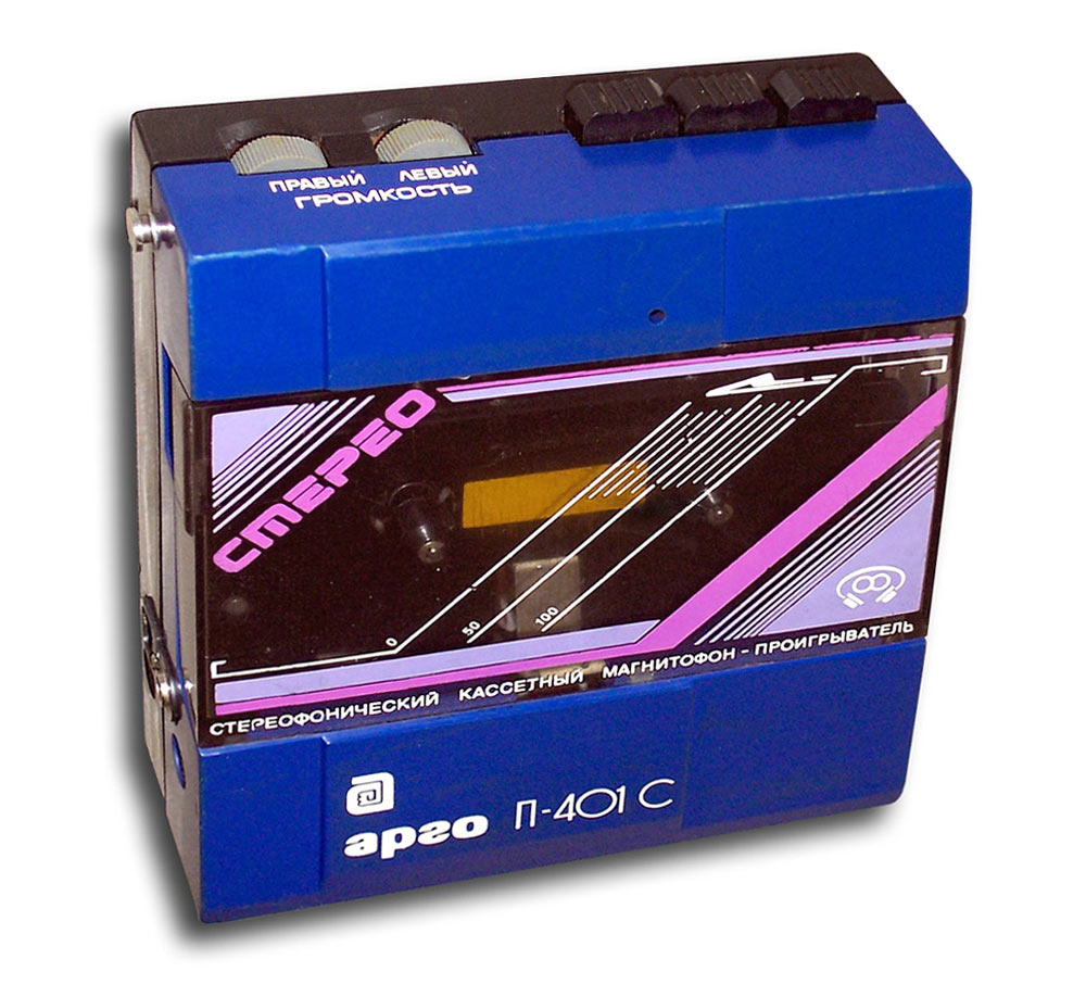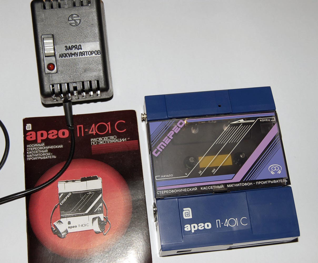 Кассетный магнитофон-проигрыватель *Арго П-401С* с начала 1991 года выпускало Ленинградское ЦНПО *Ленинец*. Стереофонический кассетный магнитофон-проигрыватель **Арго П-401С** предназначен для воспроизведения фонограмм, записанных на кассетах МК-60 и прослушивания их через головные стереотелефоны. Работоспособность магнитофона обеспечивается при питании: от сети через блок питания; от комплекта аккумуляторов Д-0,26Д. Магнитофон обеспечивает: воспроизведение и прослушивание записи через телефоны; перемотку ленты в обоих направлениях; раздельное регулирование громкости по каналам; заряд аккумуляторов при работе от сети. Время непрерывной работы от комплекта заряженных аккумуляторов 2,5 часа. Технические характеристики: Мощность, потребляемая от сети 3,5 Вт. Скорость ленты 4,76 см/сек. Детонация ±0,6%. Частотный диапазон воспроизведения 63...10000 Гц. Коэффициент гармоник 5%. Отношение сигнал/шум в канале воспроизведения -40 дБ. Время перемотки магнитной ленты в кассете МК-60 не более 180 сек. Масса МП с аккумуляторами 0,6 кг. Масса БП - 0,3 кг. Габариты МП - 119х138х37 мм, БП - 63х107х85 мм.