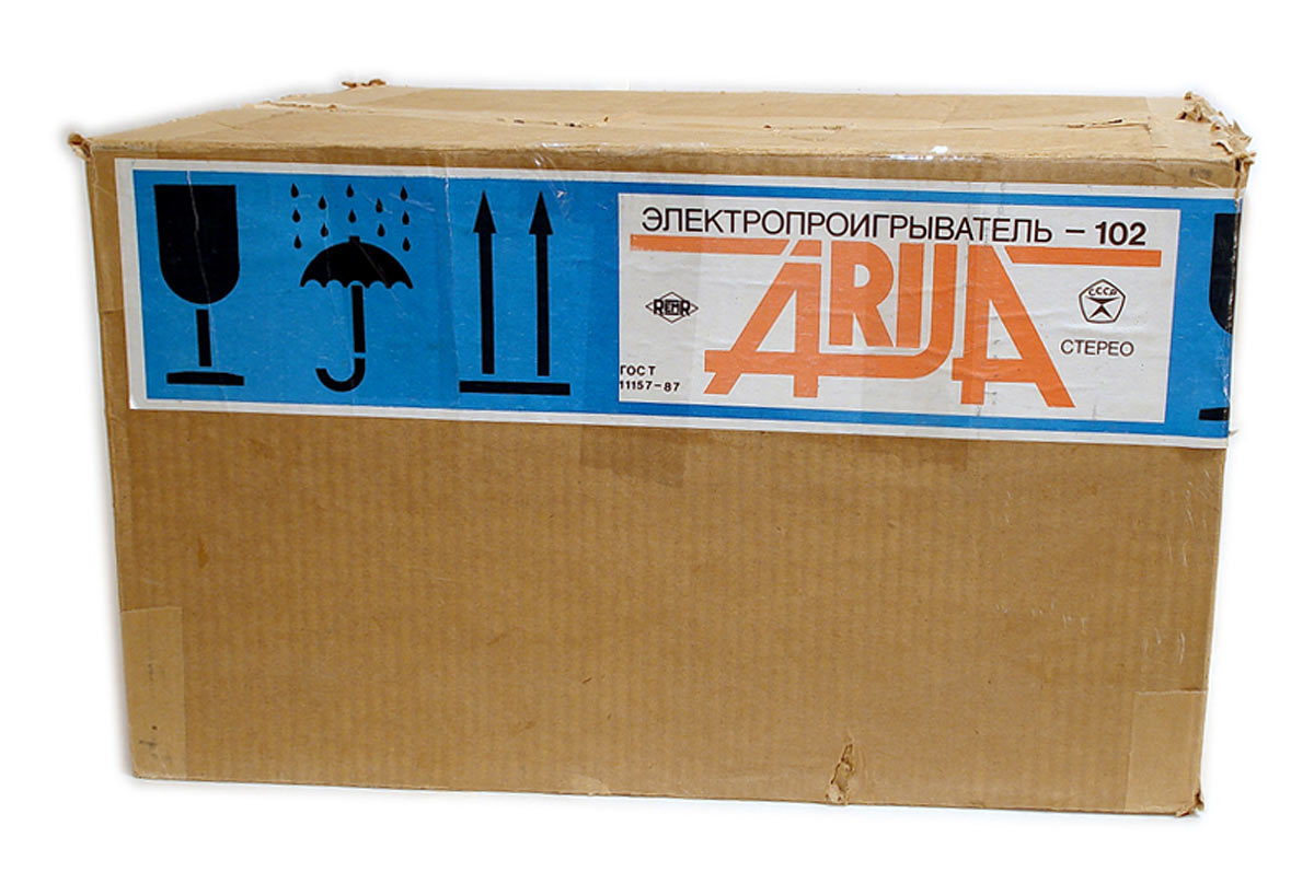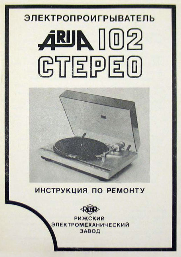 Электропроигрыватель *Ария-102-стерео* с 1986 года выпускало ПО *Радиотехника*. Электропроигрыватель 1 группы сложности *Ария-102-стерео* предназначен для воспроизведения через внешние УКУ моно и стереофонических грамзаписей с грампластинок любых форматов. В ЭП применен прямой электромеханический привод диска. В ЭП применяется магнитный звукосниматель типа ГЗМ-155. Применен полный электронный автостоп, обеспечивающий подъем микролифта и выключение ЭП при окончании проигрывания грампластинки или при нажатии кнопки *0*; автоматический подъем микролифта при случайном отключении ЭП от сети. Проигрывание пластинки может осуществляться с закрытой пылезащитной крышкой. Частота вращения диска ЭПУ 33/45 об/мин. Диапазон воспроизводимых частот 20...20000 Гц. Коэффициент детонации на частоте вращения 33 об/мин 0,12 %. Прижимная сила звукоснимателя 10 мН. Пределы подстройки частоты вращения диска не менее 2 %. Напряжение питания ЭП от сети переменного тока, с частотой 50 Гц, 220 В. Потребляемая мощность - 10 Вт. Габаритные размеры ЭП - 430 х 335 х 135 мм. Его масса - 7,5 кг.
