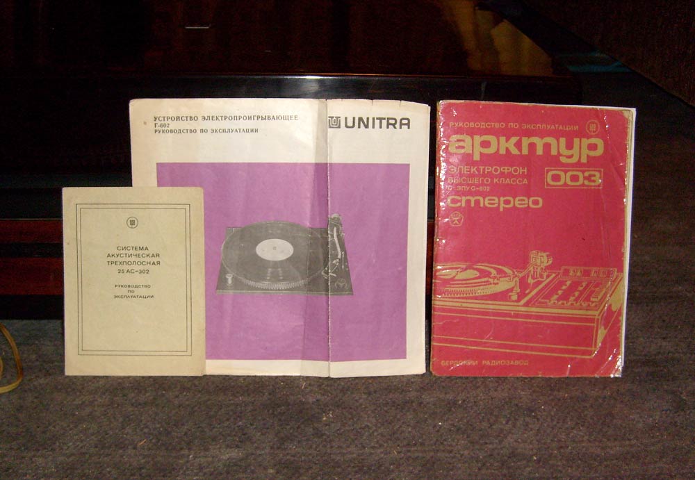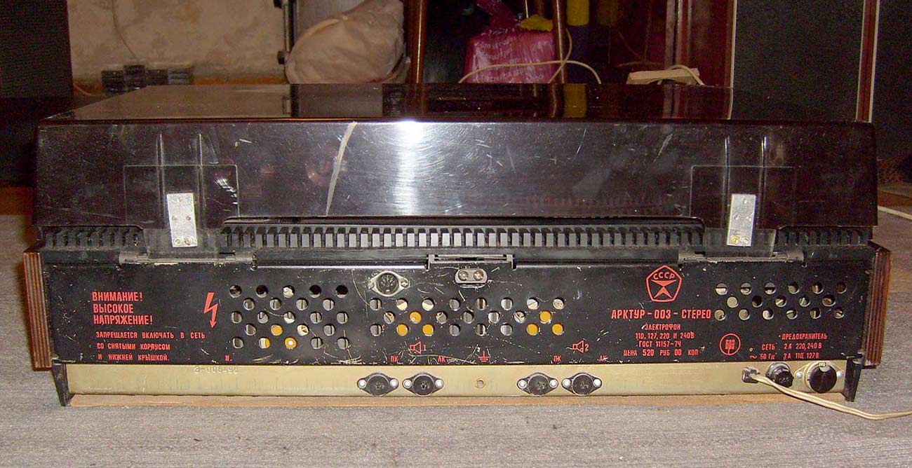 Электрофон сетевой транзисторный *Арктур-003 стерео* с I-кв 1977 года выпускал Бердский радиозавод. Стереофонический электрофон высшей группы сложности **Арктур-003-стерео** - предназначен для воспроизведения записей с моно или стерео грампластинок с частотами вращения диска 33 и 45 об/мин. Электрофон *Арктур-003 стерео* разработан на базе серийного усилительно-коммутационного устройства **Арктур-001-стерео**. Кроме регуляторов громкости и тембра по НЧ и ВЧ частотам, в электрофоне имеются коммутируемые фильтры НЧ и ВЧ частот с помощью которых можно сузить, расширить и выделить полосу воспроизводимых частот, активный фильтр **присутствия**, а так же стрелочные индикаторы выходных уровней обоих усилителей стереоканалов. В новом электрофоне применено ЭПУ G-600 В (ПНР) или другое подобное с магнитной головкой звукоснимателя. Частота вращения диска устанавливается по встроенному стробоскопу. Электрофон комплектуется двумя трехполосными громкоговорителями типа 25АС-2. Номинальный диапазон воспроизводимых частот по звуковому давлению 40...20000 Гц. Синусоидальная номинальная выходная мощность 25 Вт. Уровень фона по напряжению при синусоидальной выходной мощности -50 дБ. Коэффициент детонации ЭПУ ±0,1 %. Потребляемая от электросети мощность 150 Вт. Габариты электропроигрывателя 615х385х200 мм, одной АС - 480х285х250 мм. Масса электропроигрывателя с усилителем НЧ - 22 кг.