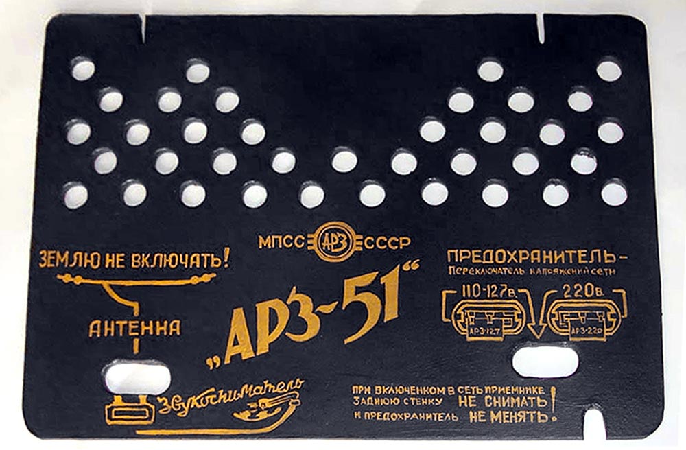 Радиоприёмник сетевой ламповый *АРЗ-51* с 1951 года выпускал Александровский радиозавод. Радиоприёмник **АРЗ-51** заменил модель **АРЗ-49**. Основные отличия новой модели от предыдущей отмечены в замене лампы выходного каскада на 6П6С и упрощении некоторых схемных элементов. Изменилась схема блока питания на двухполупериодную с кенотроном 6Ц5С. По внешнему виду, габаритам и массе приёмник почти не отличался от предыдущего. Диапазоны рабочих частот: ДВ 150...415 кГц, СВ 520...1600 кГц. Промежуточная частота 110 кГц. Чувствительность модели около 300 мкВ. Чувствительность с гнёзд звукоснимателя 0,25 В. Избирательность по соседнему каналу при расстройке на 10 кГц не менее 20 дБ. Избирательность по зеркальному каналу 15 дБ. Диапазон воспроизводимых звуковых частот не уже 200...3000 Гц. Выходная мощность на новом громкоговорителе 1ГД-1 при КНИ 10% около 0,5 Вт. Потребляемая от сети мощность 40 Вт.