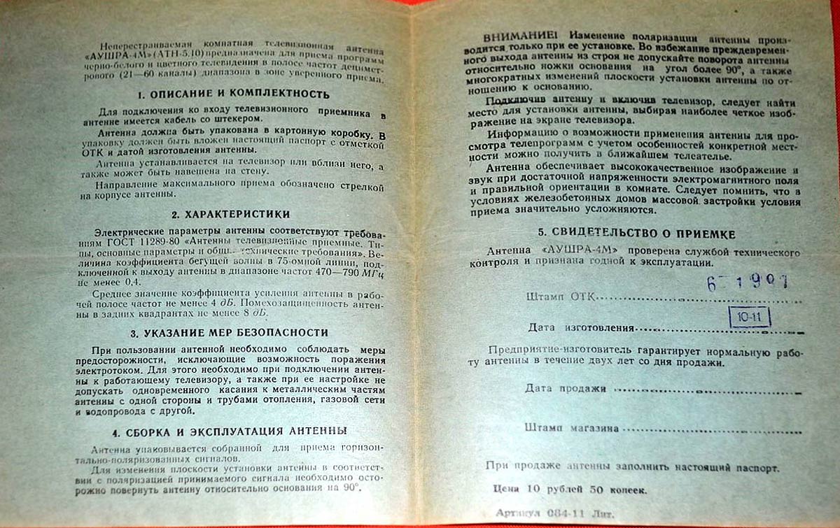 Антенна комнатная телевизионная ДМВ диапазона *Ашура-4М* (АТН-5.10) выпускалась предположительно с 1987 года Вильнюсским заводом радиоизмерительных приборов.
