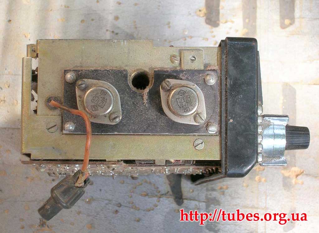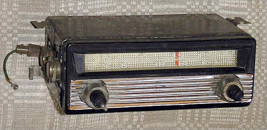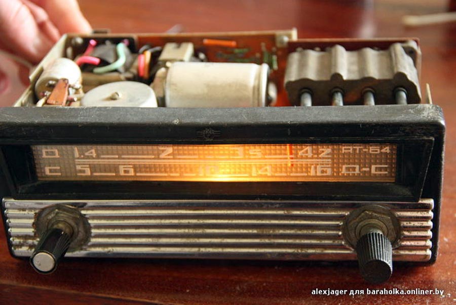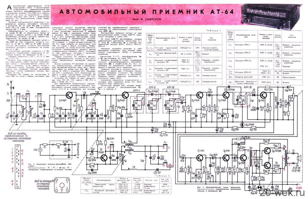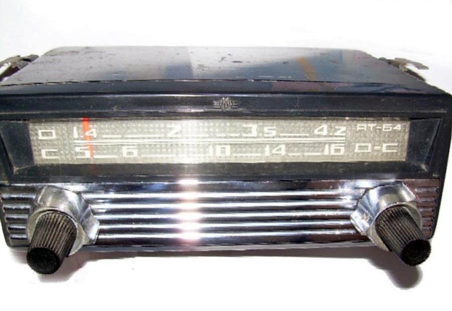 Радиоприёмник автомобильный **АТ-64** с 1964 года выпускал Муромский радиозавод. Представляет собой 11-ти транзисторный супергетеродин работающий в диапазонах ДВ и СВ на автомобилях с напряжением аккумулятора 12 В. Чувствительность модели в диапазоне ДВ 200 мкВ, СВ 60 мкВ. ПЧ 465 кГц. Избирательность по соседнему каналу 30 дБ, зеркальному 40 дБ. Полоса воспроизводимых звуковых частот 120...4000 гц. При изменении входного сигнала на 40 дБ (4000...40 мкВ) АРУ обеспечивает изменение выходного напряжения на 6 дБ. Номинальная выходная мощность 2 Вт. Мощность потребляемая от аккумулятора 10 Вт. Габариты РП - 200х131х77 мм, его масса без упаковки и громкоговорителя 2,1 кг.