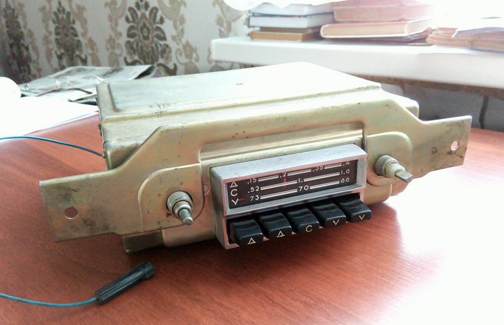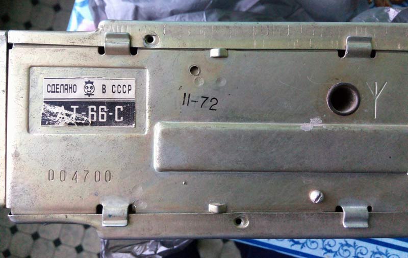 Радиоприёмник автомобильный *АТ-66* с 1966 года серийно выпускал Муромский радиозавод. Рассчитан для установки в автомобиль ГАЗ-24 (Волга) и приём станций в диапазоне длинных (150...408 кГц), средних (520...1605 кГц) волн и в УКВ (65,8...73 МГц) диапазоне. Чувствительность на ДВ - 150 мкВ, СВ - 50 мкВ, УКВ - 5 мкВ. Избирательность по соседнему каналу 34 дБ, по зеркальному в ДВ - 40, СВ - 36, УКВ - 30 дБ. АРУ в диапазонах ДВ, СВ обеспечивает изменение выходного напряжения на 8 дБ, при изменении входного сигнала на 40 дБ. Номинальная выходная мощность 5 вт. Неравномерность АЧХ в полосе 80...8000 Гц не превышает 3 дБ. Коэффициент нелинейных искажений 5%. Пределы регулировки тембра от +6 до -10 дБ. Питание от аккумулятора напряжением 12,8 вольт. Потребляемая приёмником мощность 18 вт. Размеры приёмника 247х115х270 мм, его масса 4 кг. Позднее радиоприёмники выпускались с индексами *С* Советский и *Е* Европейский экспортный вариант. Были радиоприёмники с индексом *Т* тропический вариант, рассчитанные на работу в жарком климате.