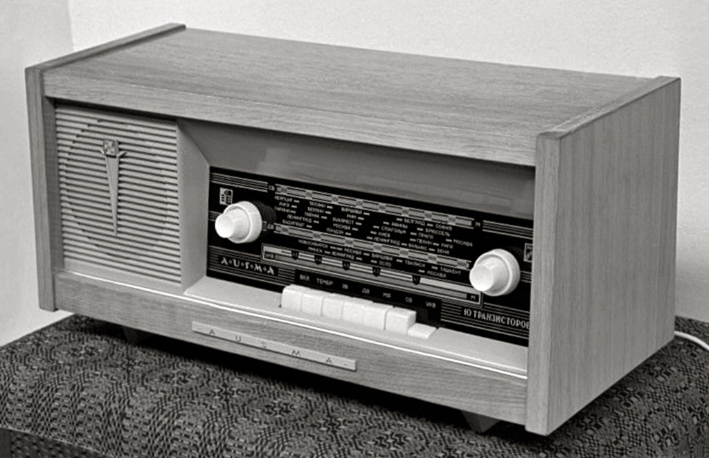 Ausma - по латышски рассвет. Стационарный транзисторный радиоприёмник *Аусма* в 1962 году опытной партией выпустил Рижский завод имени А.С.Попова. **Аусма** стал первым отечественным настольным транзисторным радиоприёмником с УКВ диапазоном и универсальным питанием. По сравнению с ранее выпускавшимися моделями, приёмник имеет лучшее звучание, устойчивость параметров при снижении питания, возможность приёма ЧМ станций. Приём ДВ и СВ станций ведётся на поворотную магнитную антенну, на УКВ на внешнюю. Питается приёмник от батарей напряжением 9 В или от электрической сети. Потребляемая мощность от сети 5 Вт. Номинальная выходная мощность на громкоговорителе 1ГД-3, зависит от питания: в батарейном режиме 150 мВт, в сетевом 500 мВт. Чувствительность с наружной антенной на ДВ, СВ - 20...100 мкВ, УКВ 2...10 мкВ. При работе магнитной антенны на ДВ, СВ - 0,2...0,8 мВ/м. Избирательность в АМ тракте 30 дБ, ЧМ 36 дБ. ПЧ 465 кГц и 8,4 МГц. Частотная характеристика по звуковому давлению, на ДВ, СВ - 120...6000 Гц, ЧМ - 120...12000 Гц. Коэффициент искажений в АМ тракте 6%, ЧМ 4%. Параметры стабильны при питании от батарей и сети. При снижении питания до 6,3 В чувствительность не меняется, но снижается выходная мощность и увеличивается КНИ. Корпус приёмника из дерева, с размерами 560х265х245 мм. Масса с батареями 8,5 кг.