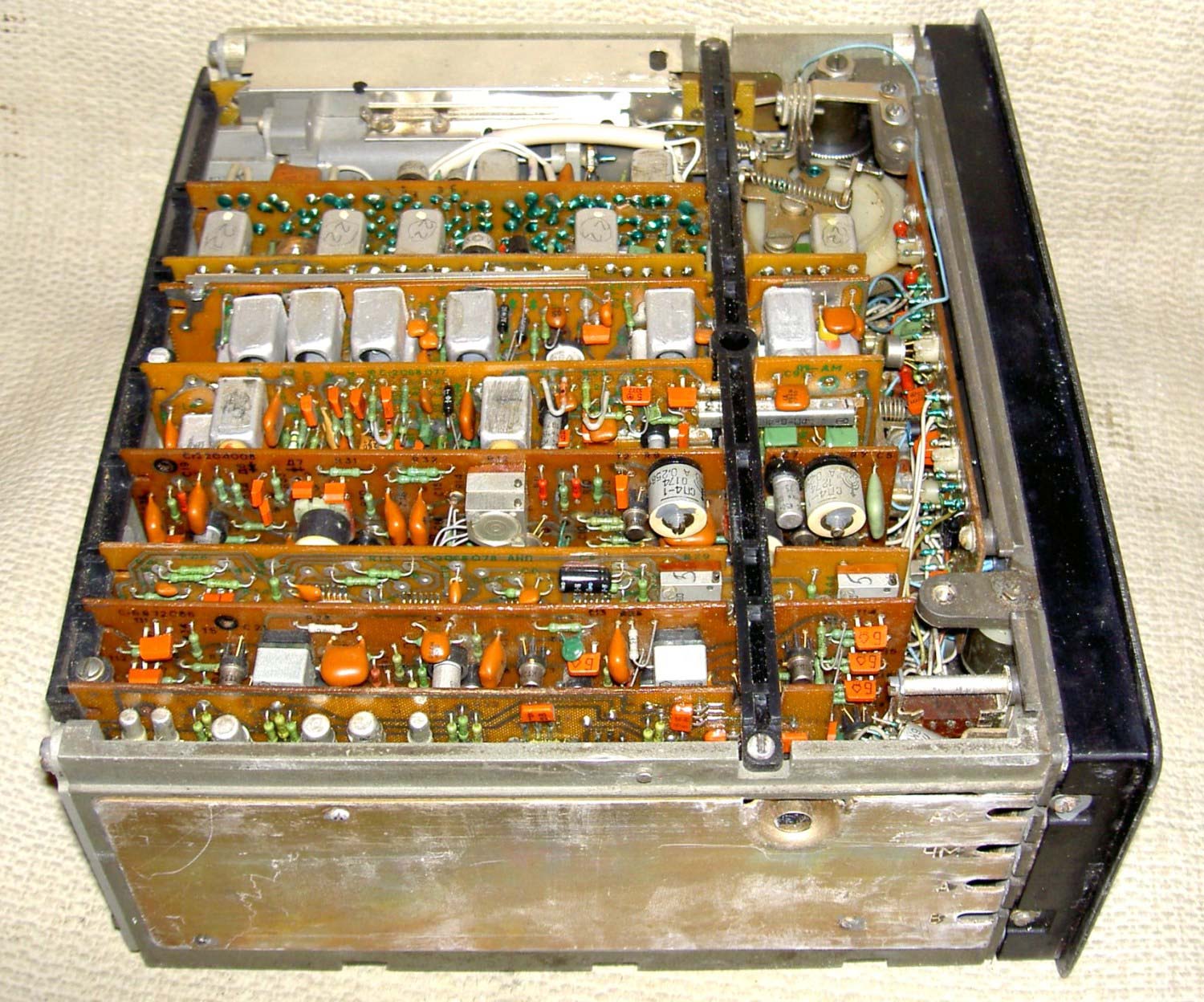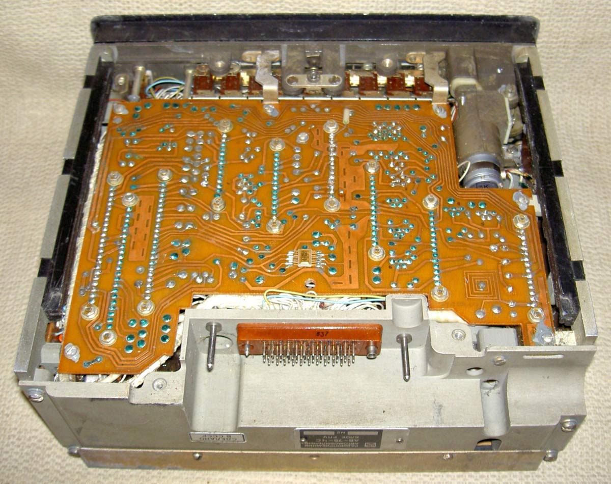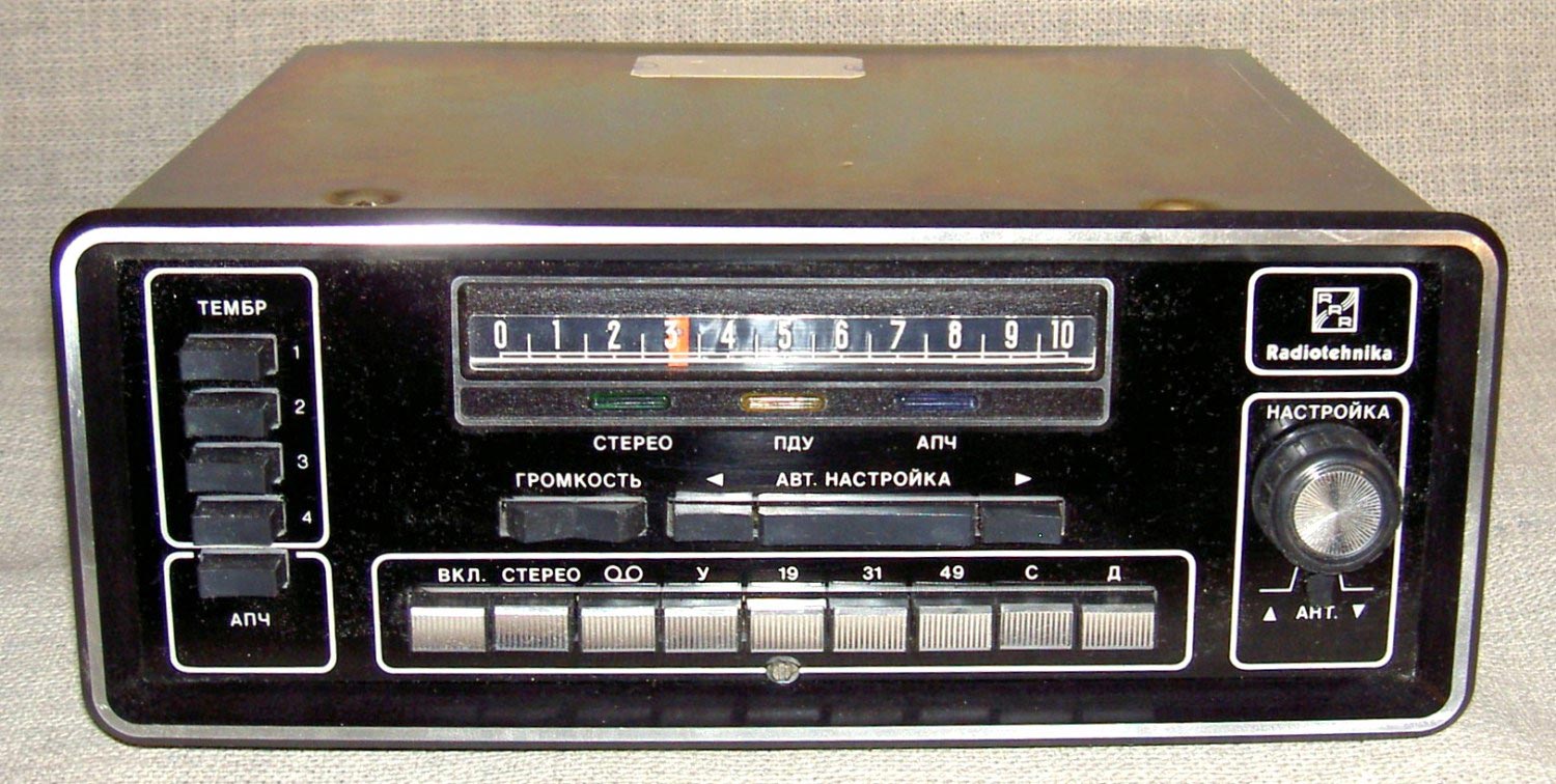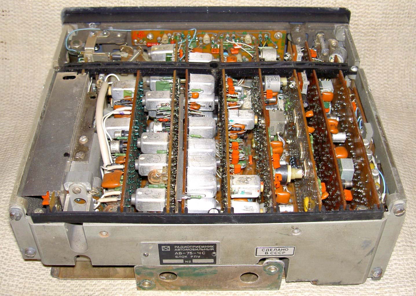 Радиоприёмник автомобильный *АВ-75* с 1975 года выпускал Рижский завод *Радиотехника*. Всеволновый автомобильный приёмник высшего класса **АВ-75** заменил ранее выпускавшийся приёмник **АВ-68**. Приёмник **АВ-75** предназначен для установки в автомобили ГАЗ-14 **Чайка** и ЗИЛ-115. Приёмник выпускали в четырёх модификациях **АВ-75-3С**, **АВ-75-3Е**, **АВ-75-ЧС** и **АВ-75-ЧЕ**. Буква в конце наименования указывает на марку автомобиля и диапазон УКВ, стандартный в СССР 65...74 МГц или европейский 88...108 МГц. Приёмник работает в диапазонах: ДВ, СВ, 3-х поддиапазонах КВ: 49, 31, 19 м и в диапазоне УКВ. В комплекте с приёмником идёт проводной (5 метров) пульт ДУ, автоматическая настройка на станции с возможностью 2-х стороннего поиска, автоматическая подстройка частоты, ступенчатая регулировка тембра по низким и высоким частотам, полосы пропускания по ПЧ. Приёмник имеет вход усилителя низкой частоты для подключения кассетной магнитофонной приставки. Конструктивно радиоприёмник *АВ-75* выполнен блочным способом.