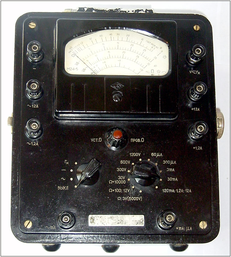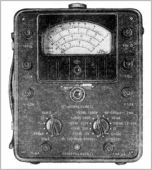 Ампервольтомметры *АВО-5М* и *АВО-5М1* соответственно с 1955 и с 1957 года выпускал Омский завод *Электроприбор*. Ампервольтомметр типа **АВО-5М** представляет собой многопредельный электроизмерительный прибор, используемый для измерения напряжения и величины переменного и постоянного тока а также и измерения сопротивлений до 30 Мегом. Многопредельный переносный ампервольтомметр магнитоэлектрической системы типа **АВО-5М1** предназначен для измерения силы тока и напряжения в цепях постоянного и переменного токов а также измерения сопротивления постоянному току. Прибор применяется при температуре окружающей среды от -10°С до +50 °С и относительной влажности воздуха 30...80%. Прибор имеет пределы измерения: Сила постоянного тока 60 мка, 300 мка, 3 ма, 30 ма, 120 ма, 1,2 а, 12 а. Напряжение постоянного тока З в, 12 в, 30 в, 300 в, 600 в, 1200 в, 6000 в. Сила переменного тока: 3 ма, 30 ма, 120 ма, 1,2 а, 12 а. Напряжение переменного тока 3, 12, 30, 300, 600, 1200, 6000 в. Прибор имеет сопротивление постоянному току: 3...300 ом, 0,3...30 ком, 0,03...3 Мгом. Прибор работает при децибелах сигнала от -12 до +78 дб. На больших пределах измерения применяются делителями напряжения. Входное сопротивление прибора 20 ком/в для всех пределов измерений постоянного напряжения и 2 ком/в для пределов переменного напряжения. Делители входят в комплект прибора.