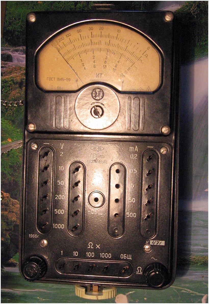 Комбинированный измерительный прибор *АВО-63* (Школьный) выпускался с начала 1963 года. Комбинированный измерительный прибор **АВО-63** (Школьный) предназначен для измерения постоянного и переменного напряжения от 0 до 1000 вольт, силы постоянного и переменного тока от 0 до 500 мА, а также сопротивления от 1 Ома до 2 Мом. Переключение режимов измерений ручное, путём вставки фазового щупа в соответствующее гнездо. Имеется переключатель для измерения постоянных или переменных величин и регулятор для выстовления концевой отметки на шкале при измерении сопротивлений. Класс точности прибора 2,5. Питание для работы омметра прибора состоит из 3-х элементов: ФБС-0,25, 1,3-ФМЦ-0,25, 332 или 336. В 1977 году прибор был обновлён, получив футляр из небьющейся пластмассы и новый стрелочный индикатор. Прибор был без крышки как предыдущий, но у него был футляр из железа серого с голубым цвета, с закрывающейся крышкой. Именовался прибор как *АВО-63* (Учебный).