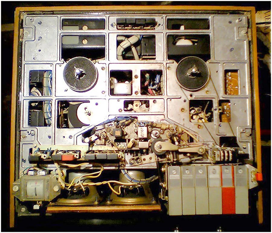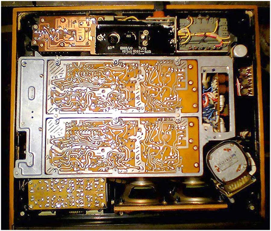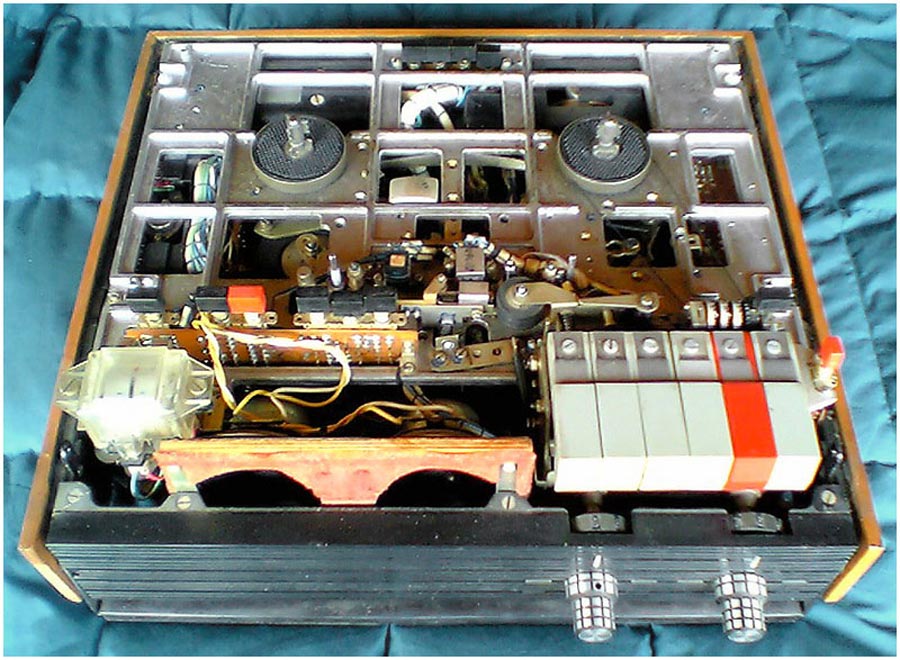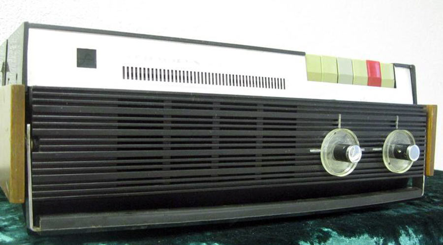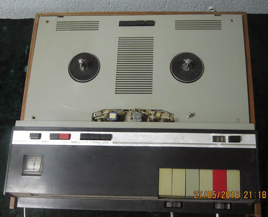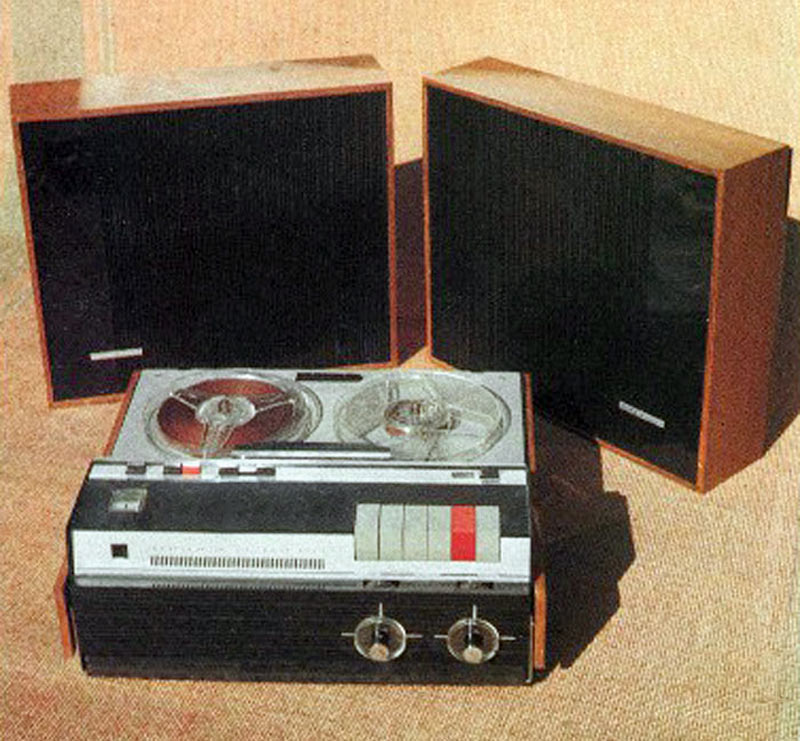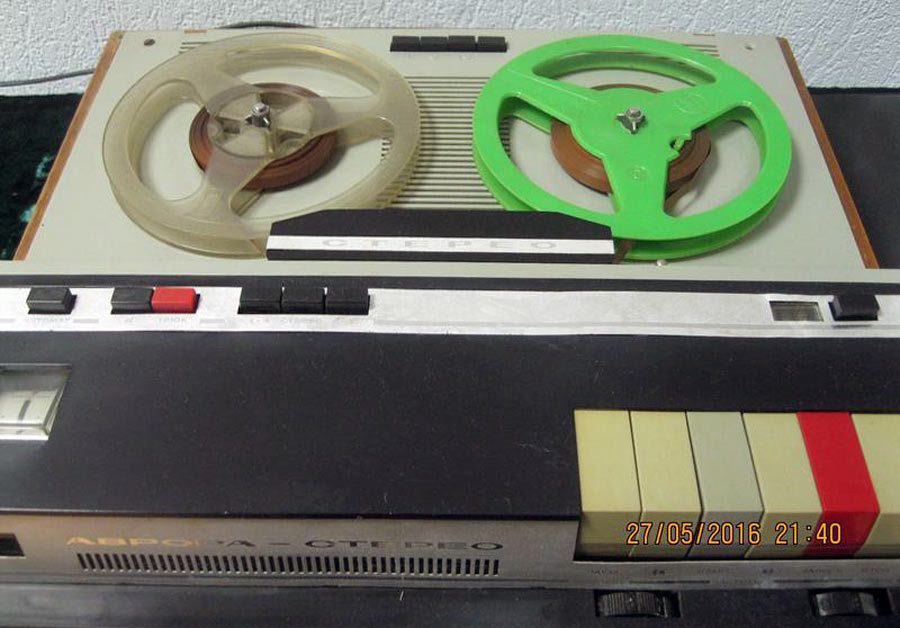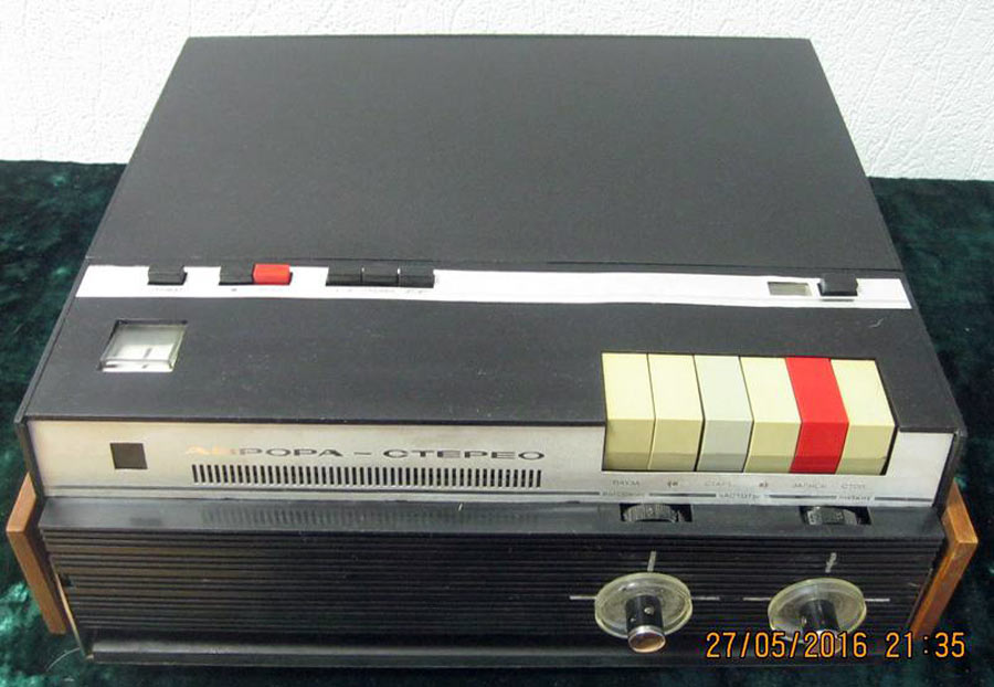 Стереофонический катушечный магнитофон *Аврора-стерео* с 1970 года выпускало Ленинградское НПО *Аврора*. Первый отечественный стереофонический транзисторный четырёхдорожечный катушечный магнитофон 2 класса **Аврора-стерео** (разработка 1967...1969 годов) выпускали небольшой серией с 1970 года, затем магнитофон был модернизирован и с 1971 года производился под наименованием *Аврора-201-стерео*. Внешний вид остался прежним, только регулятор стереобаланса был выведен третьей ручкой посередине, а в схеме скорректированы некоторые номиналы элементов. Магнитофон предназначен для записи или воспроизведения фонограмм от любого источника сигнала. Рассчитан на четырёхдорожечную запись в моно и стереофоническом режиме. Скорости движения ленты 19,06, 9,53 и 4,76 см/сек. Длительность записи и воспроизведения с катушками №15 с магнитной лентой типа 10 в стереорежиме на большей скорости 2х30 мин, на средней 2х60 мин, на меньшей 2х120 мин. В моно режиме время записи увеличивается в два раза. Номинальная выходная мощность 2 Вт, полоса рабочих частот звука 40...16000 Гц на скорости 19,06 см/сек, 63...12500 Гц на 9,53 см/сек и 63...6300 Гц на 4,76 см/сек. Относительный уровень помех в сквозном канале -40 дБ. Предусмотрена автоматическая и ручная регулировки уровня записи, регуляторы тембра НЧ и ВЧ, регулятор стереобаланса, счётчик расхода ленты, автостоп, срабатывающий в конце рулона, клавиша трюк, позволяющая накладывать новую запись на имевшуюся. Питание от сети. Потребляемая мощность 35 Вт. Размеры модели 336х378х130 мм, вес 10 кг. В каждой АС установлено по два громкоговорителя 2ГД-22. Размер АС 325х378х100 мм, масса 6,5 кг.