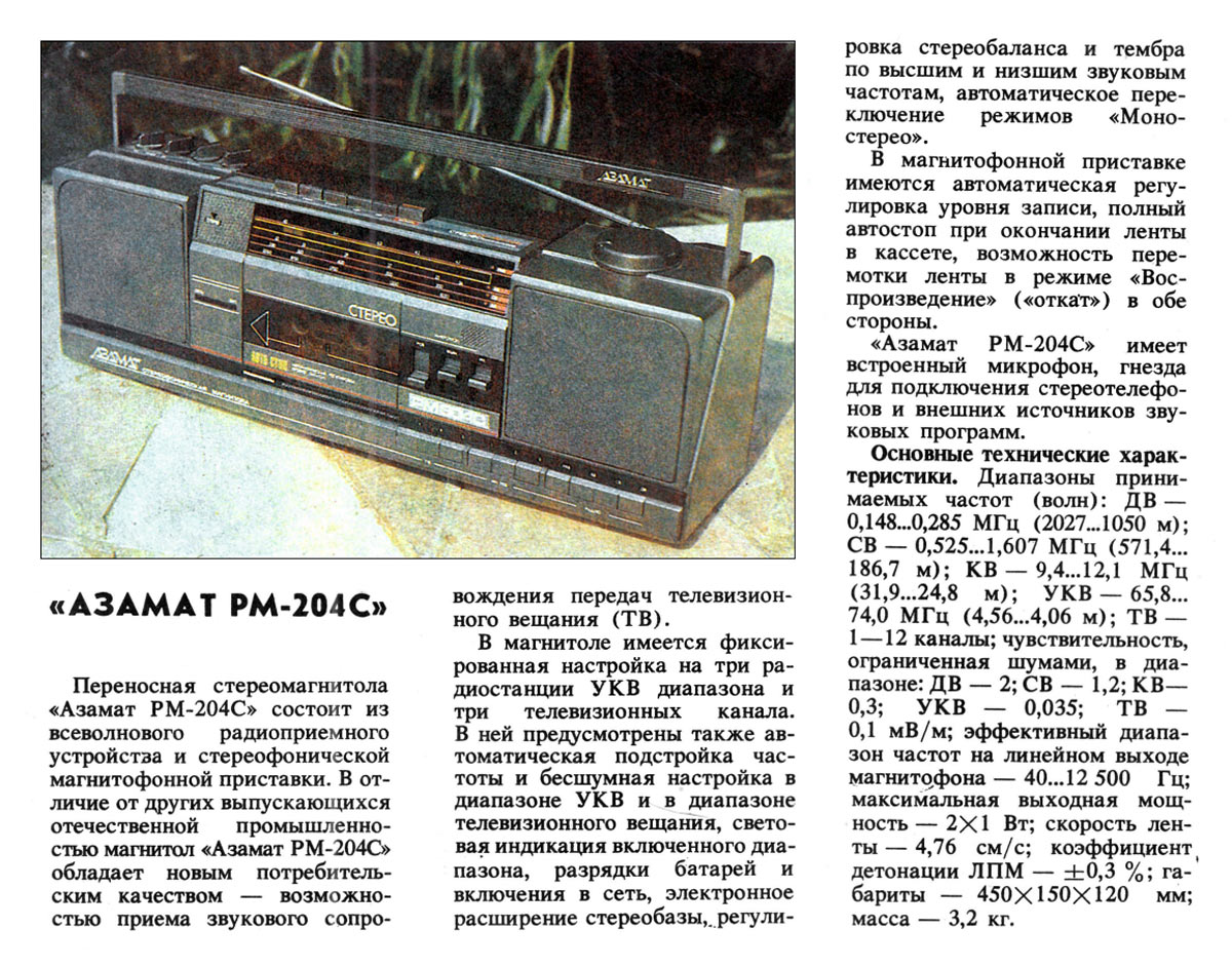 Переносная стереофоническая магнитола *Азамат РМ-204С* подготовлена к выпуску с 1991 года Чебоксарским приборостроительным заводом. Магнитола состоит из приёмника и стереофонической магнитофонной приставки. Магнитола принимает и звуковое сопровождение ТВ вещания. В магнитоле имеются: фиксированная настройка на три радиостанции УКВ-ЧМ диапазона и три телевизионных канала; автоматическая подстройка частоты и бесшумная настройка в диапазоне УКВ и в диапазоне телевизионного вещания; световая индикация диапазона, разрядки батарей и включения в сеть; электронное расширение стереобазы; регулировка стереобаланса и тембра ВЧ и НЧ; автоматическое переключение моно-стерео. В МП предусмотрен АРУЗ, полный автостоп при окончании ленты, возможность перемотки ленты в режиме воспроизведения (откат) в обе стороны. Магнитола имеет электретный микрофон, разьёмы для подключения стереотелефонов и внешних источников сигнала. Диапазоны частот: ДВ 148...285 кГц, СВ 525...1607 кГц, KB 9,4...12,1 мГц, УКВ 65,8...74,0 мГц, ТВ с 1 по 12 каналы. Чувствительность в диапазоне ДВ - 2, СВ - 1,2, KB - 0,3, УКВ - 0,035, ТВ - 0,1 мВ/м. Диапазон звуковых частот на ЛВ при работе МП и приёме в диапазоне УКВ и ТВ - 40...12500 Гц. Номинальная выходная мощность 2х0,5, максимальная 2х1 Вт. Коэффициент детонации ±0,3%. Габариты модели 450х150х120 мм. Вес 3,2 кг. В серию магнитола по каким-то причинам не пошла, было выпущено всего 10 экземпляров.