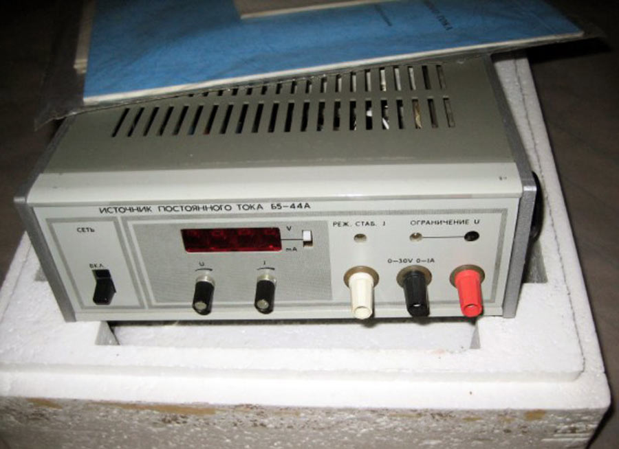 Источник питания стабилизированный *Б5-44А* выпускался с 1990 года. Источник питания *Б5-44А* применяется для стабилизации постоянного тока или напряжения (зависит от установленного режима). Переключение между режимами в ИП происходит автоматически, без вмешательства пользователя. На лицевой панели источника питания под шлиц выведен потенциометр, посредством которого устанавливается ограничение выходного напряжения. В ИП также реализована установка выходного напряжения и тока внешним аналоговым напряжением отрицательной полярности. Стабилизация напряжений и токов на выходе в источнике питания осуществляется линейным регулятором. Установка напряжения или тока осуществляется с фронтальной панели двухоборотным потенциометром и контролируется встроенным цифровым вольтметром.