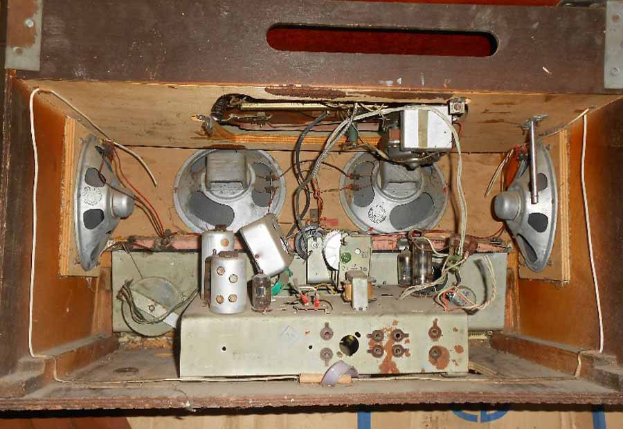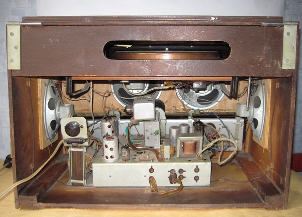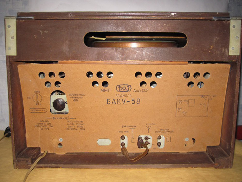Радиолы сетевые ламповые *Баку-58* и *Баку-58М* с 1958 и 1961 года выпускалась на Бакинскои радиозаводе. Радиола *Баку-58* представляет собой 7 ламповый комбинированный АМ-ЧМ супергетеродин с универсальным ЭПУ. Она предназначена для приёма радиостанций и проигрывания грампластинок. Модель имеет УКВ диполь, переключатель диапазонов клавишного типа, оптический индикатор настройки, автоматическую регулировку усиления, раздельную регулировку тембра по НЧ и ВЧ, регулировку полосы пропускания ПЧ и широкополосную АС. При приёме ЧМ радиола позволяет получить высокое качество звучания. АС состоит из четырёх громкоговорителей: двух широкополосных 2ГДЗ и двух высокочастотных 1ГД9 расположенных на боковых стенках футляра. ЭПУ типа ЭПУ-1П имеет электродвигатель асинхронного типа с двухскоростным приводом, с полуавтоматическим включением и автоматическим выключением, пьезоэлектрический звукосниматель. Питание радиолы осуществляется от сети переменного тока с напряжением 110, 127 или 220 в. Радиола оформлена в футляре отделанном ценными породами дерева. Шкала имеет градуировку в метрах. На ДВ, СВ диапазонах на шкале нанесены названия городов с мощными станциями. Применены лампы: 6НЗП УВЧ, преобразователь и гетеродин УКВ диапазона, 6И1П УПЧ УКВ диапазона, гетеродин и преобразователь на диапазонах АМ. 6К4П УПЧ АМ сигналов. 6Х2П детектор AM, ЧМ сигналов. 6Н2H предусилитель НЧ. 6П14П оконечный УНЧ. 6Е5С индикатор настройки. В радиоле имеются гнёзда наружной антенны и заземления, наружной (или внутренней) УКВ антенны, внешнего громкоговорителя и звукоснимателя. Диапазоны: ДВ, СВ, KB-2 - 3,9...7,6 мГц. КВ-1 - 8,2...12,4 мГц. УКВ - 64...73 мГц. ПЧ: по AM тракту 465 кГц, ЧМ 8,4 мГц. Чувствительность в: АМ 200 мкВ, ЧМ 20 мкВ. Избирательность в АМ 30 дБ, ЧМ 26 дБ. Номинальная выходная мощность 2 Вт. При приёме полоса частот: в АМ 100...4000 гц, ЧМ 100...7000 гц, при работе ЭПУ 100...5000 гц. Потребляемая мощность при приёме 60 Вт, при работе ЭПУ 75 Вт. Габариты радиолы 570х370х370 мм. Вес 22 кг. В 1961 году радиола **Баку-58** модернизирована в **Баку-58М**. Кроме изменений некоторых номиналов в схеме и внешнего вида, других изменений нет.