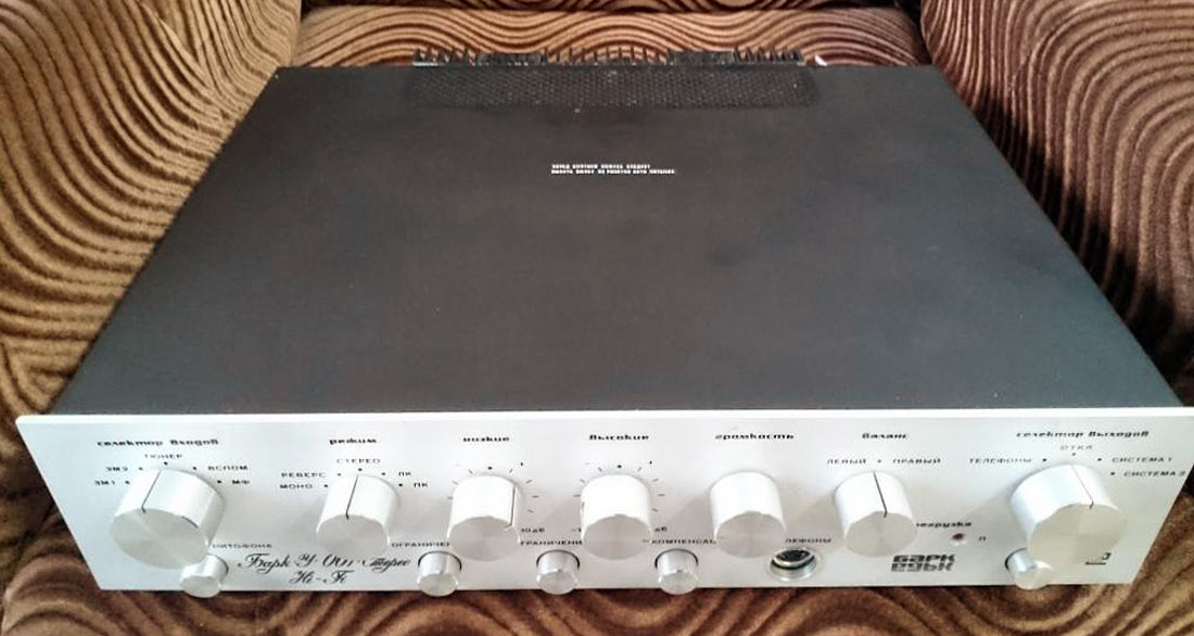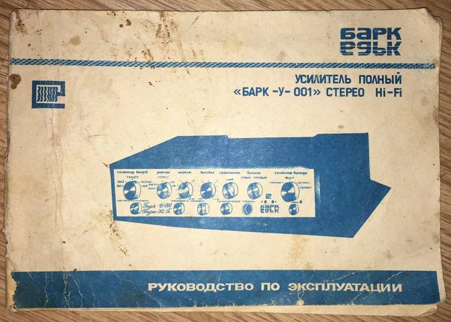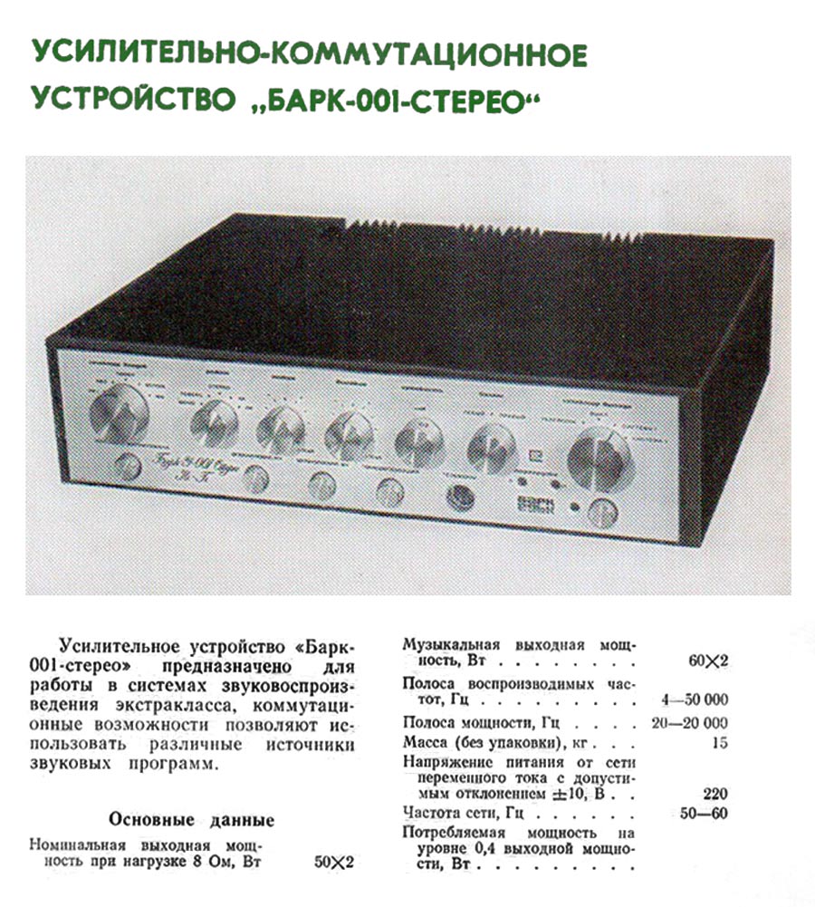Усилительно-коммутационное устройство (УКУ) *Барк-001-стерео* с I-кв 1985 года выпускал Новокаховский ПСЗ *Сокол*. УКУ является аналогом УКУ *Бриг-001-стерео, выпускаемого ещё с 1975 года и предназначено для высококачественного усиления звуковых фонограмм. В УКУ имеется ступенчатая регулировка громкости и тембра с возможность изменения АЧХ с помощью фильтров верхних и нижних звуковых частот, имеется система мягкого включения исключающая щелчки при включении и выключении усилителя, защита от короткого замыкания в нагрузке, световая индикация включения в электрическую сеть и перегрузки каналов усилителя. К УКУ можно одновременно подключить два комплекта АС или же стереофонические головные телефоны. УКУ отличает низкий уровень шума, малые интермодуляционные и гармонические искажения, высокая линейность фазовой и АЧХ. Номинальная выходная мощность- 2х50 Вт. Диапазон воспроизводимых частот звука - 20...25000 Гц. Коэффициент гармоник - 0,1%. КНИ - 0,15%. Разделение стереофонических каналов на частоте 1000 Гц - 50 дБ. Отношение сигнал/взвешенный шум для ЛВ 86 дБ. Потребляемая от сети мощность 150 Вт. Габариты УКУ - 452х372х118 мм. Масса 15 кг.