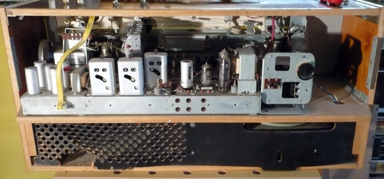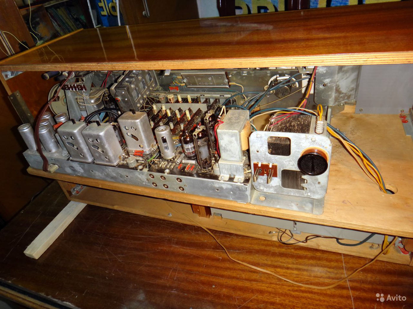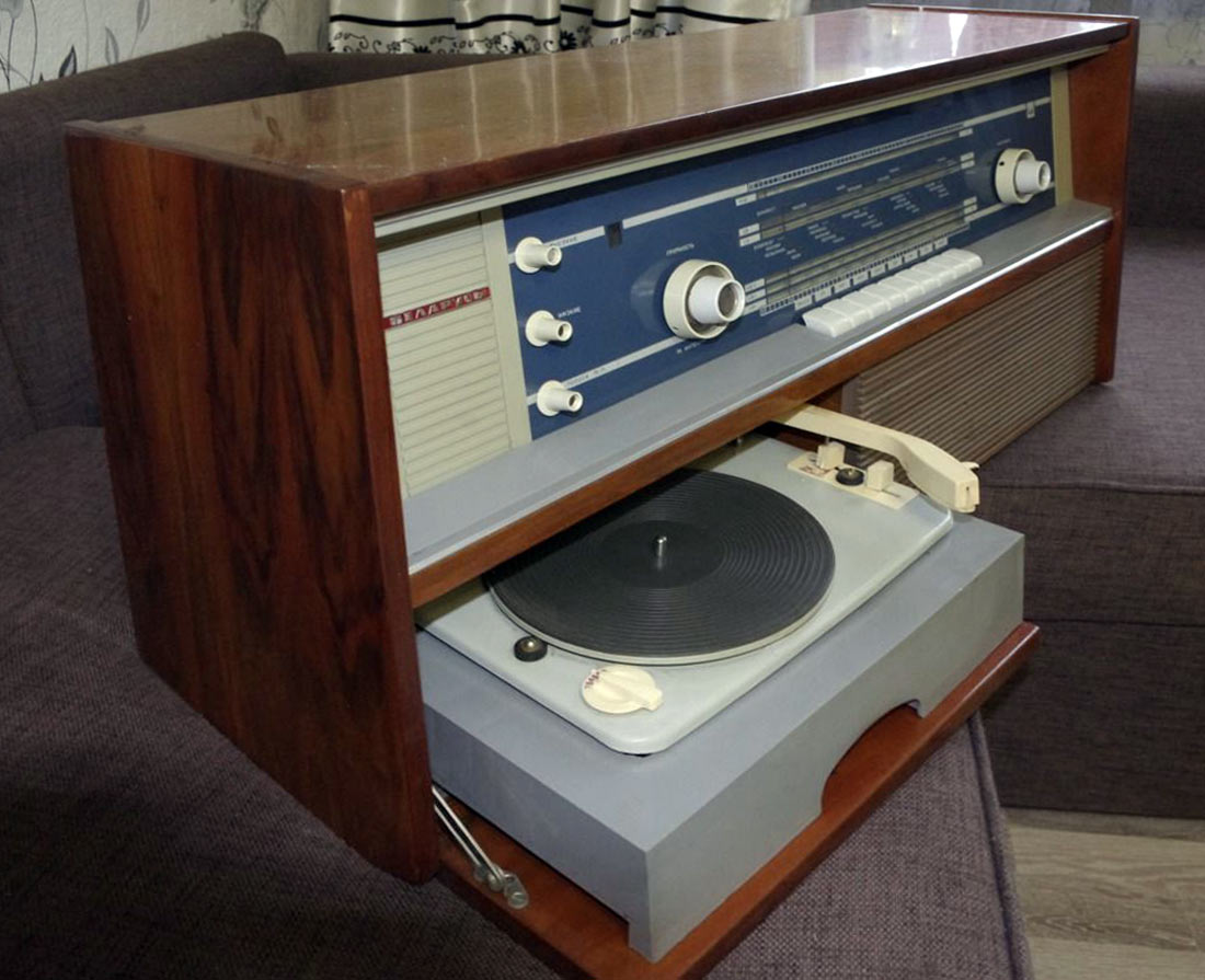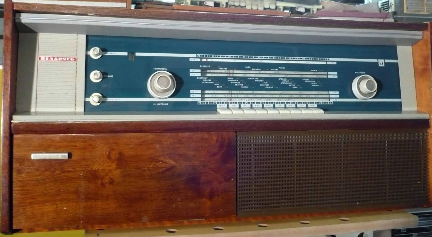 Радиола сетевая ламповая *Беларусь-103Л* с 1968 года выпускалась на Минском радиозаводе. Радиола состоит из десятилампового приёмника первого класса рассчитанного на приём радиостанций в диапазоне ДВ 150...408 кГц, СВ 525...1605 кГц, КВ3 3,95...7,6 Мгц, KB2 9,3...9,8 Мгц, KB1 11,6...12,1 Мгц и УКВ 65,8...73 Мгц и трёхскоростного II-ЭПУ-15А, с автовыключателем и микролифтом. Чувствительность с внешней антенной в ДВ, СВ, КВ диапазонах 50 мкВ, в диапазоне УКВ-ЧМ 8 мкВ. Чувствительность с магнитной антенной в ДВ,СВ диапазонах 500 мкВ/м, в положении *местный приём* 0,7 мВ. Промежуточная частота тракта AM - 465 кГц а тракта ЧМ - 6,5 Мгц. Избирательность по соседнему каналу при расстройке на 10 кГц - 60 дБ. В ЧМ усредненная крутизна скатов резонансной характеристики 0,25 дб/кгц. Ширина полосы пропускания по ПЧ в АМ тракте в положении *узкая полоса* 4 кгц, *широкая полоса* 11 кгц, *местный приём* 14 кгц, в тракте ЧМ полоса пропускания 160 кГц. Система АРУ радиолы обеспечивает изменение сигнала на выходе на 10 дБ, при изменении сигнала входа на 60 дБ. Номинальная выходная мощность усилителя - 4 Вт, максимальная - 7 Вт, диапазон воспроизводимых частот 80...12500 Гц. Пределы регулировки тембра 12 дБ. Чувствительность усилителя с гнёзд магнитофона при номинальной выходной мощности 150 мВ, уровень фона -54 дБ. Акустическая система радиолы состоит из 3 громкоговорителей 2ГД-19. Питается радиола от сети переменного тока. Потребляемая от сети мощность 100 Вт. Размеры радиолы 790х380х355 мм, её масса 27 кг.