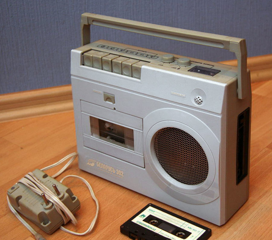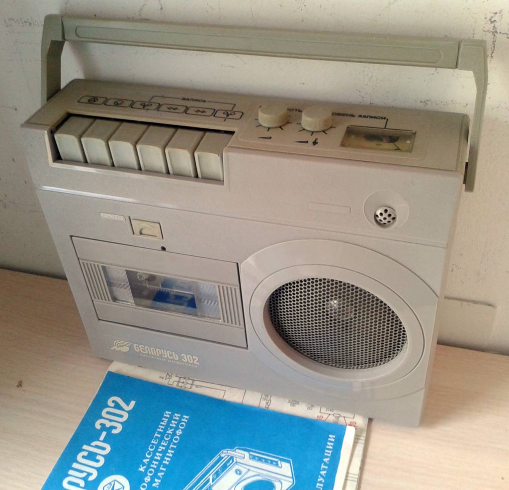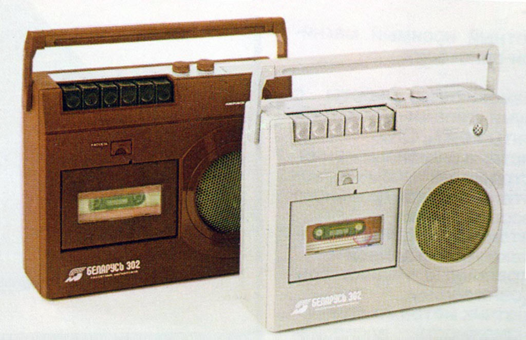 Портативный кассетный магнитофон *Беларусь-302* с начала 1988 года выпускал Могилёвский завод *Зенит*. Магнитофон 3-й группы сложности **Беларусь-302** имеет автоматическую и ручную регулировку уровня записи, стрелочный индикатор уровня записи, электретный микрофон, автостоп. Диапазон частот звука при записи и воспроизведения на ЛВ - 63...12500 Гц, воспроизводимых громкоговорителем - 120...10000 Гц. Номинальная выходная мощность 1 Вт. Питание от сети или от 6 элементов А-343. Габариты МГ - 260х267х85 мм. Масса 2,1 кг. В некоторых выпусках магнитофонов клавиши управления нажимались в двух плоскостях.