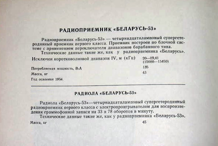 Радиола сетевая ламповая *Беларусь-53* с 1953 года выпускалась на Минском радиозаводе имени В.М.Молотова. Радиола упомянута в книге *Каталог радиоизделий* Минского ПО имени Ленина, в прошлом радиозавода имени Молотова. Нигде в справочниках и в интернете не удалось найти другого упоминания о модели и её фотографий. Видимо радиола была выпущена незначительной серией.