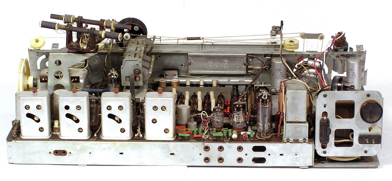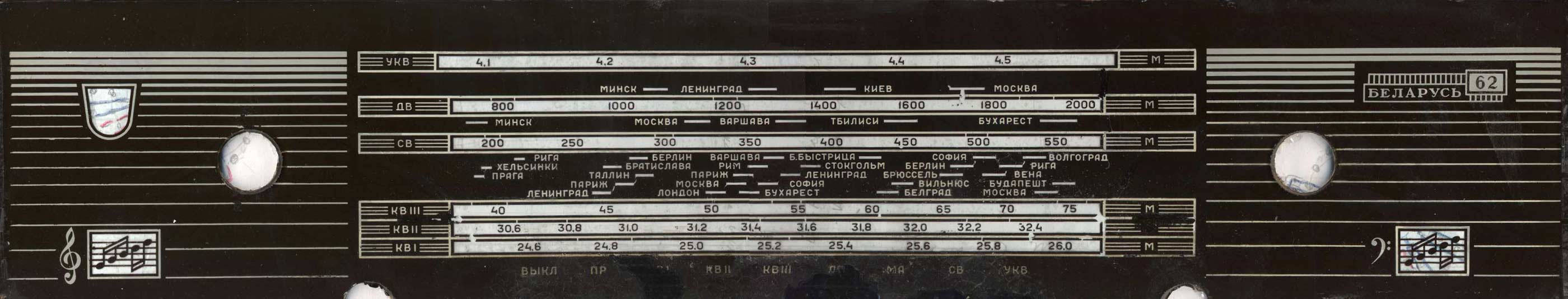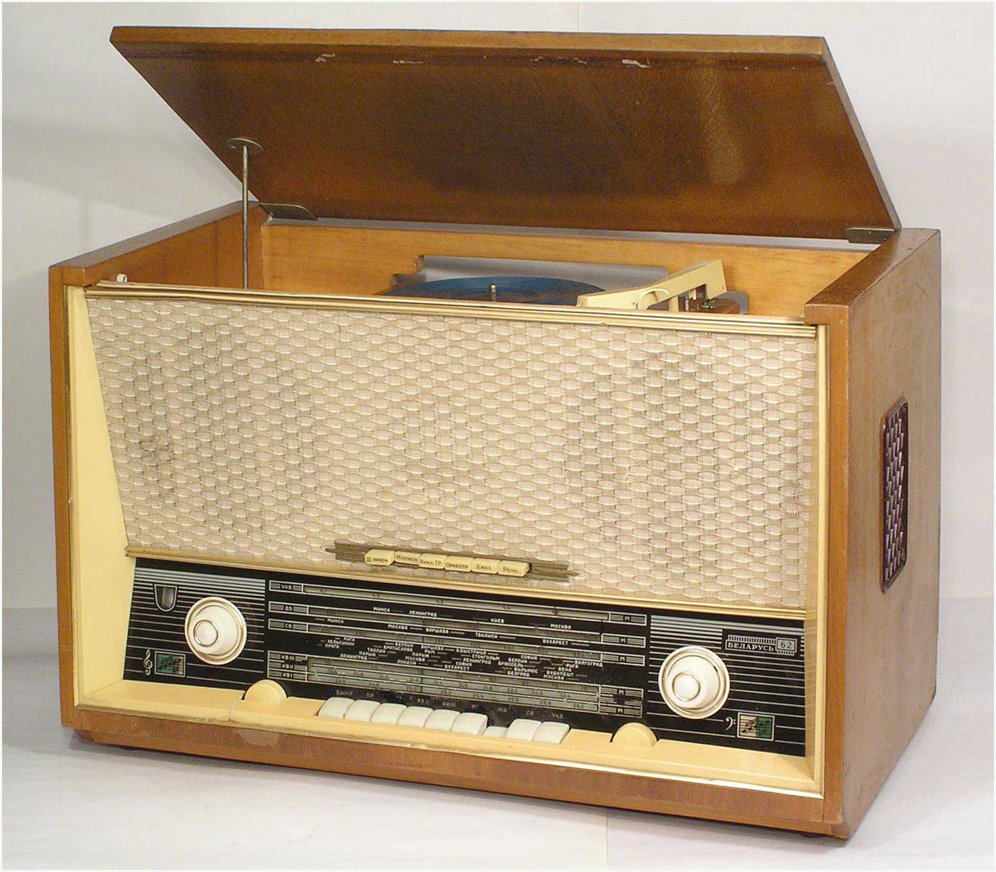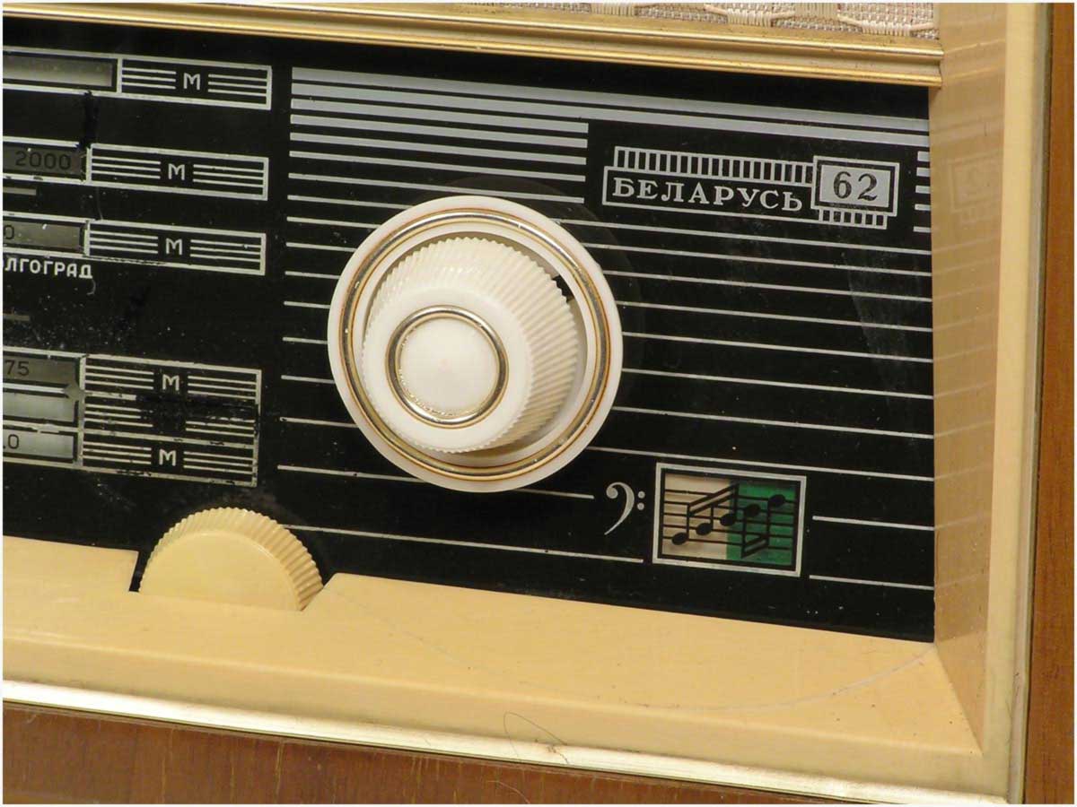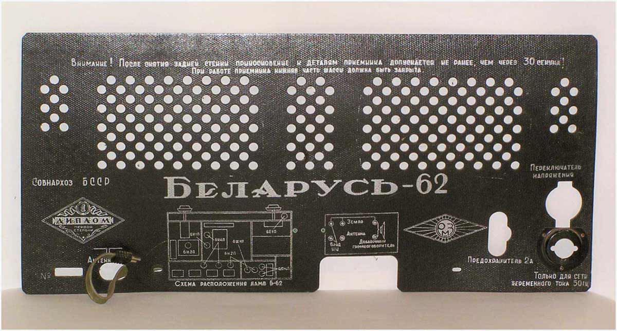 Радиола сетевая ламповая *Беларусь-62* с I-кв 1962 года выпускалась Минским радиозаводом. Радиола **Беларусь-62** состоит из одинадцатилампового приёмника 1-го класса и универсального электропроигрывающего устройства ЭПУ-4. В акустической системе радиолы установлено 5 громкоговорителей 4ГД-7 (2), 1ГД-18 (2) и 3ГД-15 (1). В диапазонах ДВ, СВ применены магнитные антенны, в диапазоне УКВ внутренний диполь. Усилитель НЧ двухтактный с регуляторами тембра, тремя тонрегистрами и тонкомпенсацией. ПЧ усилитель комбинированный, в АМ 465 кГц, ЧМ 8,4 МГц. Диапазоны ДВ 150...408 кГц, СВ 520...1605 кГц, КВ-1 11,6...12,1 мГц, КВ-2 9,3...9,8 мГц, КВ-3 4...7,6 мГц, УКВ-ЧМ 64,5...73 мГц. Чувствительность на ДВ, СВ, КВ 100 мкВ, УКВ 10 мкВ. Селективность в ДВ, СВ 60 дБ. Номинальная выходная мощность 4, максимальная 7 Вт. Полоса воспроизводимых частот в АМ тракте 80...4000 Гц, ЧМ тракте и при проигрывании пластинок 80...12000 Гц. Потребляемая мощность 75/90 Вт. Габариты модели 650х400х350 мм. Вес 24 кг.