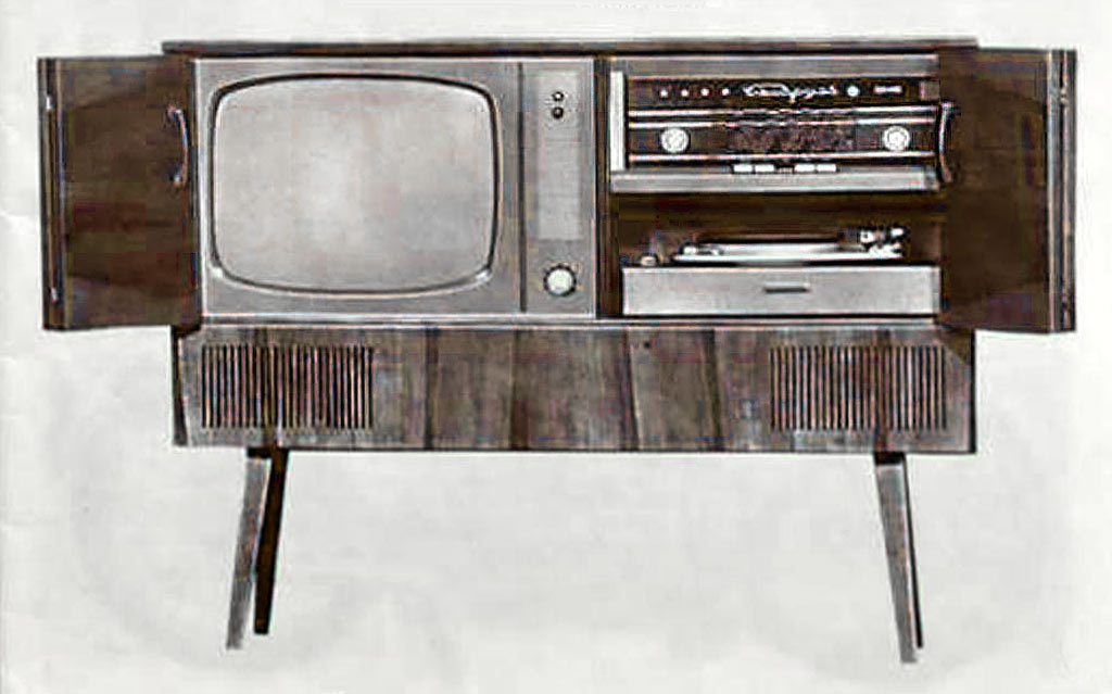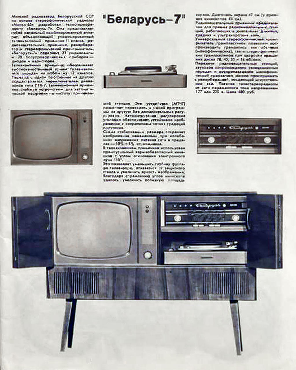 Телерадиолу *Беларусь-7* с осени 1964 года планировал выпускать Минский радиозавод имени В.И.Ленина. Телерадиола *Беларусь-7* создана на базе стереофонической радиолы *Минск-63* и телевизора УНТ-47. Приёмник установки работает в диапазонах длинных, средних и ультракоротких волн. Чувствительность телерадиолы при приёме телевизионных программ 50 мкВ, радиостанций в AM - 200 мкВ, в ЧМ - 30 мкВ. Селективность в тракте АМ - 26 дБ. Номинальная выходная мощность 2х1 Вт. Диапазон воспроизводимых звуковых частот при прослушивании грамзаписи - 80...10000 Гц, при приёме УКВ-ЧМ станций - 120...7000 Гц, при приёме АМ станций - 120...3550 Гц. Акустическая система модели состоит из четырёх громкоговорителей, двух фронтальных и двух боковых. Питается телерадиола от сети переменного тока с напряжением 220 или 127 В, потребляя мощность 180 Вт при приёме ТВ программ, 80 Вт при радиоприёме и 100 Вт при работе ЭПУ. Универсальный трёхскоростной ЭПУ проигрывает моно и стереофонические грампластинки любых форматов. Звуковое сопровождение телепрограмм, радиовещания и грамзаписи можно прослушивать и с реверберацией. Телерадиола серийно не выпускалась. Было выпущено несколько экземпляров для демонстрационных выставок, организована рекламная компания, но дальше почему-то не пошло. Слева реклама установки в журнале *Новые Товары* № 9 за 1965 год.