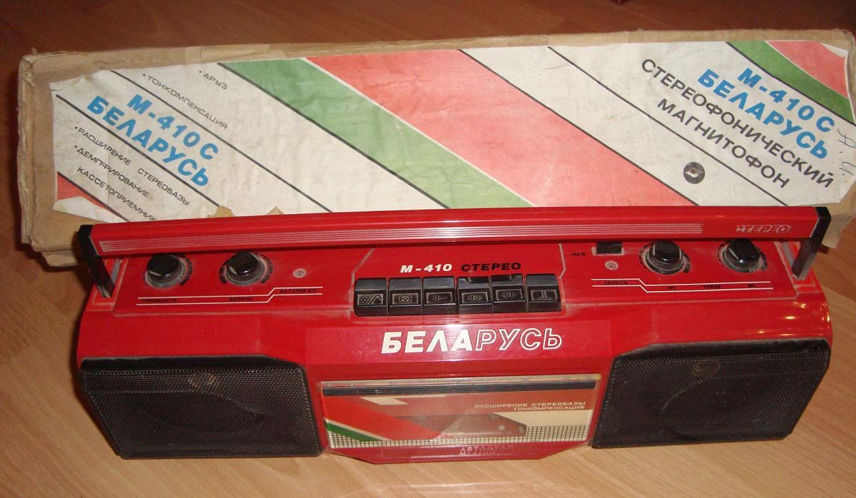 Стереофонический магнитофон *Беларусь М-410С* с 1988 года выпускал Могилёвский завод *Зенит*. Магнитофон предназначен для записи и воспроизведения фонограмм на магнитной ленте в кассетах МК. Питание осуществляется от электрической сети через внешний блок питания или от 6 элементов А-373. Скорость протяжки магнитной ленты 4,76 см/сек. Коэффициент детонации ±0,35%. Диапазон рабочих частот на ЛВ - 63...12500 Гц. Относительный уровень помех в канале З/В -44 дБ. Коэффициент гармоник в канале З/В на ЛВ - 3,5%. Номинальная выходная мощность 2х1 Вт. Габариты магнитофона - 421x135x106 мм. Масса - 2,1 кг.