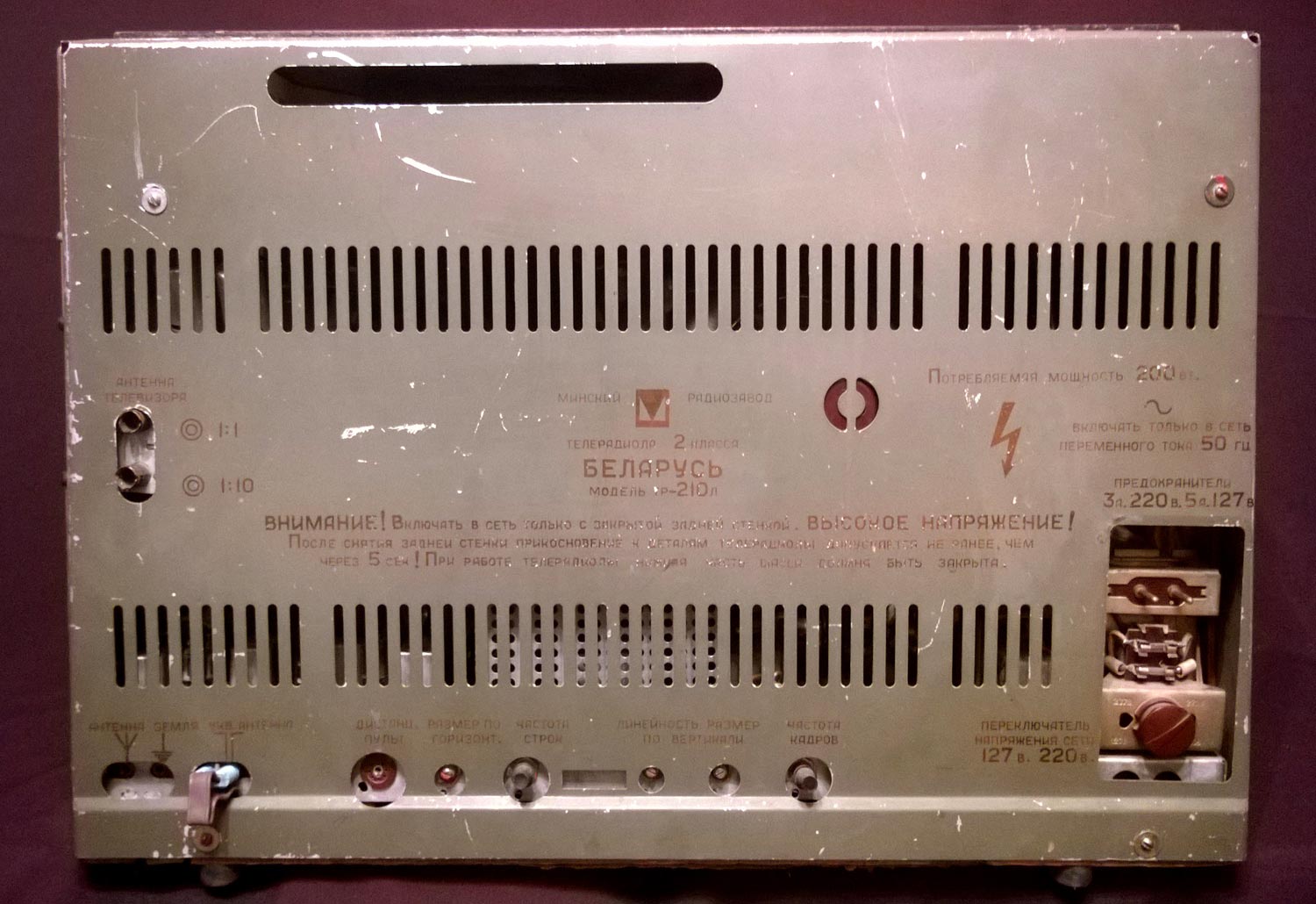 Телерадиола *Беларусь ТР-210Л* с 1966 года выпускалась Минским радиозаводом. Производилась на базе телерадиолы **Беларусь-110**, но в новом оформлении. Предназначена для приёма телепередач на любом из 12 каналов, радиостанций в диапазонах ДВ, СВ, КВ, УКВ и воспроизведения грамзаписи. Аппарат содержит 20 радиоламп и 15 диодов. В телевизоре используется кинескоп 43ЛК9Б с размером изображения 360х270 мм. Размер изображения стабилизирован схемами и не меняется при изменении напряжения в сети на 10%. Чувствительность телерадиолы на каналах изображения или звукового сопровождения 100 мкВ. ПЧ канала изображения 38,0 Мгц. Первая ПЧ канала звукового сопровождения 31,5, вторая 6,5 Мгц. Разрешающая способность 450 линий. Проводной пульт ДУ позволяет регулировать яркость и громкость на расстоянии до 4 метров. Приёмник имеет диапазоны: ДВ, СВ, КВ 5,8...12,2 Мгц, УКВ 65,8...73 Мгц. ПЧ для АМ диапазонов 465 КГц, ЧМ 6,5 Мгц. Чувствительность в АМ диапазонах 250 мкВ, ЧМ 30 мкВ. ЭПУ позволяет воспроизводить грамзапись с обычных и долгоиграющих пластинок на скорости 78, 45 и 33 об/мин. УНЧ имеет номинальную выходную мощность 1,5 Вт. Полоса воспроизводимых частот 100...10000 Гц. В футляре тлр установлено два громкоговорителя 1ГД-18 (1ГД-19). Потребляемая мощность ТВ 200, приёмника или ЭПУ 75 Вт. Телерадиолу выпускали в настольном и напольном оформлениях.