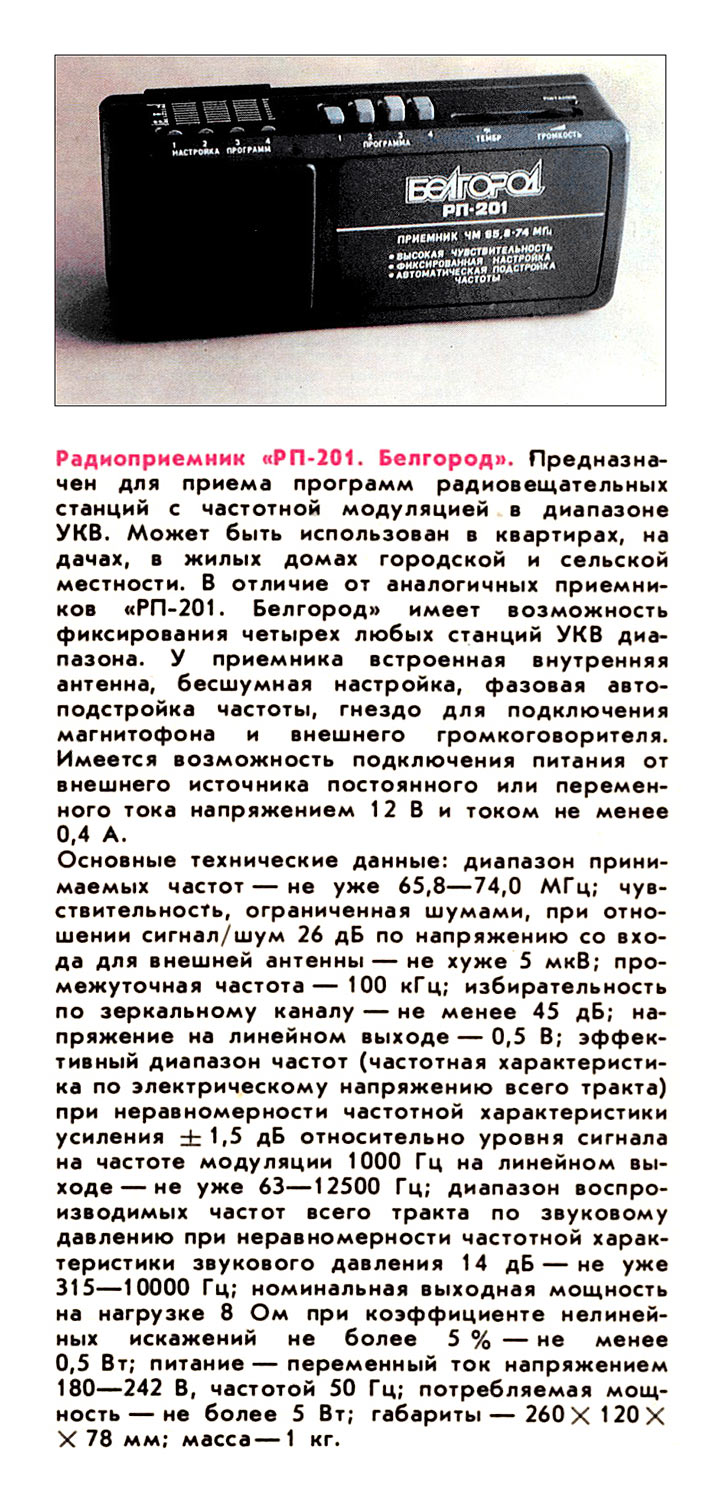 УКВ радиоприёмник *Белгород РП-201* выпускался с 1993 года Белгородским заводом *Сокол* (ЗАО *АТС-Сокол*). Радиоприёмник работает в диапазоне 65...74 МГц на наружную антенну. Настройка фиксированная на четыре заранее настроенные радиовещательные станции. Любую из настроек можно использовать как плавную. Предположительно с 1996 года завод выпускал модернизированный радиоприёмник *Белгород РП-201м* для работы в диапазонах 65...74 и 88...108 МГц. Количество фиксированных настроек в каждом диапазоне при этом сократилось до трёх. Информация о модели *Белгород РП-201* в рекламном проспекте.