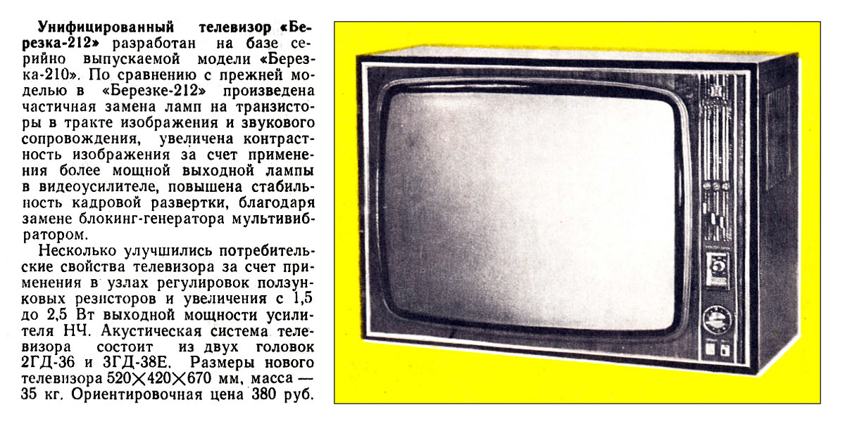 Телевизионный приёмник чёрно-белого изображения *Берёзка-212* с 1974 года выпускал Харьковский завод *Коммунар*. Унифицированный телевизор второго класса **Берёзка-212** выпускался в настольном и напольном вариантах. Корпус телевизора отделан ценными породами дерева и пластмассой. Сзади аппарат закрыт стенкой из пластмассы. На передней панели находятся основные ручки управления ползункового типа: ручки контрастности, яркости и громкости, ручка настройки гетеродина ДМВ, переключатель МВ/ДМВ, переключатель МВ каналов, кнопки включения и выключения. Телевизор работает в любом из 12-ти каналов диапазона МВ. В нём имеется возможность приёма и в ДМВ диапазоне после установке блока СКД-1. В модели имеется АПЧ и Ф, ключевая АРУ. Акустическая система с двумя громкоговорителями 3ГД-38Е и 2ГД-36, регуляторы тембра по ВЧ и по НЧ. Имеются гнёзда для записи звука на магнитофон и прослушивание его на головные телефоны, при отключенных динамиках. Возможно управление громкостью и яркостью на расстоянии с помощью проводного ПДУ. Чувствительность телевизора 50 мкВ. Разрешающая способность аппарата по вертикали 500 линий, по горизонтали 450 линий. Максимальная выходная мощность канала звукового сопровождения - 2,5 Вт. Диапазон воспроизводимых частот - 100...10000 Гц. Потребляемая от электрической сети мощность - 180 Вт. Габариты телевизора - 685 х 525 х 420 мм. Масса 36 кг. Розничная цена модели 296 руб.